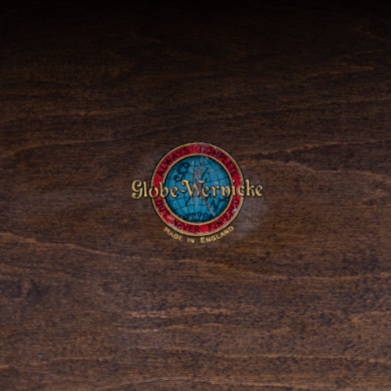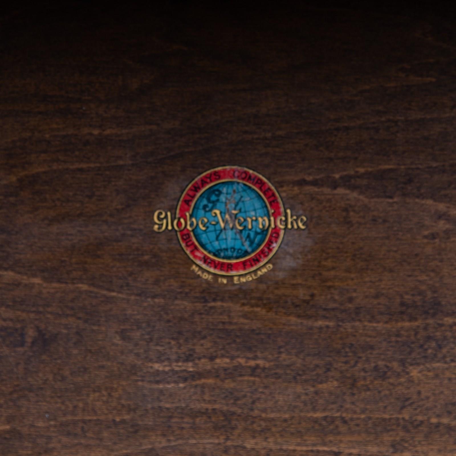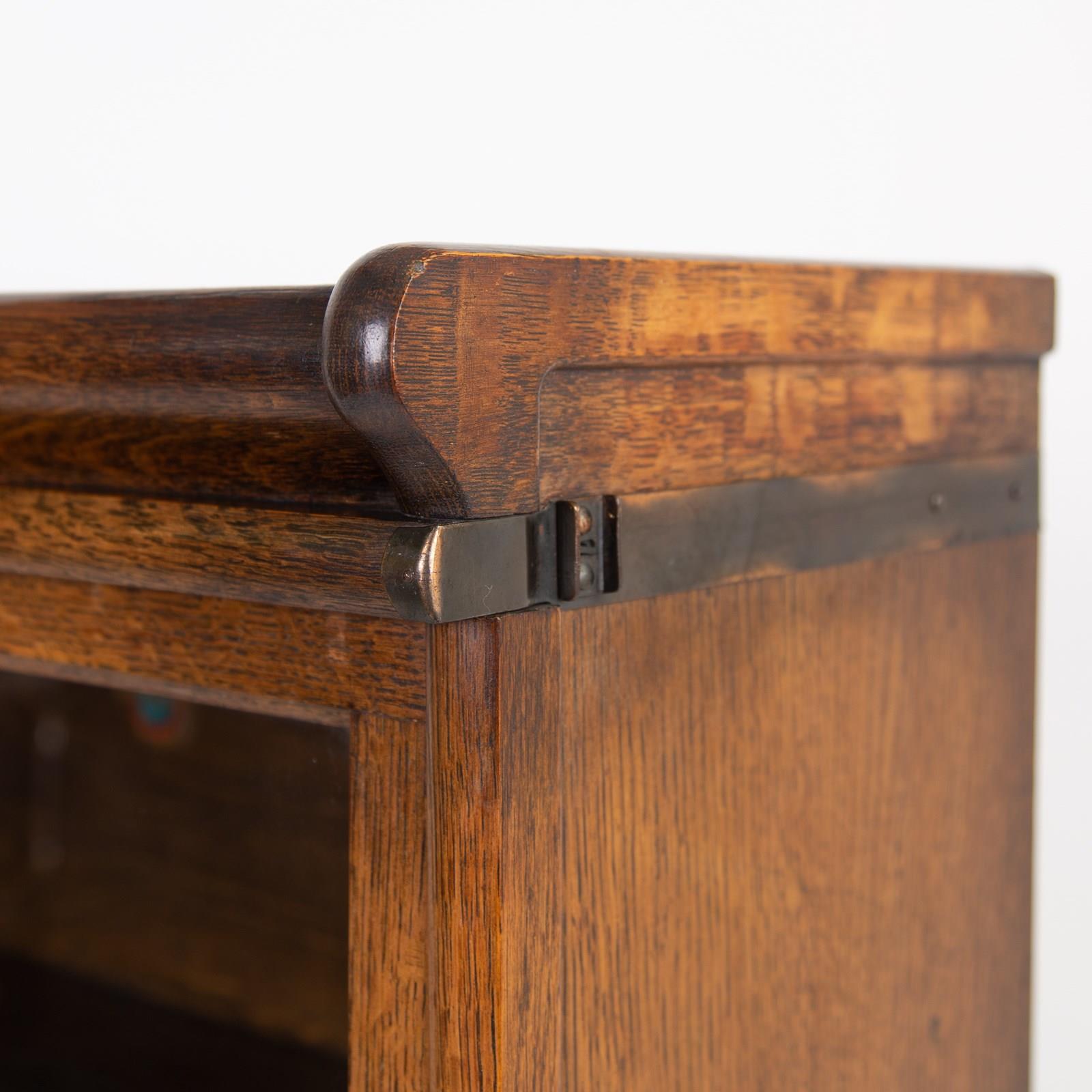This Globe Wernicke sits well and survives in good order with sensible aging. All the glass is crack free, the little brass knobs are in place as are the original handles for the little drawer. We have carefully cleaned the piece and lubricated the door opening mechanisms so it's all good to go. Expect a good piece with historic aging. It breaks down for easier placing.