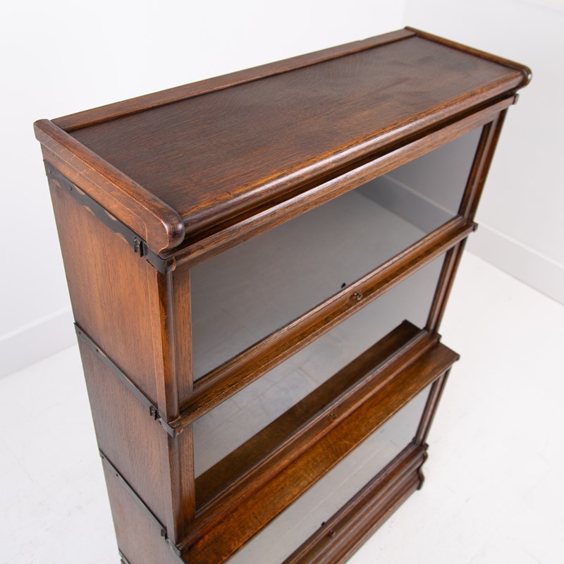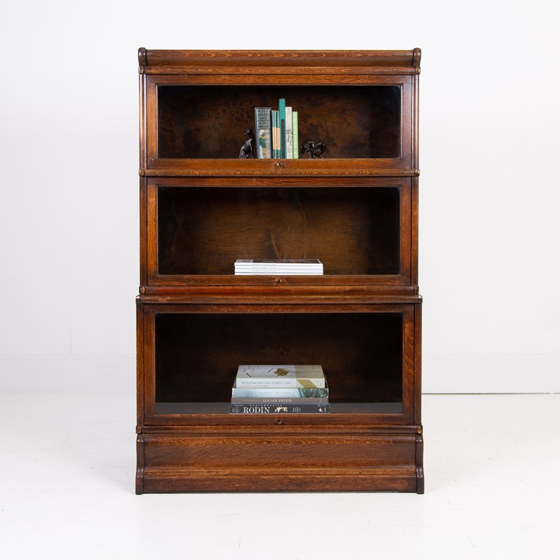 A handsome oak Globe Wernicke barristers bookcase of 3 large glazed sections alongside an oak base and oak top all in a pleasing shade of oak with light day to day wear.