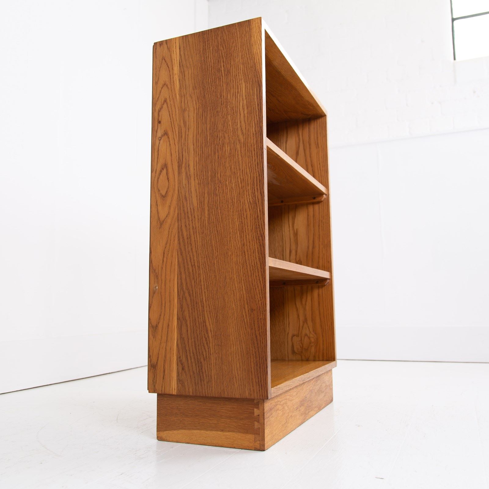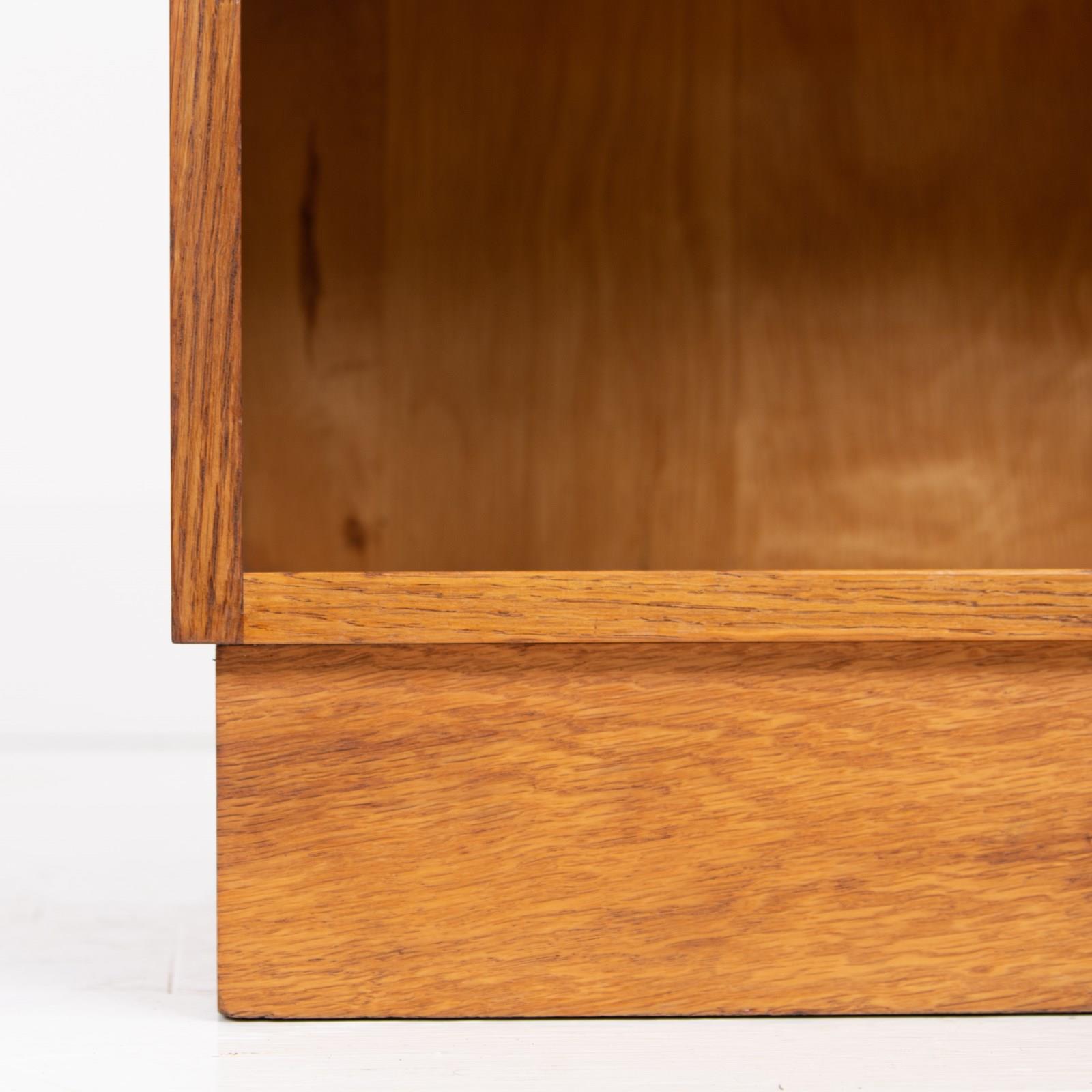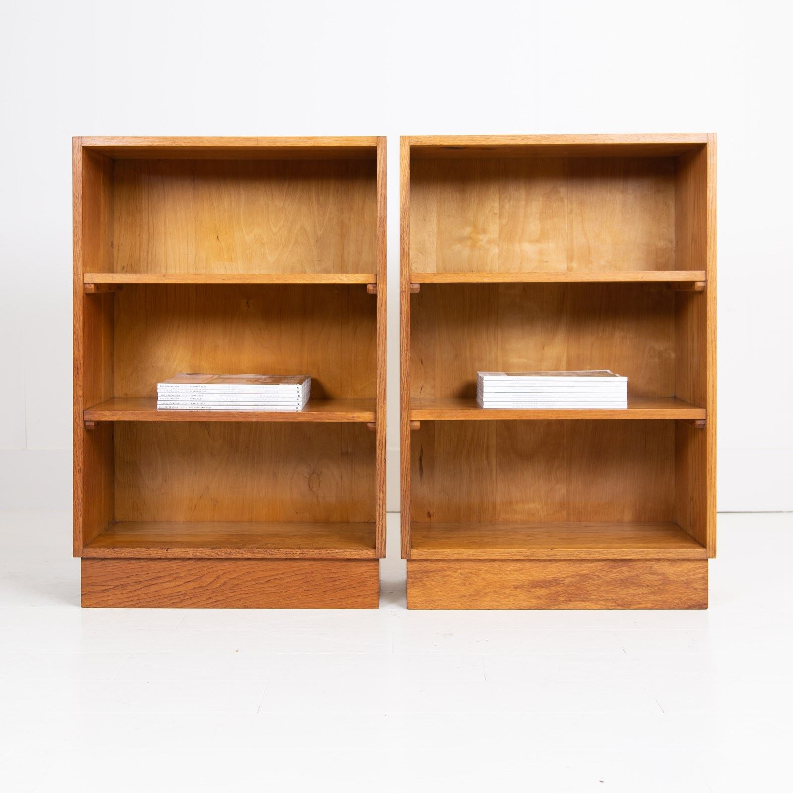 Great looking and slightly military issue in appearance pair of matching oak bookcases C1950. Liking the look of these modernist designed bookcases with the finger joints in the oak at the top, mimicked in the inverted bases - they possess a simple and effortless look.