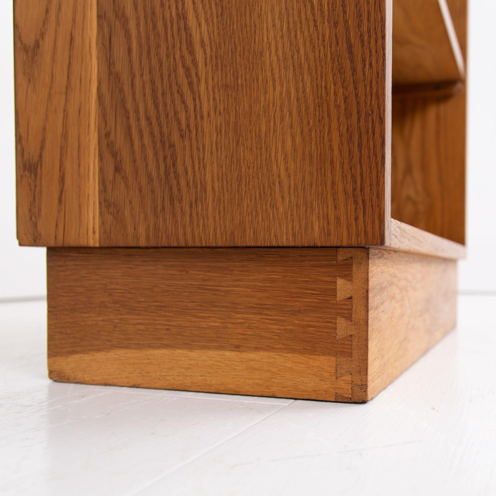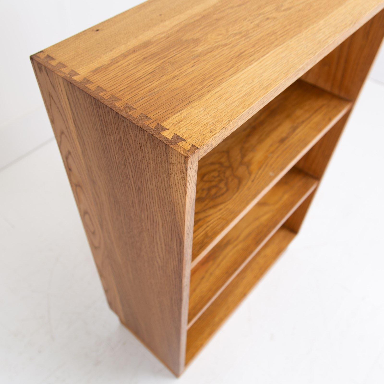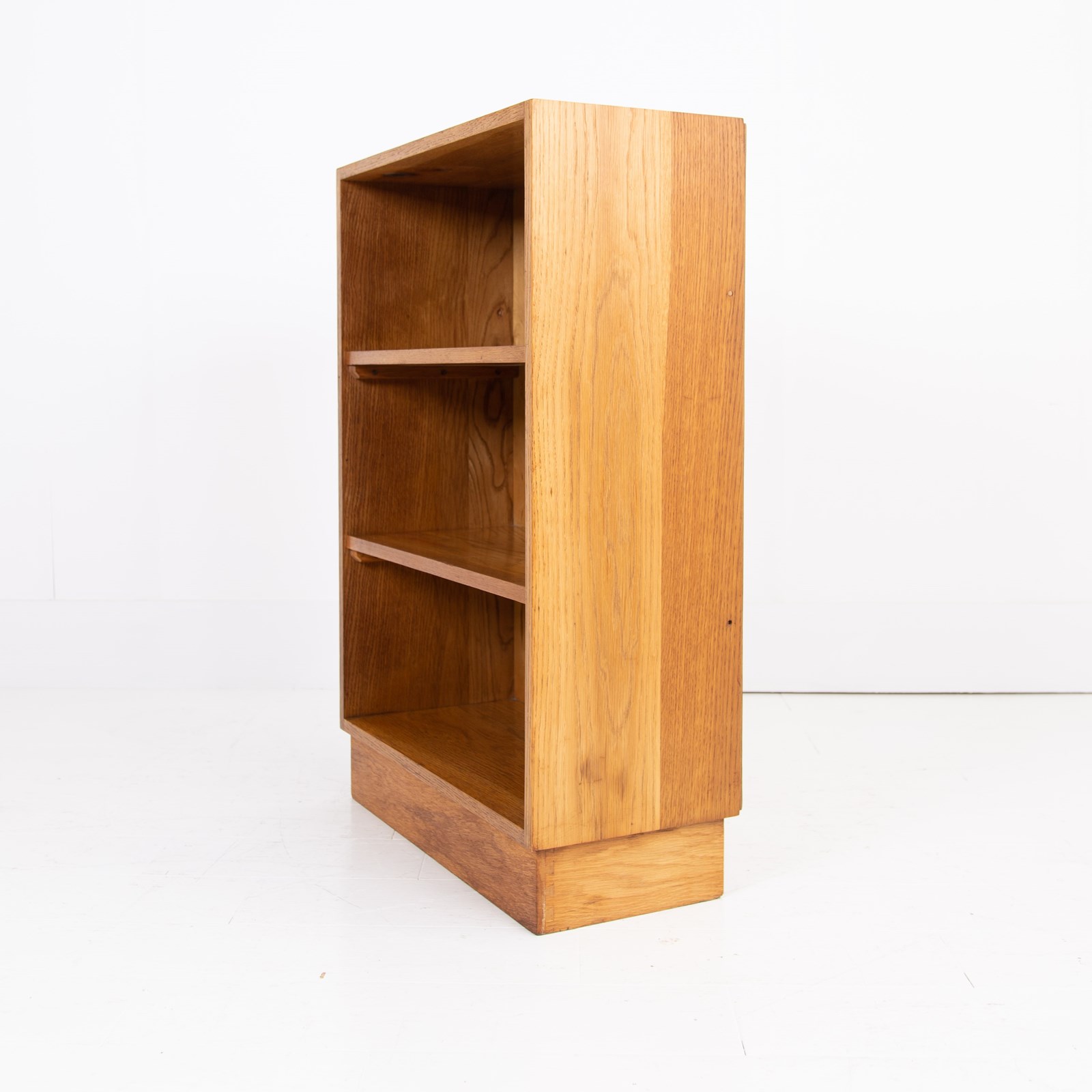 Great looking and slightly military issue in appearance pair of matching oak bookcases C1950. Liking the look of these modernist designed bookcases with the finger joints in the oak at the top, mimicked in the inverted bases - they possess a simple and effortless look.
