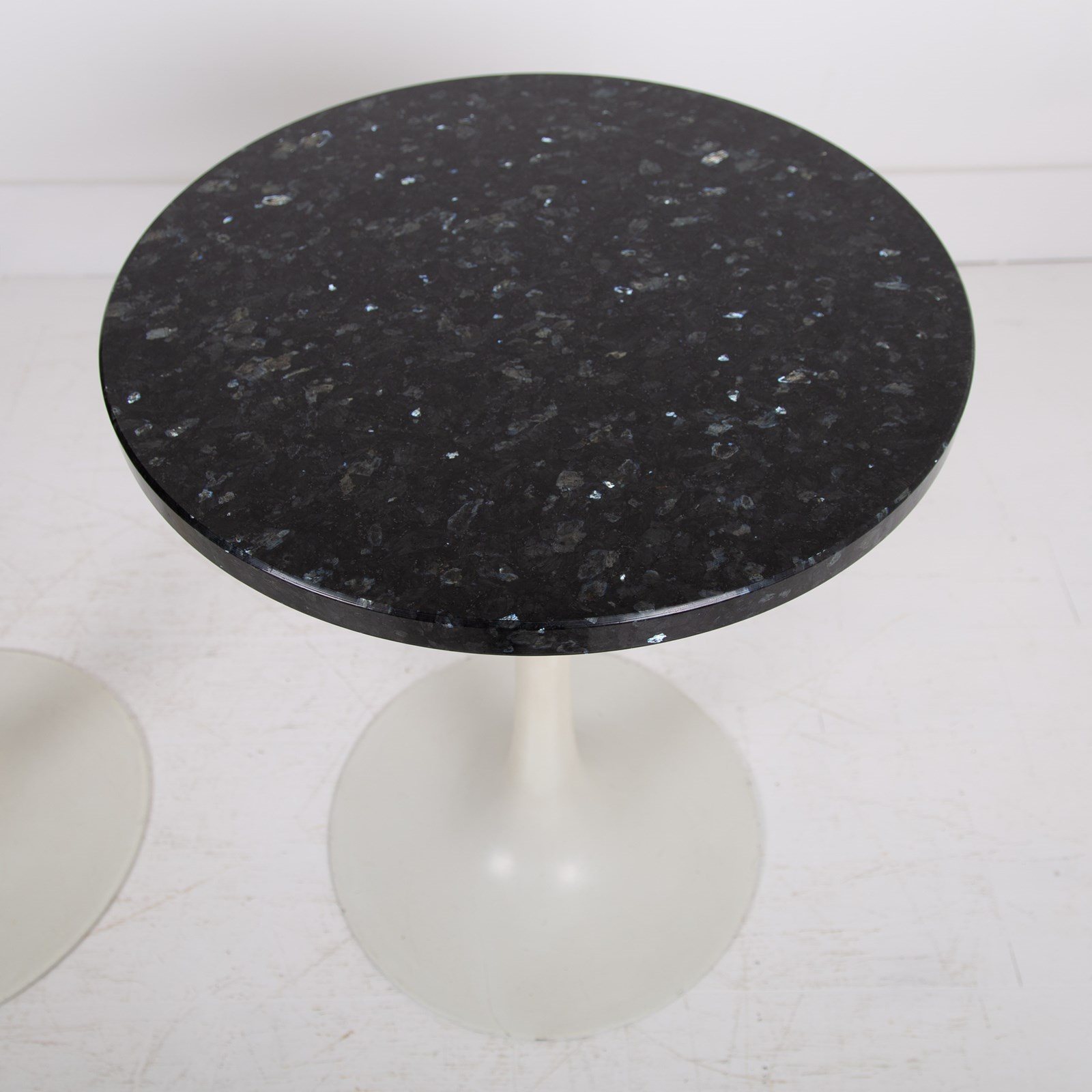 We have a well sized matching pair of mid century tulip shaped bases with marble tops which would work well as side tables. Both bases are stamped Arkana 22 denoting the maker and size underneath the bases and the black with blue mottled granite tops are a new addition and work well.