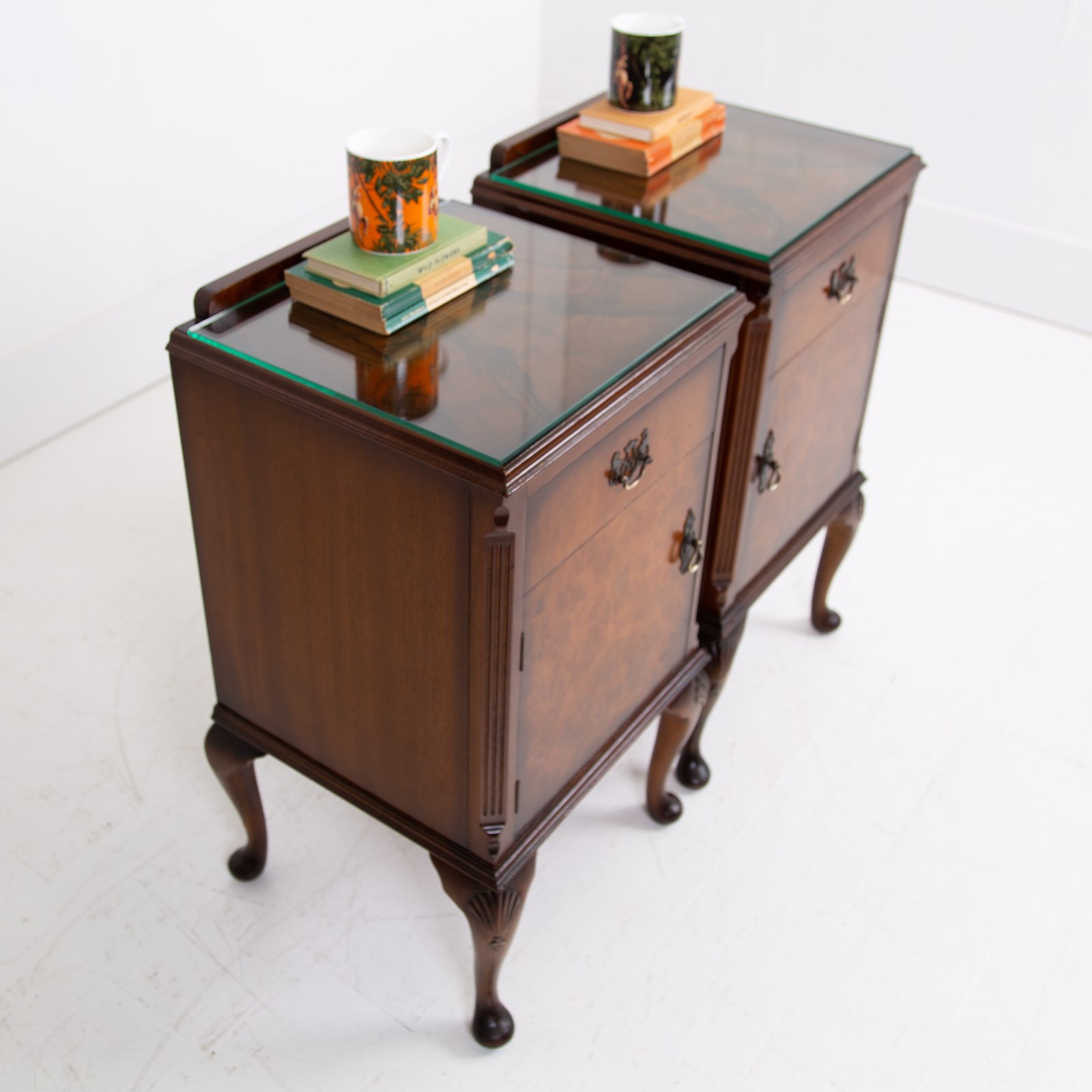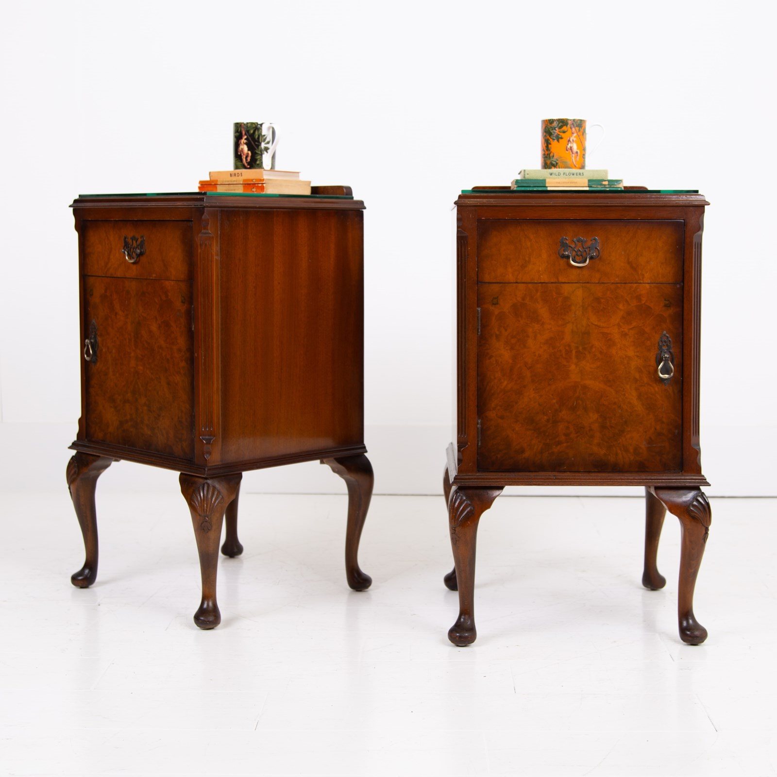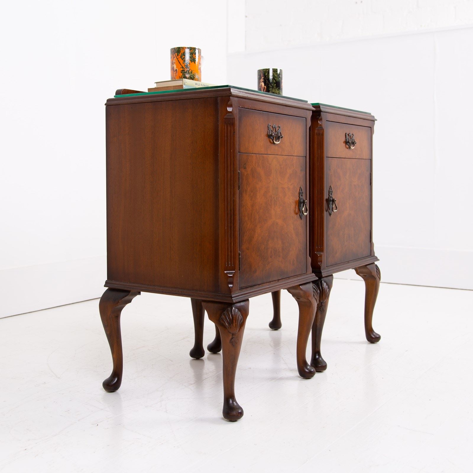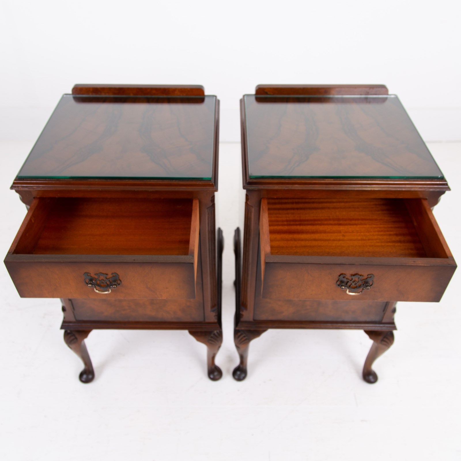 They are of good quality and are of a very useful size. The walnut is figured with interesting grain patterns and a lovely tone. They sit on short cabriole legs with shell carving at the knees to the front legs, the front edges are canted and they have raised back galleries. There is plenty of storage space inside the cabinets and drawers, which have lovely pierced brass handles. The tops have glass covers. Condition is good, expect light day to day use and marks.