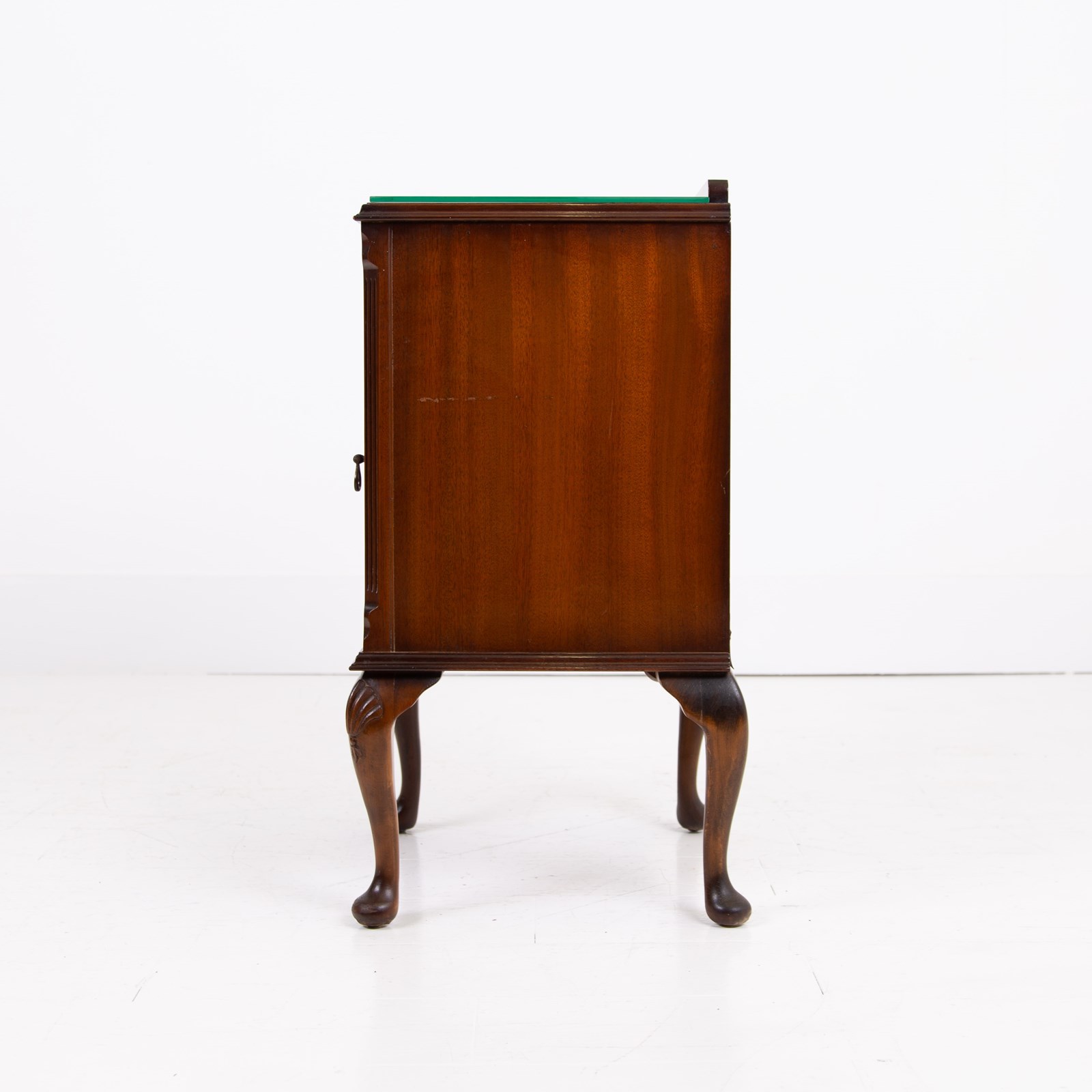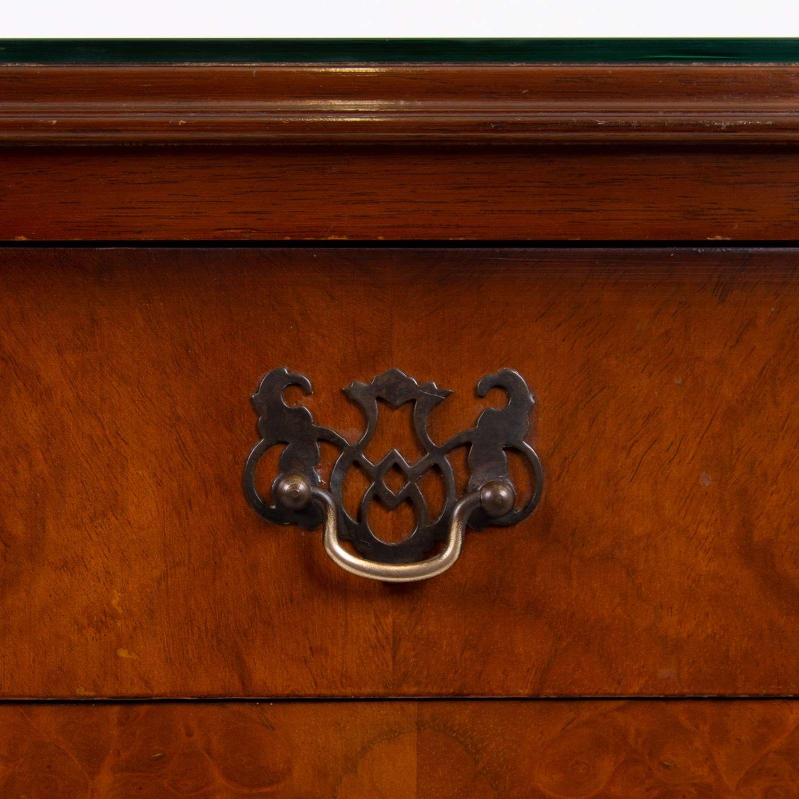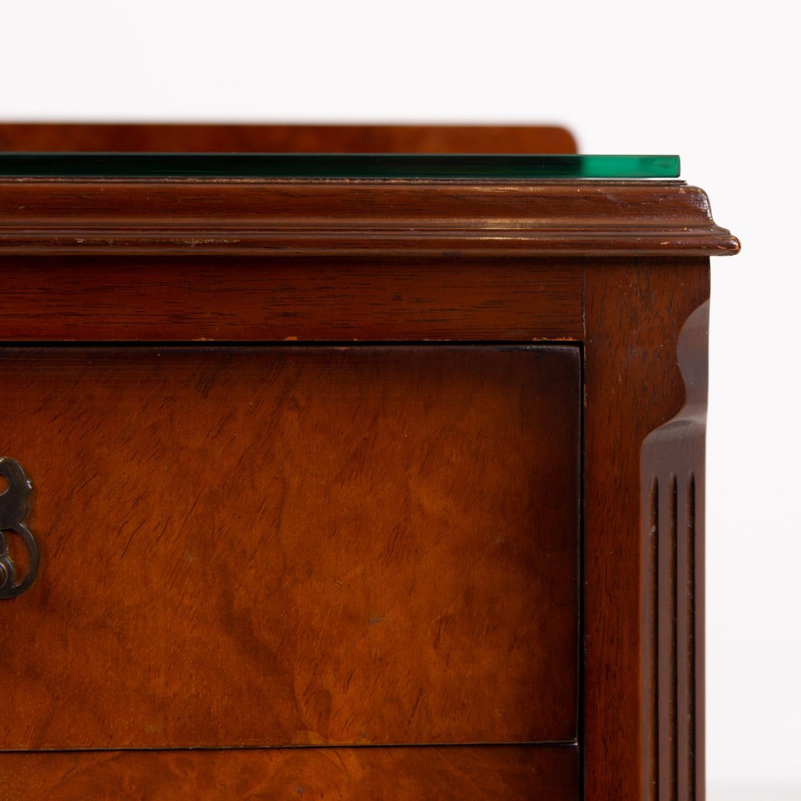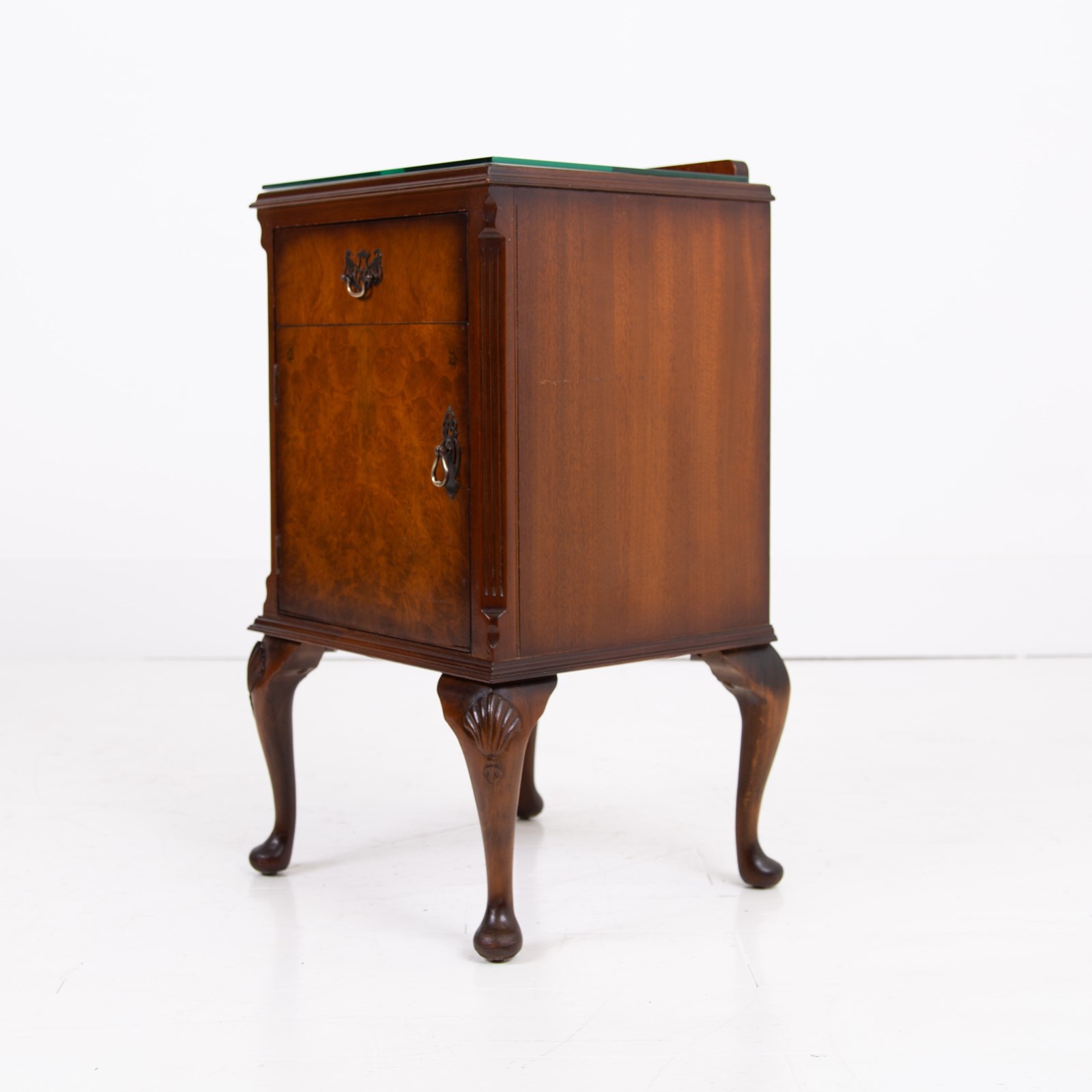 They are of good quality and are of a very useful size. The walnut is figured with interesting grain patterns and a lovely tone. They sit on short cabriole legs with shell carving at the knees to the front legs, the front edges are canted and they have raised back galleries. There is plenty of storage space inside the cabinets and drawers, which have lovely pierced brass handles. The tops have glass covers. Condition is good, expect light day to day use and marks.