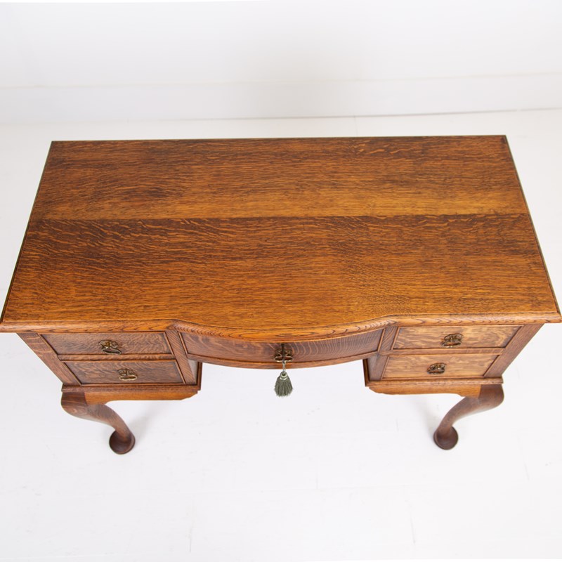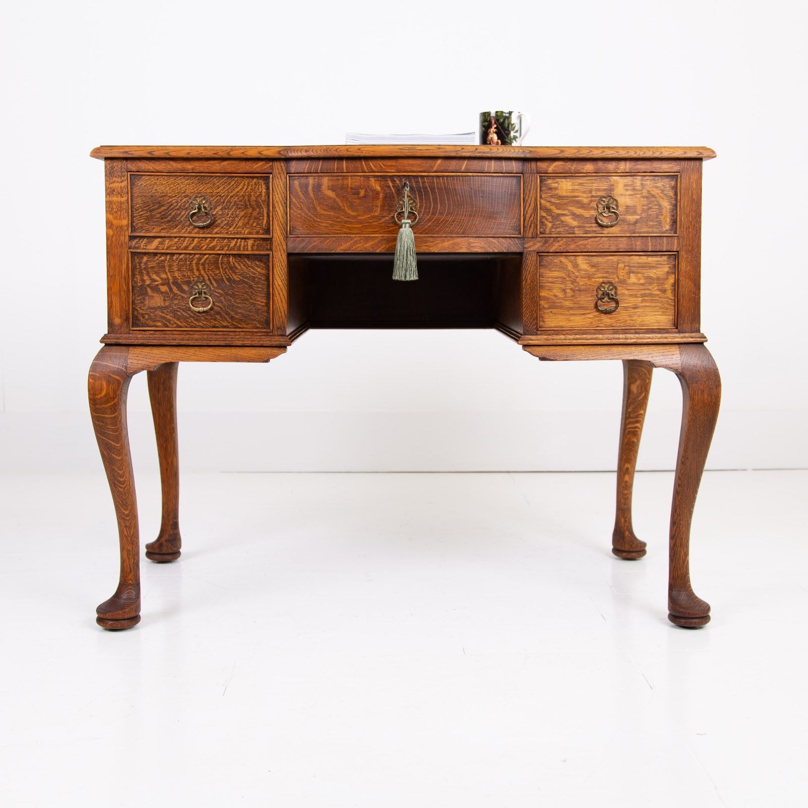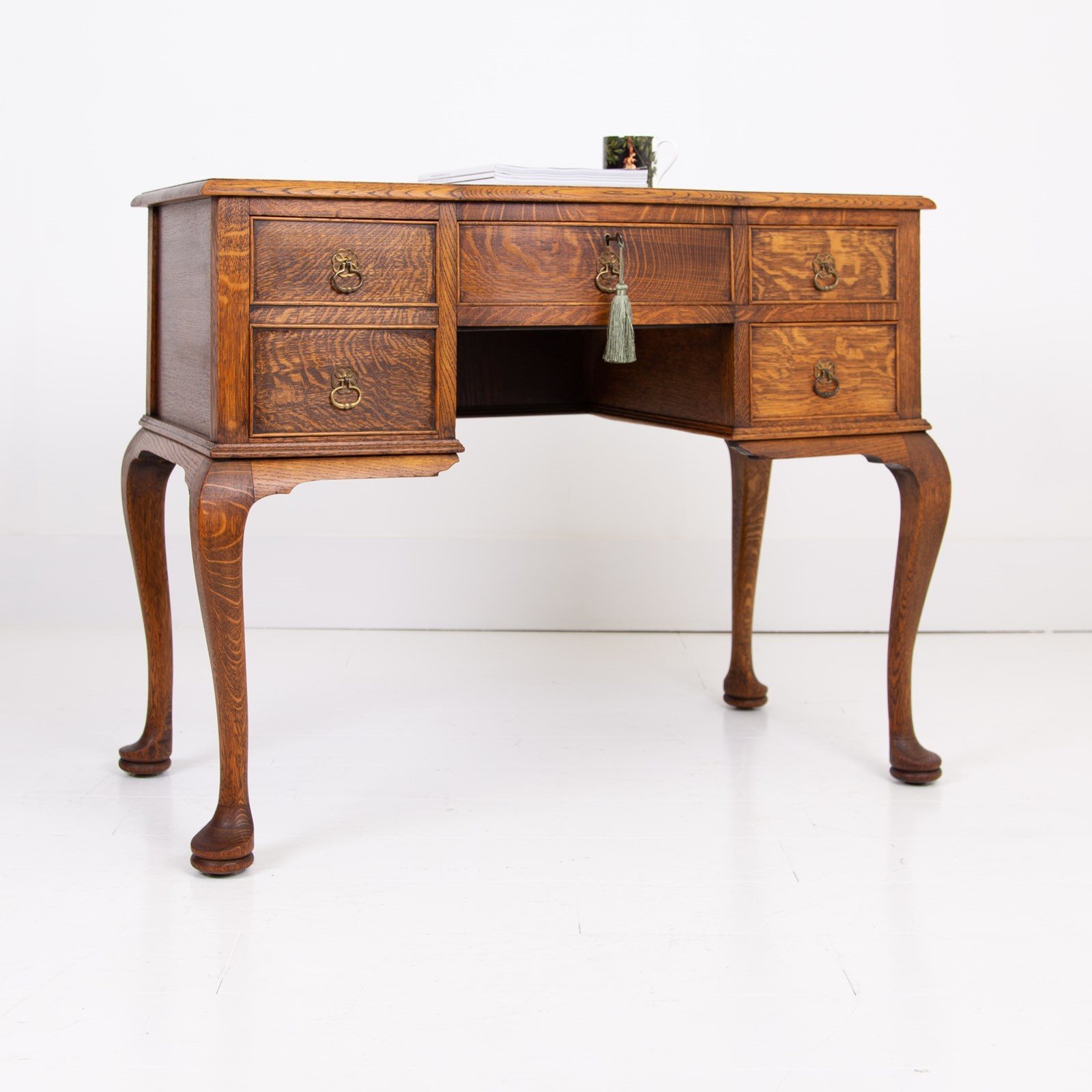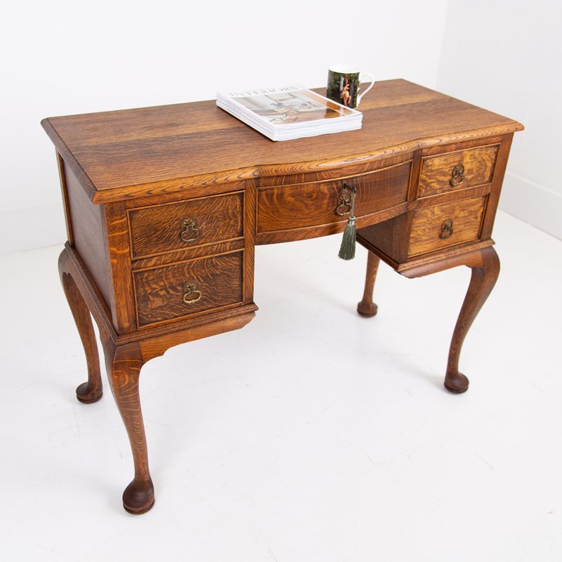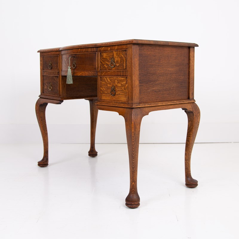 Attractive Quality Oak 4 Drawer Desk C1920 A highly attractive late 1920s 4 drawer desk in a lighter tone of English oak with a wealth of desirable features and of smaller scale than most. The desk sits on lovely pad feet and cabriole legs, we have a pleasing bow to the top drawer which comes with a working lock and key, smart cock beading to all drawers and the tone and colour of the oak is very good. Overall a quality piece for a period or modern home. Condition is good - the desk has been carefully repolished in our workshop and waxed. All drawers are running well and we have light day to day wear but nothing off putting. We have ink stains to the inside double file drawer, but historic. In well cared for condition and ready to be placed. A very handsome English oak desk, late 1920s. DimensionsOverall: Height 78cm x Width 101cm with Top 96cm x Depth 50cm with Top 45cm at Mid PointKneehole: Height 61cm x Width 36cmMid Drawer Inner: Height 8cm x Width 35cm x Depth 33cm and 35cm at Mid PointLeft Hand Side File Drawer Inner: Height 22.5cm x Width 20cm x Depth 33cmRight Hand Side Drawer Inners: Height from Top Down 8cm & 10.5cm x Width 20cm x Depth 33cm When purchasing from us we include delivery in the purchase price which is based on a one person delivery for England and Wales. Please call or email for quotes to Scotland, Northern Ireland, The Isles and for World-wide shipping. Please see our delivery page for details.
