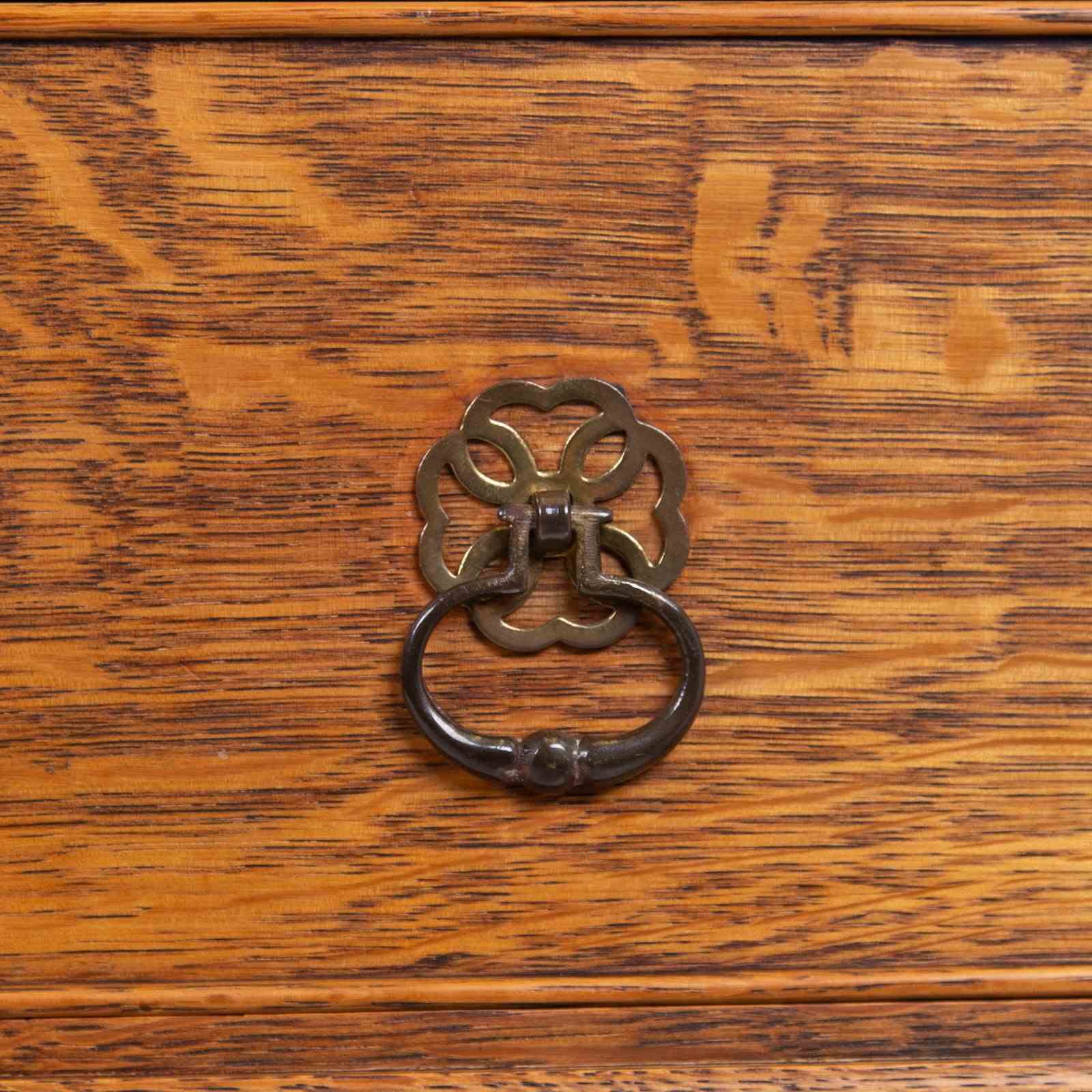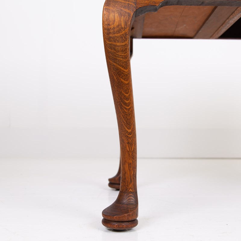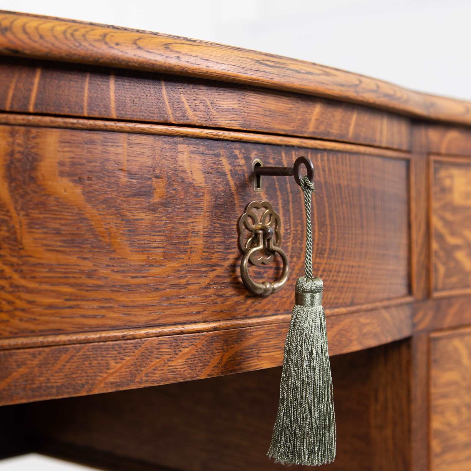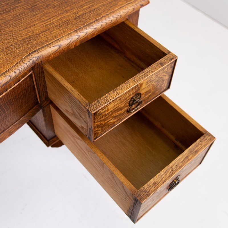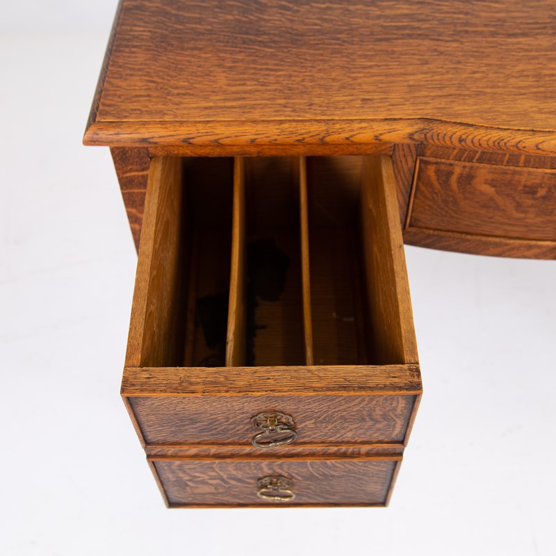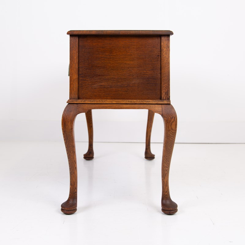 Attractive Quality Oak 4 Drawer Desk C1920 A highly attractive late 1920s 4 drawer desk in a lighter tone of English oak with a wealth of desirable features and of smaller scale than most. The desk sits on lovely pad feet and cabriole legs, we have a pleasing bow to the top drawer which comes with a working lock and key, smart cock beading to all drawers and the tone and colour of the oak is very good. Overall a quality piece for a period or modern home. Condition is good - the desk has been carefully repolished in our workshop and waxed. All drawers are running well and we have light day to day wear but nothing off putting. We have ink stains to the inside double file drawer, but historic. In well cared for condition and ready to be placed. A very handsome English oak desk, late 1920s. DimensionsOverall: Height 78cm x Width 101cm with Top 96cm x Depth 50cm with Top 45cm at Mid PointKneehole: Height 61cm x Width 36cmMid Drawer Inner: Height 8cm x Width 35cm x Depth 33cm and 35cm at Mid PointLeft Hand Side File Drawer Inner: Height 22.5cm x Width 20cm x Depth 33cmRight Hand Side Drawer Inners: Height from Top Down 8cm & 10.5cm x Width 20cm x Depth 33cm When purchasing from us we include delivery in the purchase price which is based on a one person delivery for England and Wales. Please call or email for quotes to Scotland, Northern Ireland, The Isles and for World-wide shipping. Please see our delivery page for details.