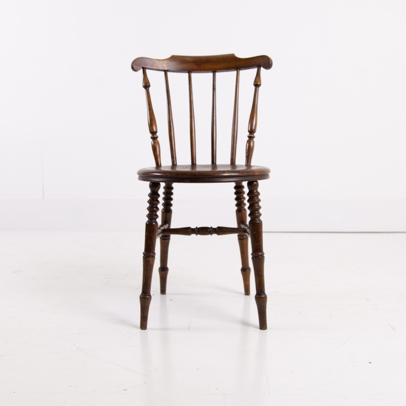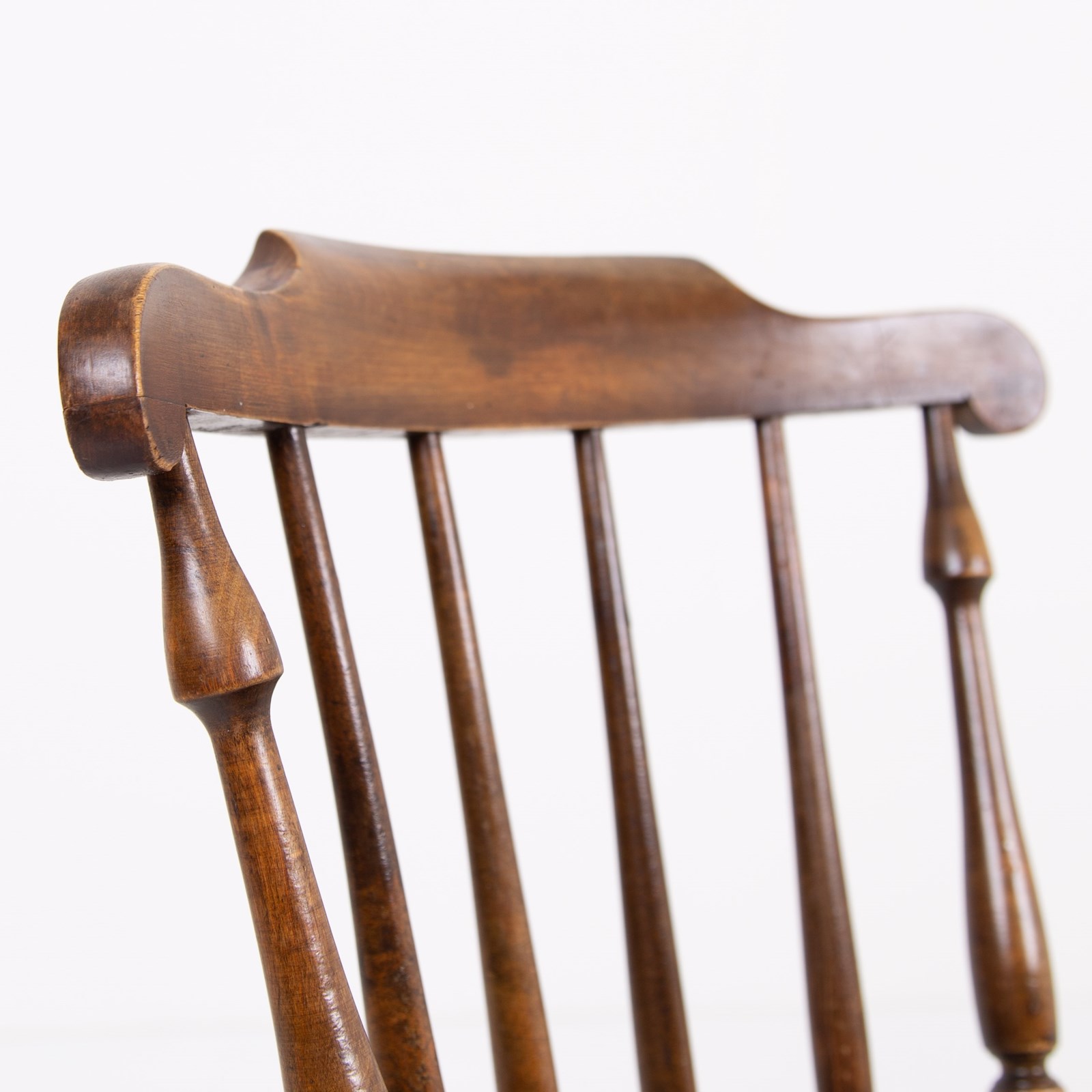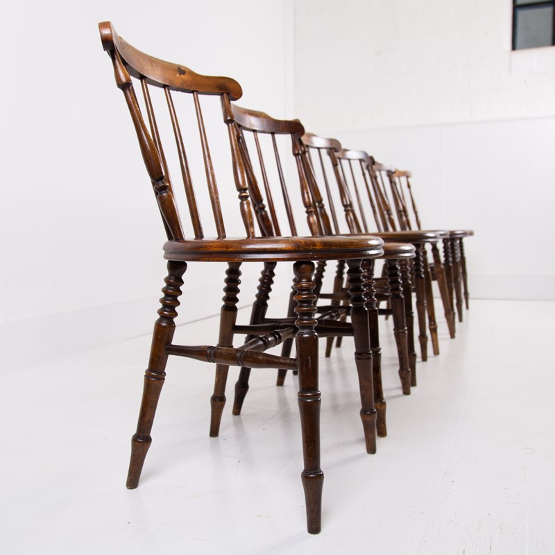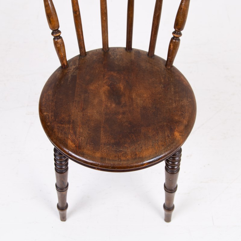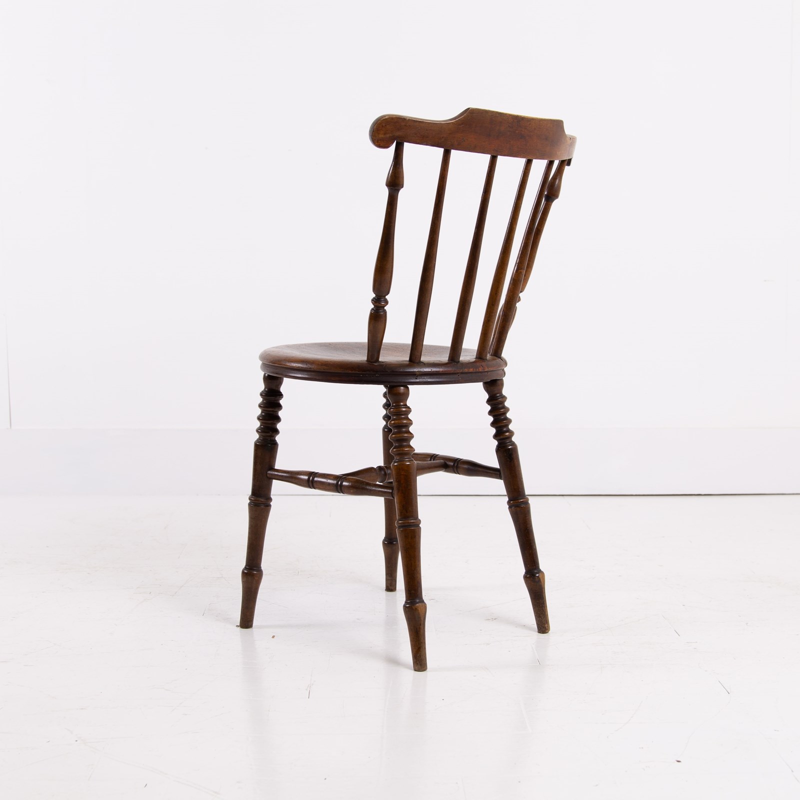 This is a good quality set of 6 Swedish Ibex solid beech stick back kitchen chairs, circa 1915 in nice original condition. The chairs incorporate a shaped top rail with six turned spindle (ring turned outer spindles) back, on a circular comfortable moulded seat, raised on ring turned legs. The legs are united by “H” beech stretchers, which makes them a firm utility chair, ideal for daily use in the kitchen. Worth noting 1 is slightly different in design but not a big deal. These have been lightly clean and waxed in our workshop retaining historic wear.