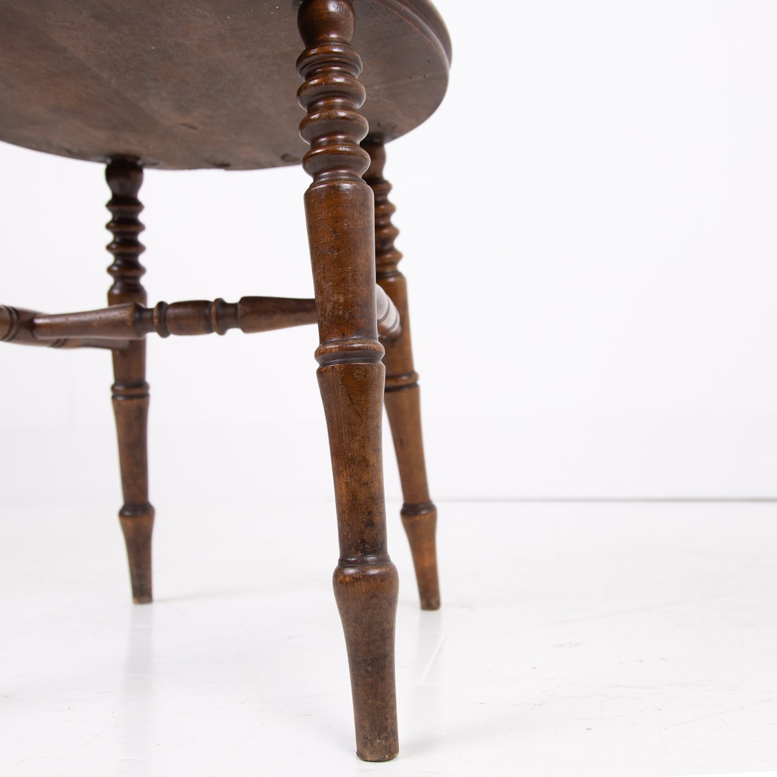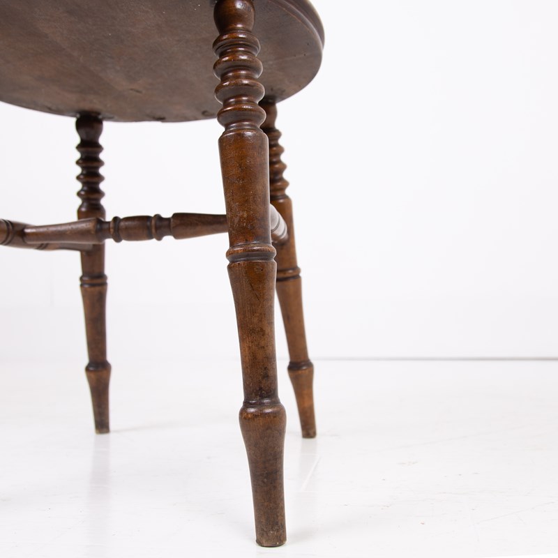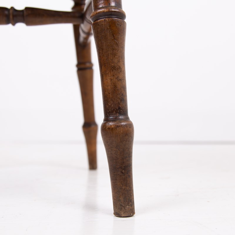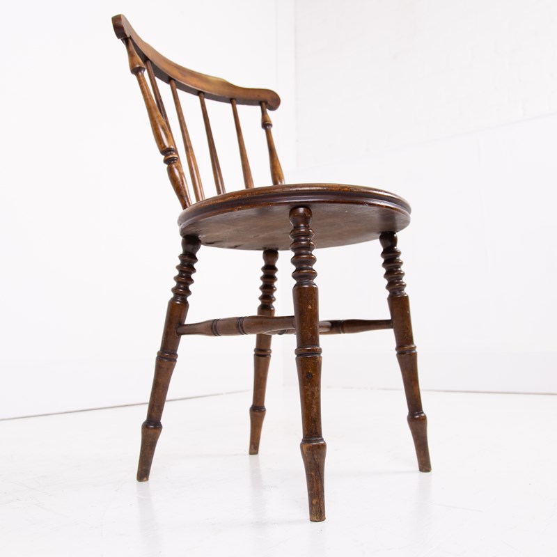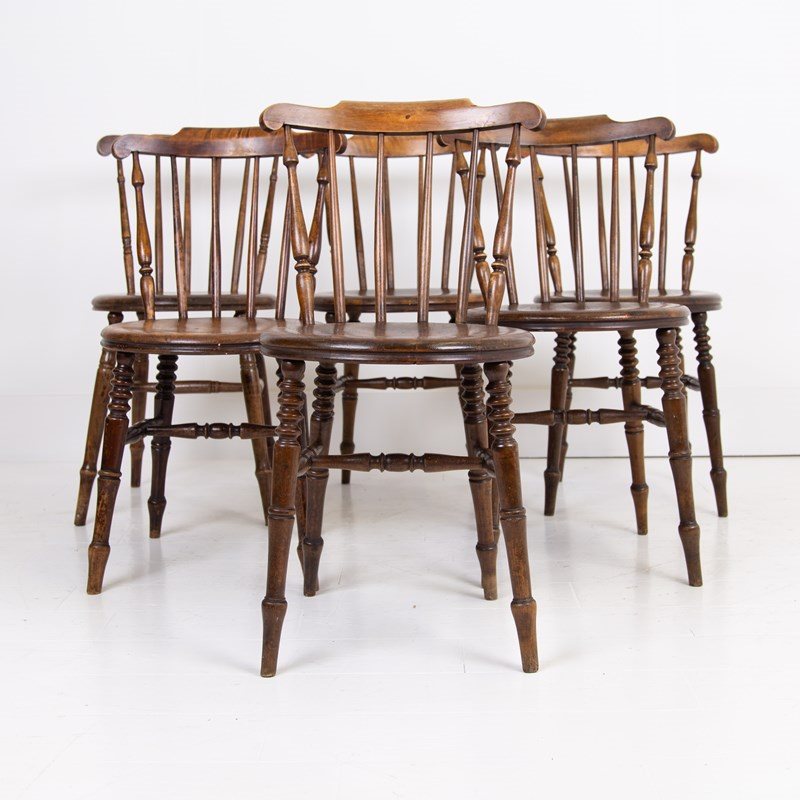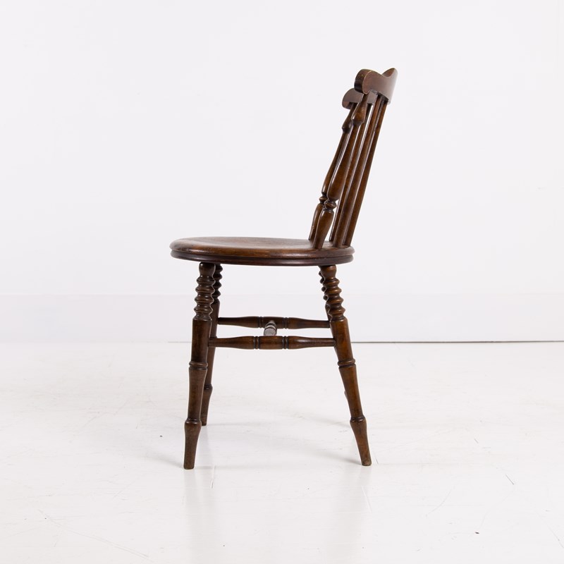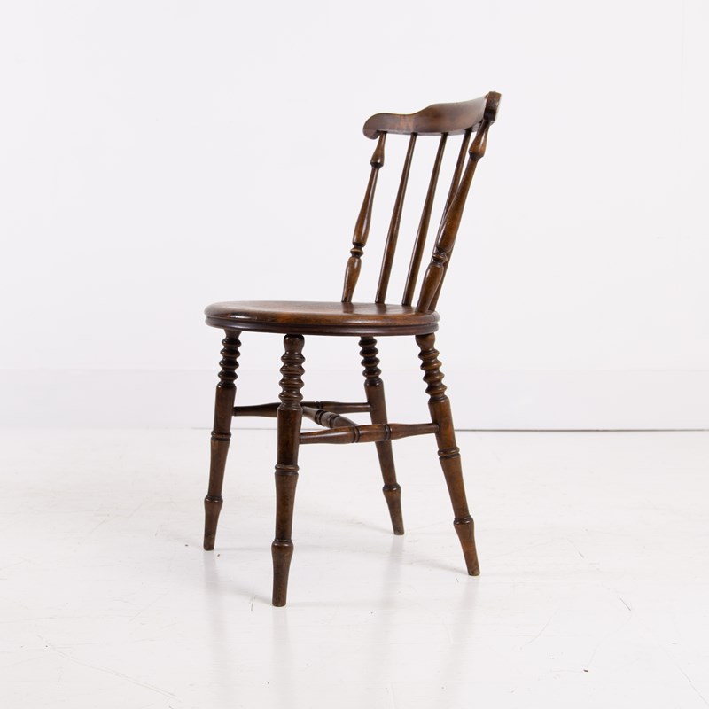 This is a good quality set of 6 Swedish Ibex solid beech stick back kitchen chairs, circa 1915 in nice original condition. The chairs incorporate a shaped top rail with six turned spindle (ring turned outer spindles) back, on a circular comfortable moulded seat, raised on ring turned legs. The legs are united by “H” beech stretchers, which makes them a firm utility chair, ideal for daily use in the kitchen. Worth noting 1 is slightly different in design but not a big deal. These have been lightly clean and waxed in our workshop retaining historic wear.