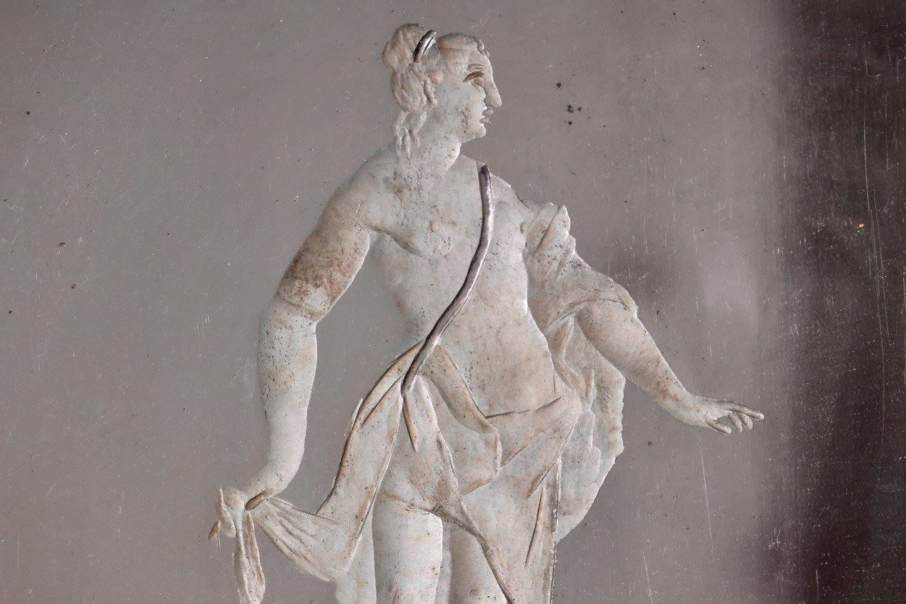 The rectangular mirror plate finely etched with a classical maiden.