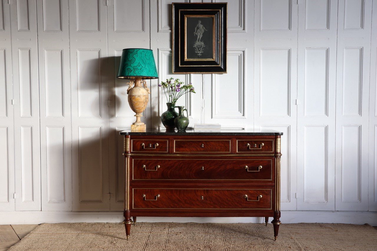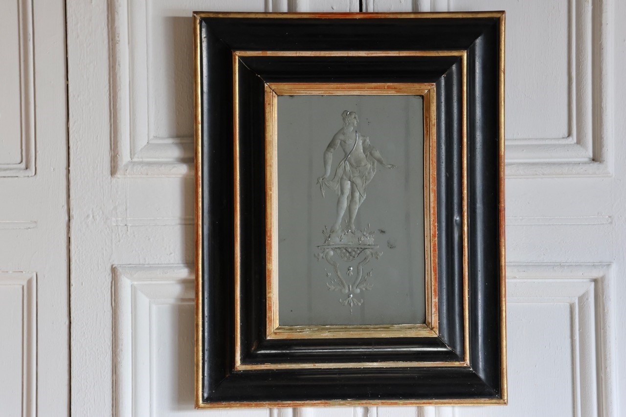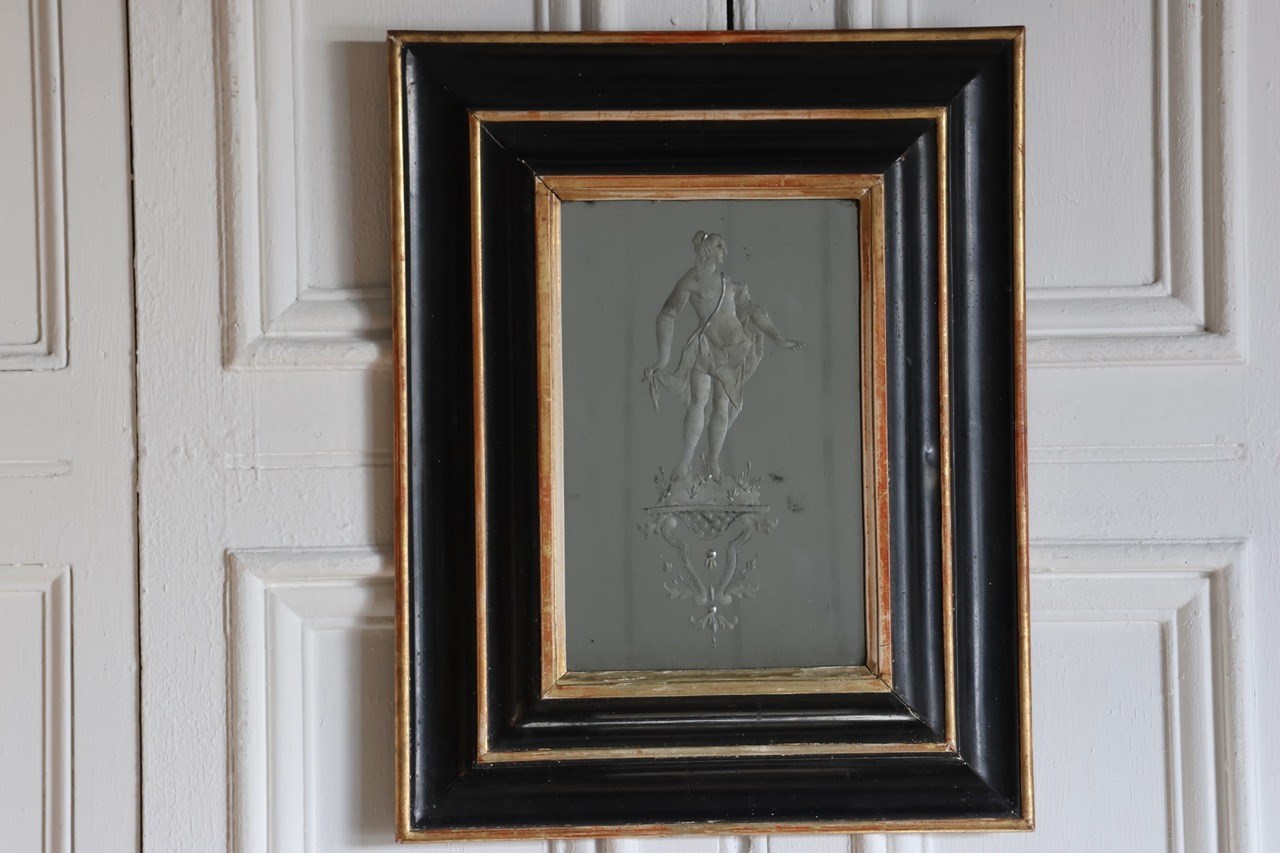 A lovely 19th century Italian ebonised and gilded frame with an earlier, 18th century antique eglomise, or verre églomisé mirror featuring a classical female figure.