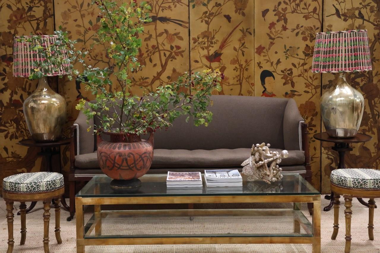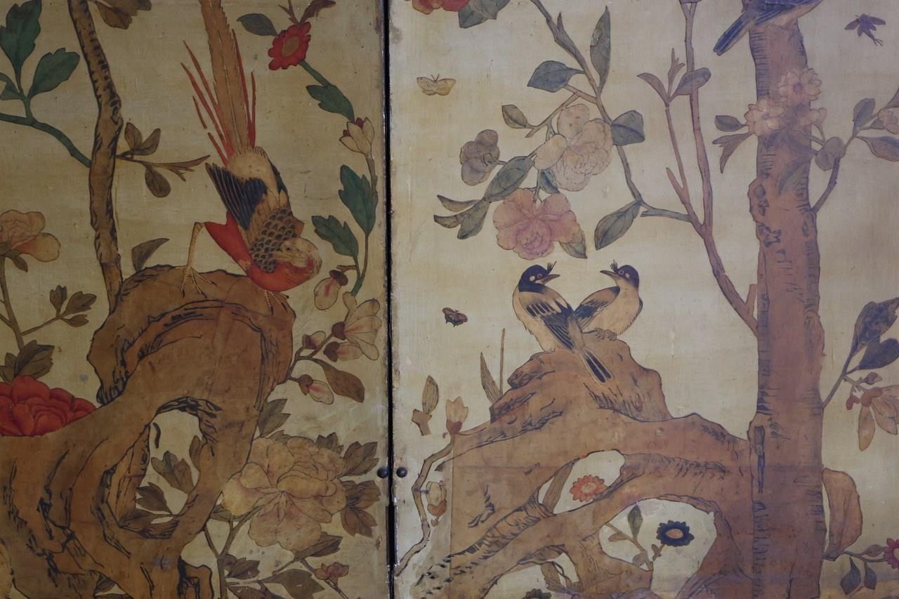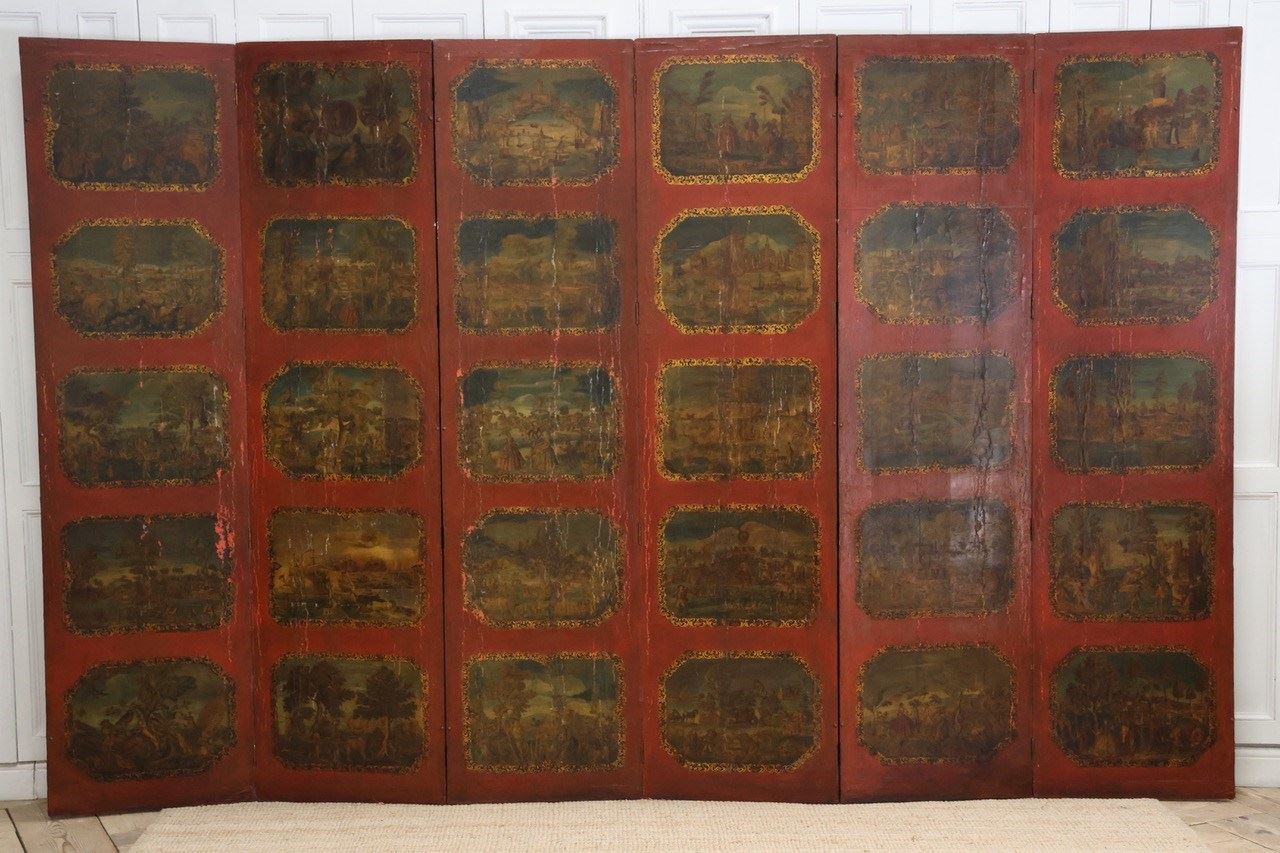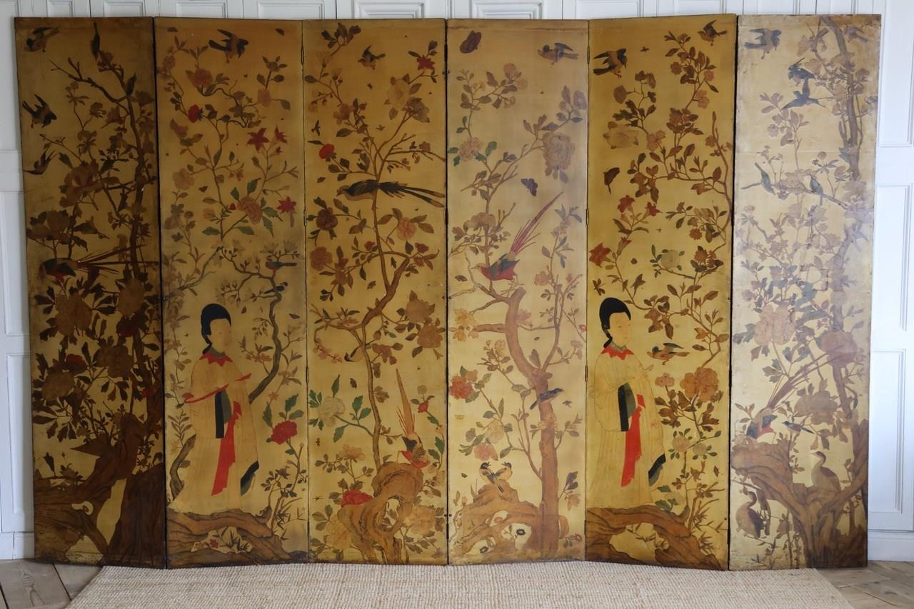 A superb, 19th century Chinoiserie six panel lacquered folding screen , of large proportions. One side painted with two figures amongst trees and flowers with exotic birds perched on branches and flying above. The other side, each panel painted with five gold framed vignettes containing different views, against a red ground. Wear and tear at the back as peer pictures, commemsurate with age and use.