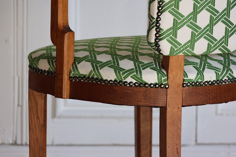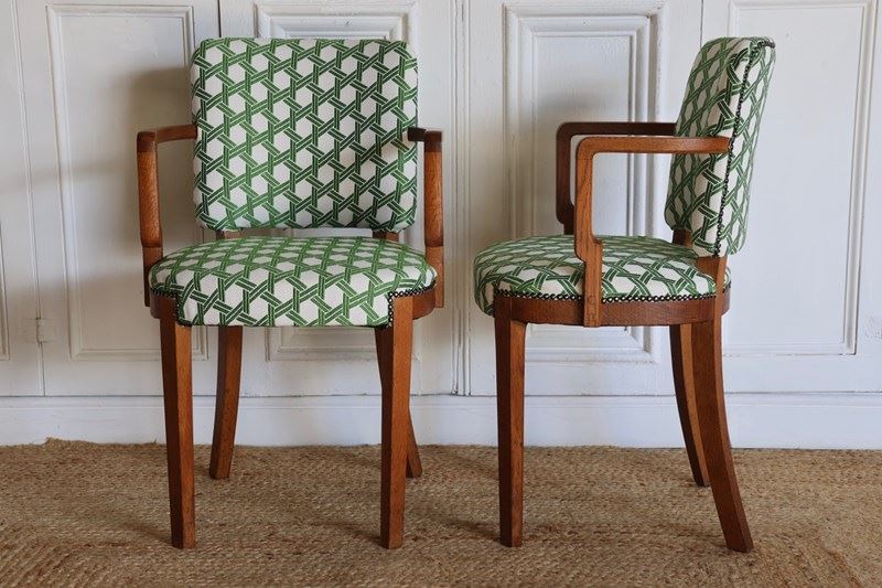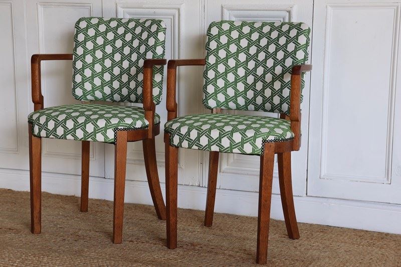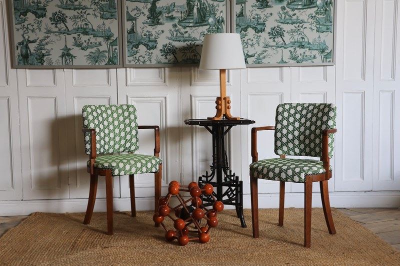 Very Stylish Pair of Early to mid 20th century English armchairs of small proportions and with great design, by Shepherd & Hedger , retaining the original label underneath, Shepherd & Hedger, Southampton, Salisbury and Dorchester . Recently reupholstered by us in Saint-Tropez fabric in Prairie by Manuel Canovas.