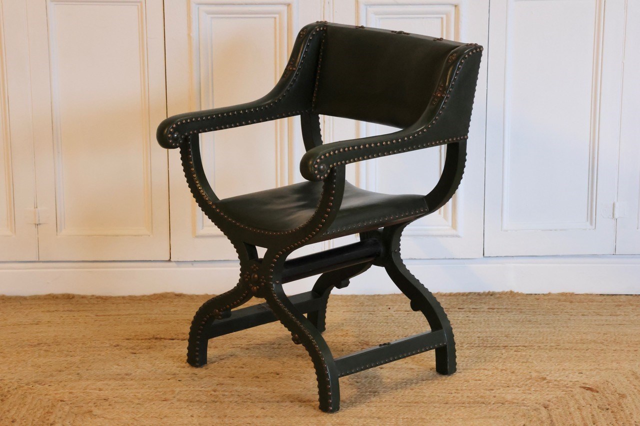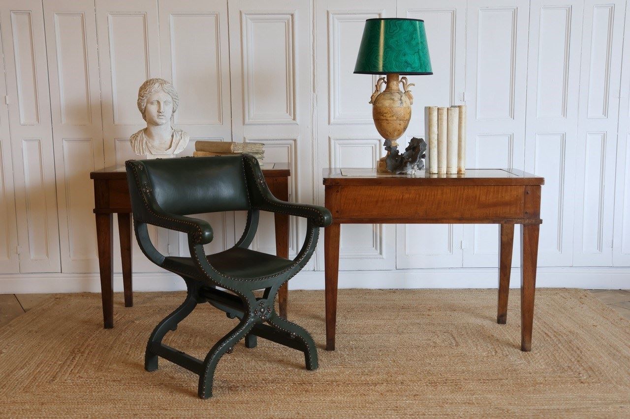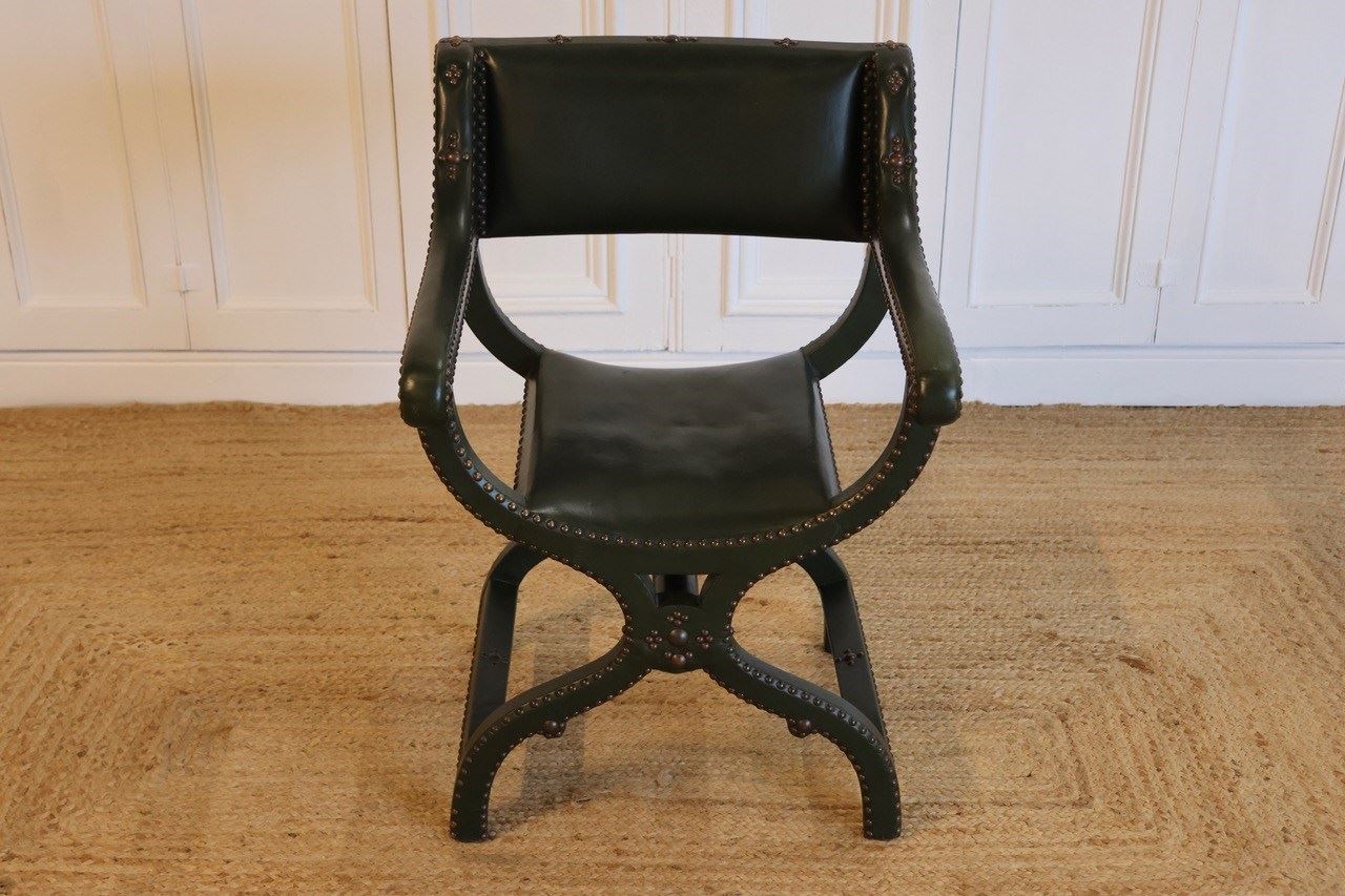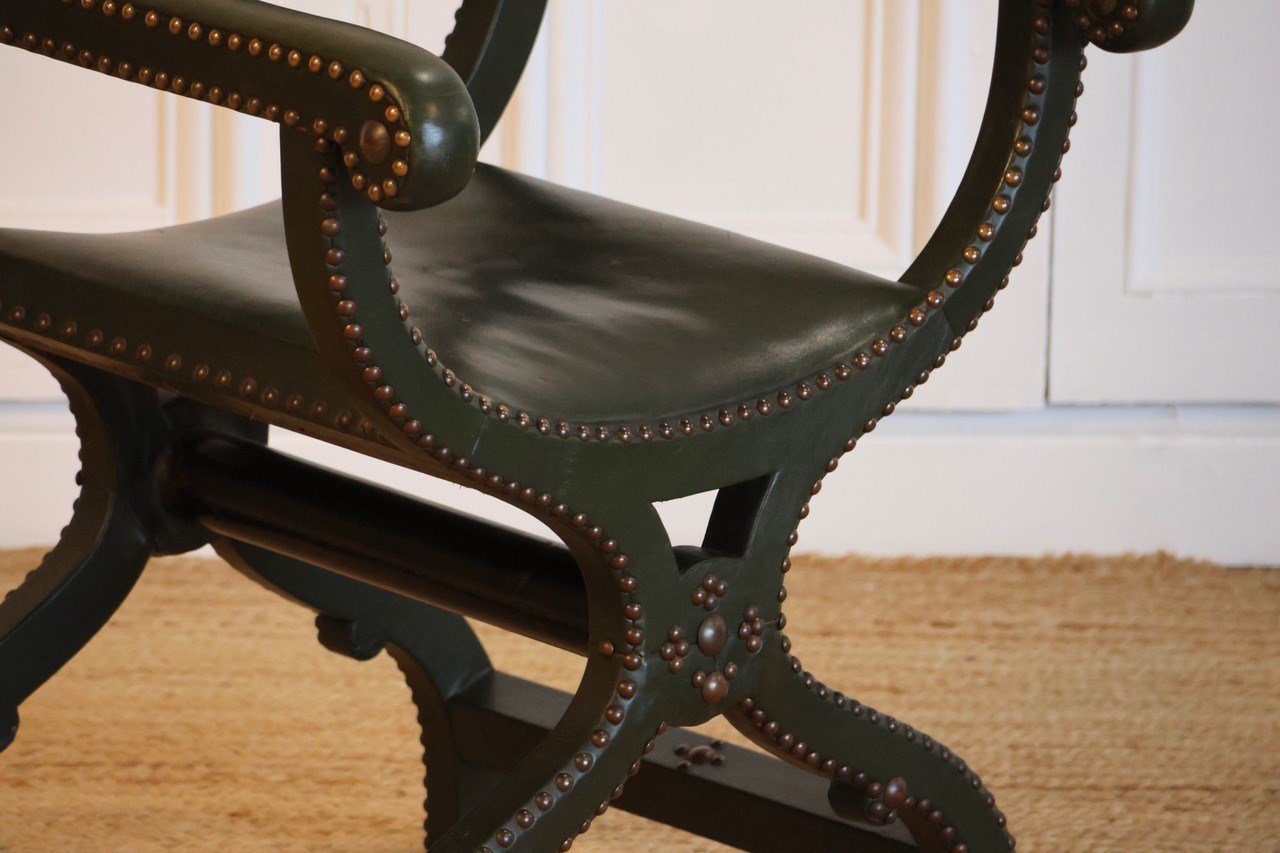 Early 20Th Century French Green Leather Studded X Frame Chair