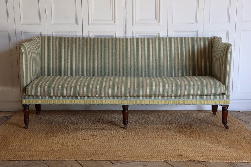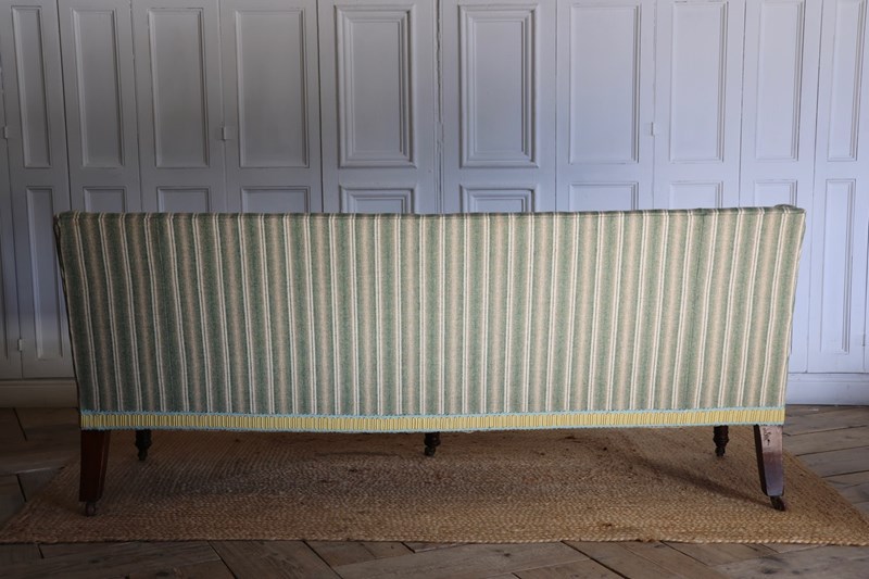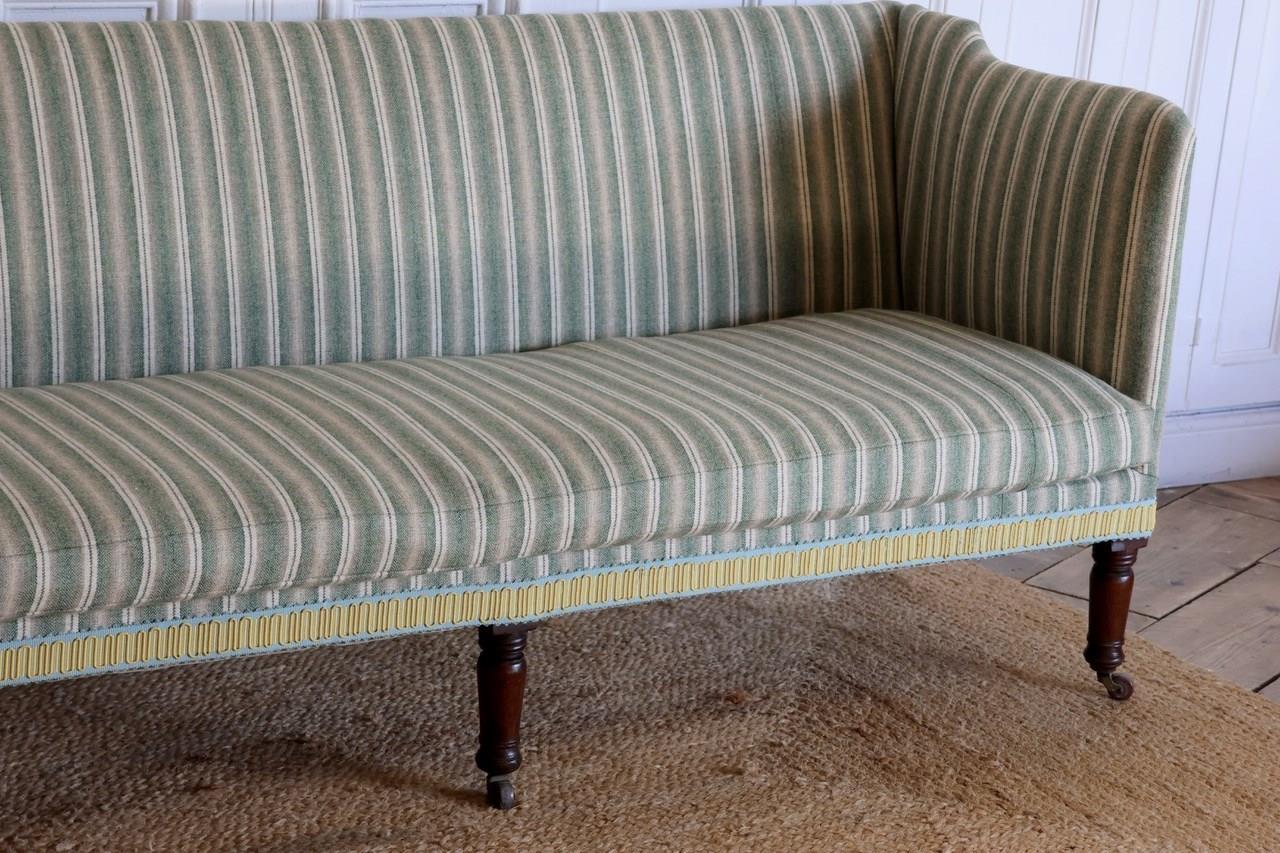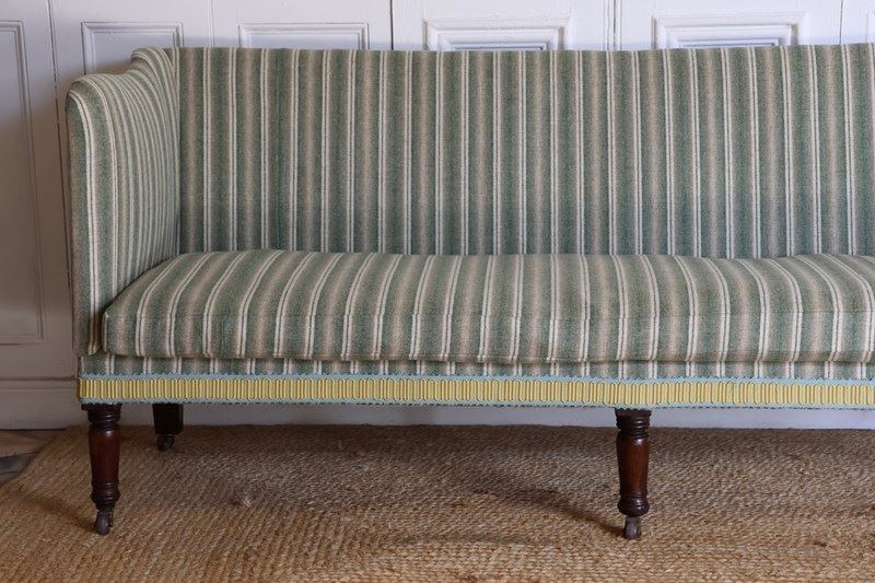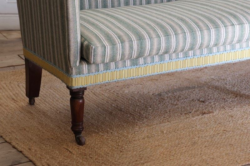 A good quality, early 19th century English Regency period , mahogany three seater sofa, raised on turned legs with castors , and recently reupholstered by us in a Designers Guild textured chevron stripe weave , a 100% wool with softly gradiated colours. Original horsehair cushion.