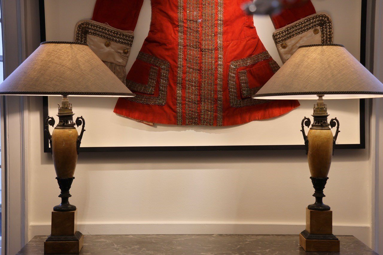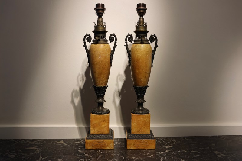 A fine pair of early 19th century French Carcel-type table lamps in sheet metal, painted to imitate Sienna yellow marble and patinated metal in the shape of antique vases on pedestals, with square bases. Both table lamps Inscribed: “Lampe Silvant – par brevet d’invention – Industrie française avec garantie”.