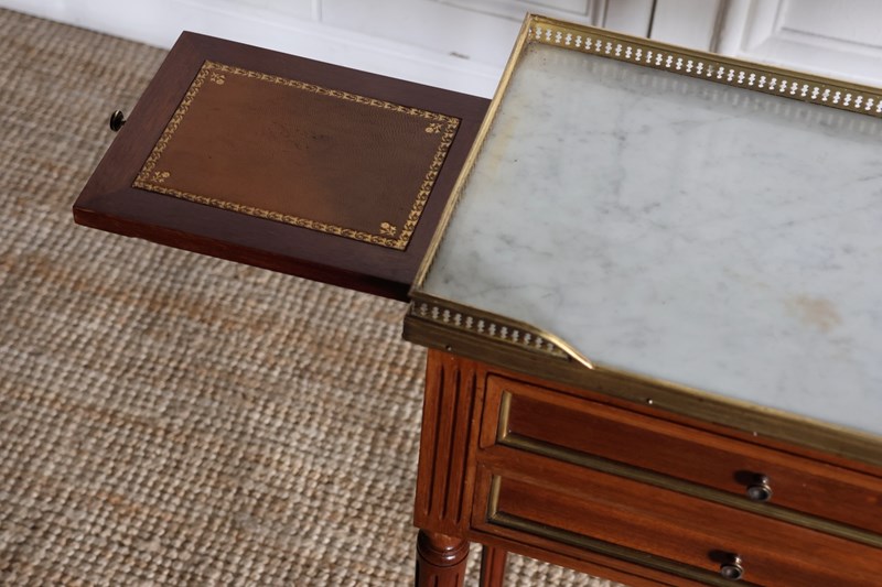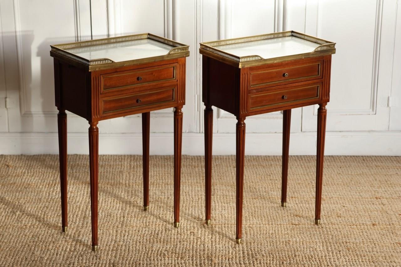 A good quality pair of early 20th century French mahogany bedside tables in the Louis XVI taste, retaining the original marble top and brass , and with a brushing slide each, that will work well in most settings.