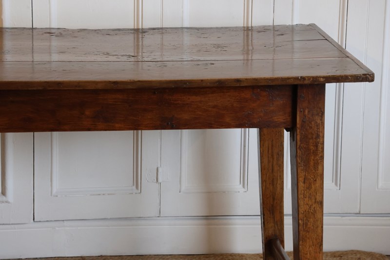 The table, united by stretchers. Wonderful colour. This French farmhouse table will seat 10 people comfortably.