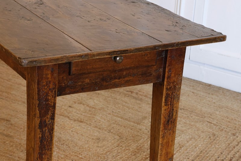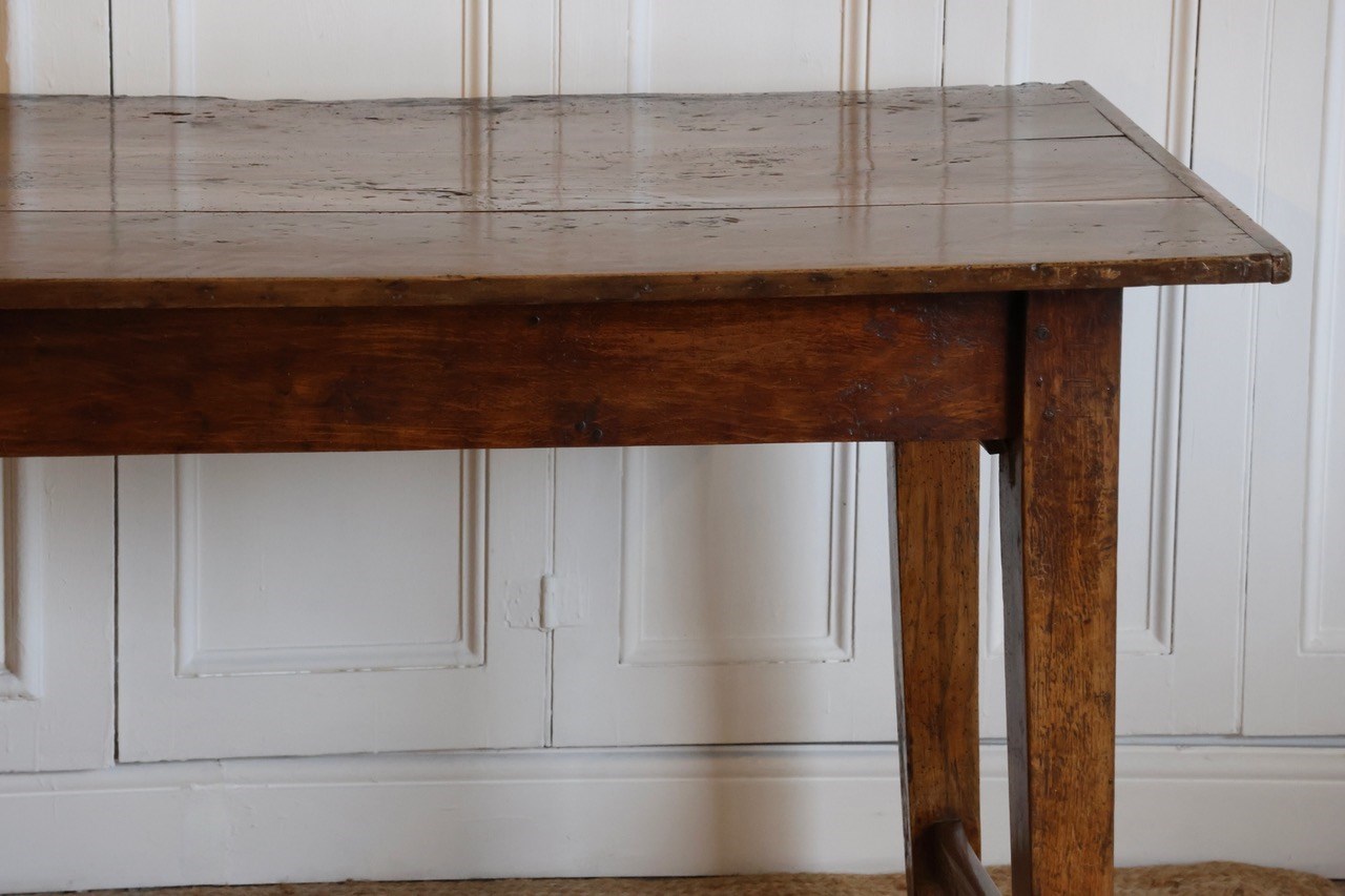 A good 19th century French kitchen table in oak and beech, with a three-plank top, stretchers at each end and a drawer at one end.