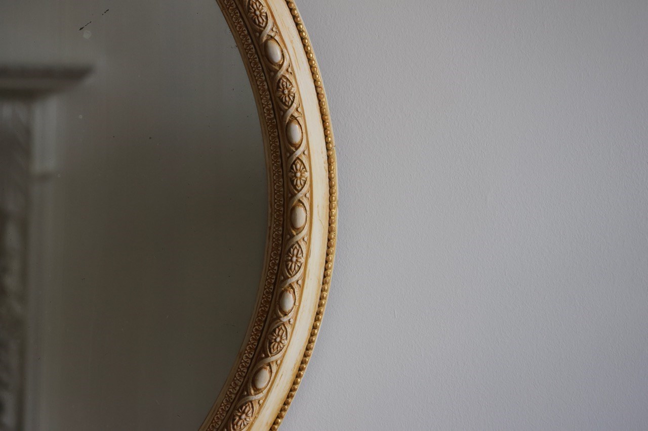 A late 19th century English oval mirror in polished gesso, retaining the original mirror plate and of elegant proportions that can be hang either portrait or landscape.