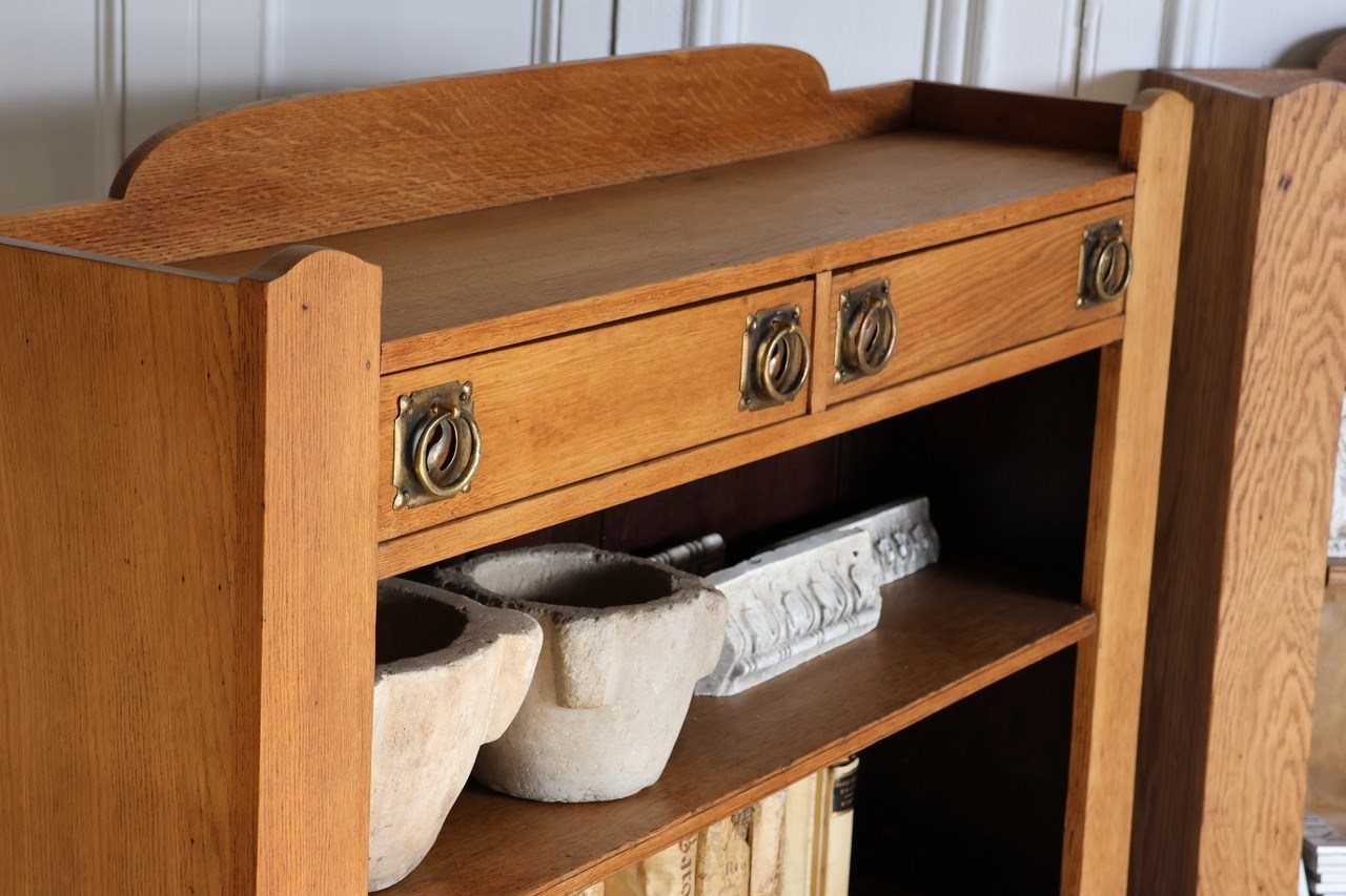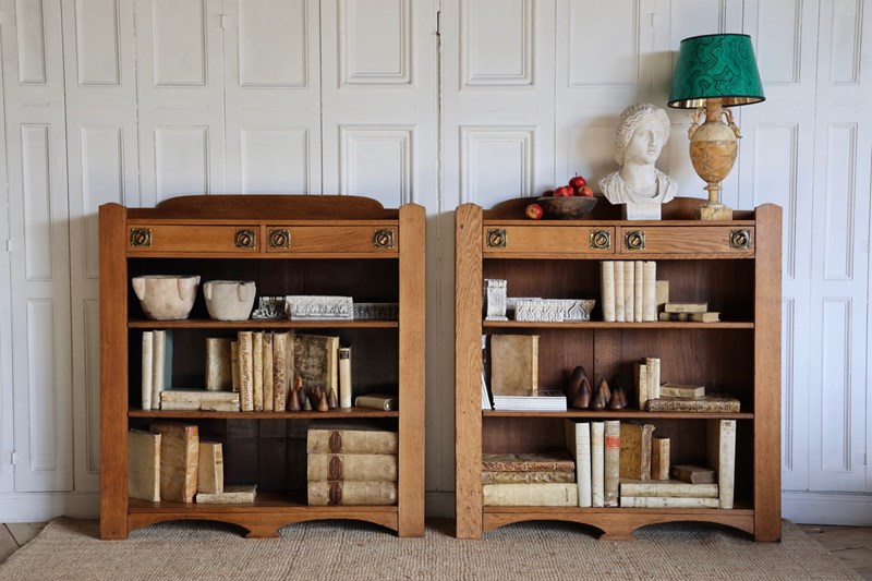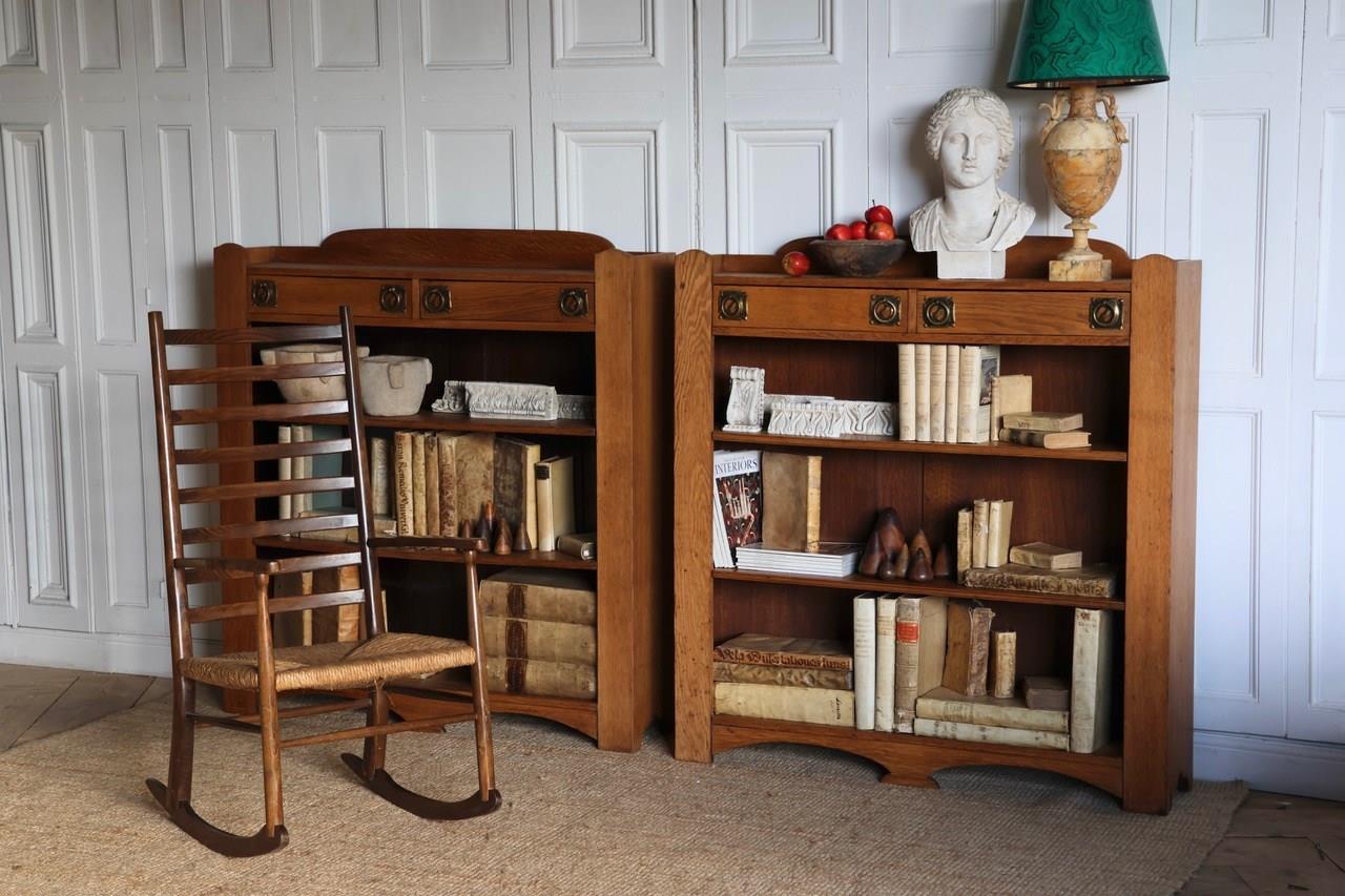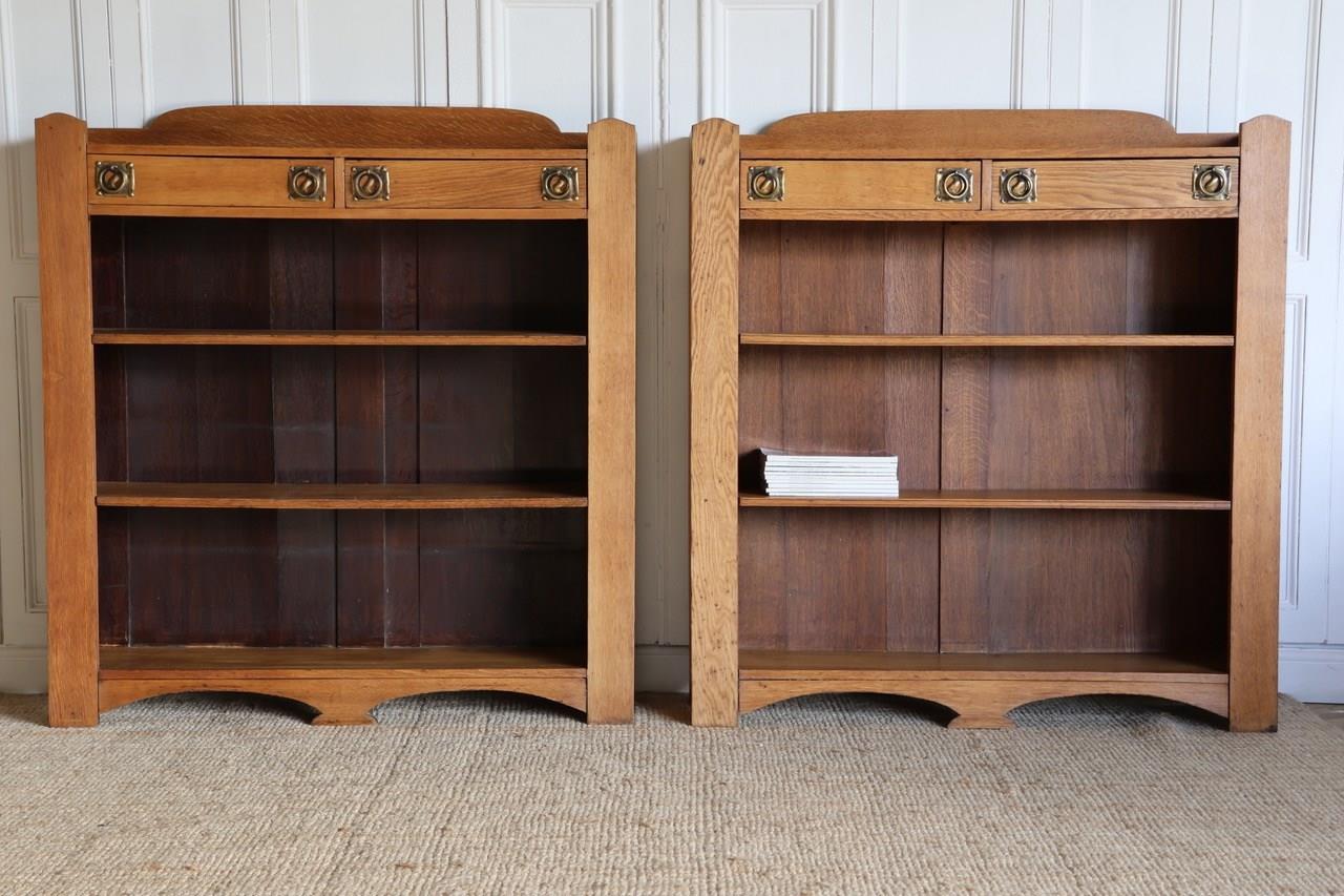 A good pair of late 19th/early 20th century Arts and Crafts oak open bookcases, crafted in solid quarter-sawn oak with attractive medullary rays, two small frieze drawers with brass ring-pull handles with three adjustable shelves, panelled back and shaped lowers apron.