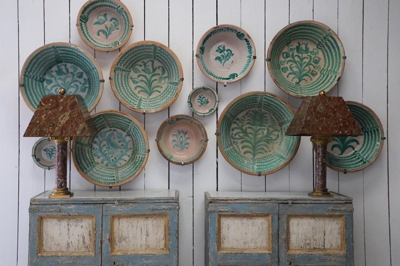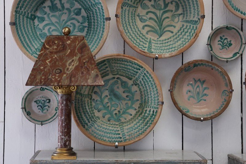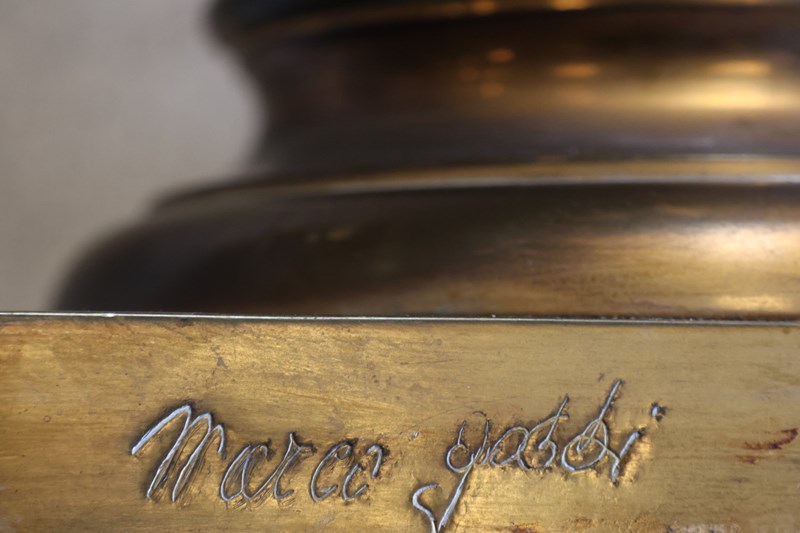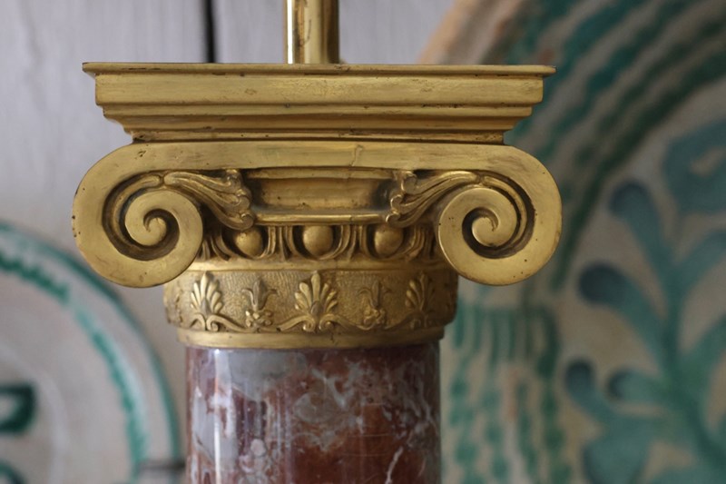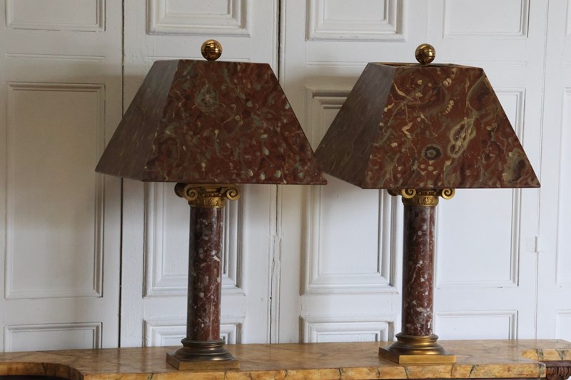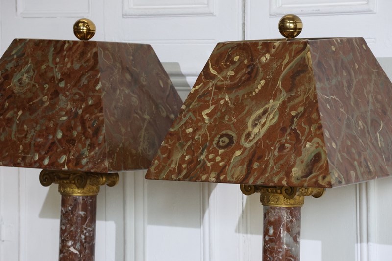 A very stylish and large pair of mid 20th century Italian marble column lights with bronze mounts and their original faux marble painted metal shades , signed Marco Gabbi on the base. The lights recently rewired for the UK.