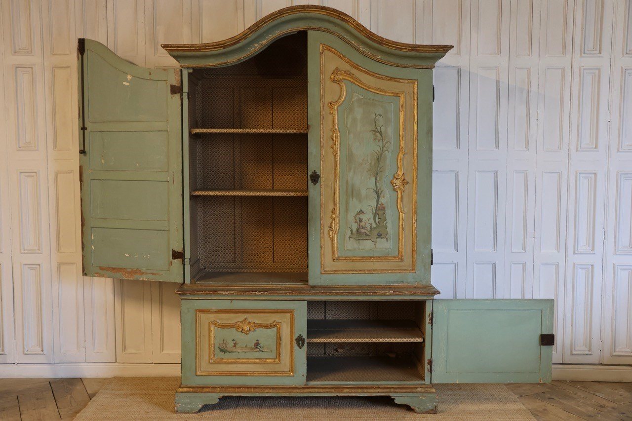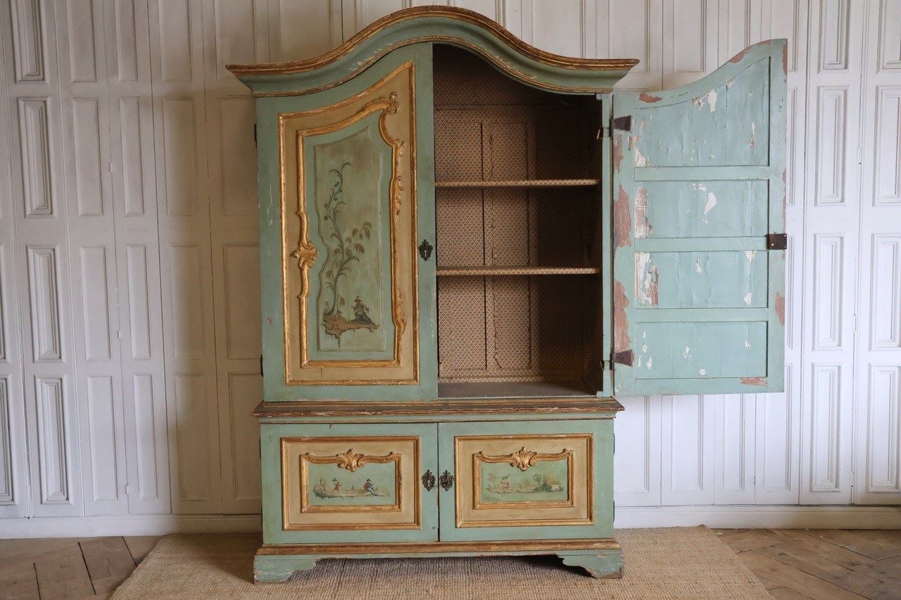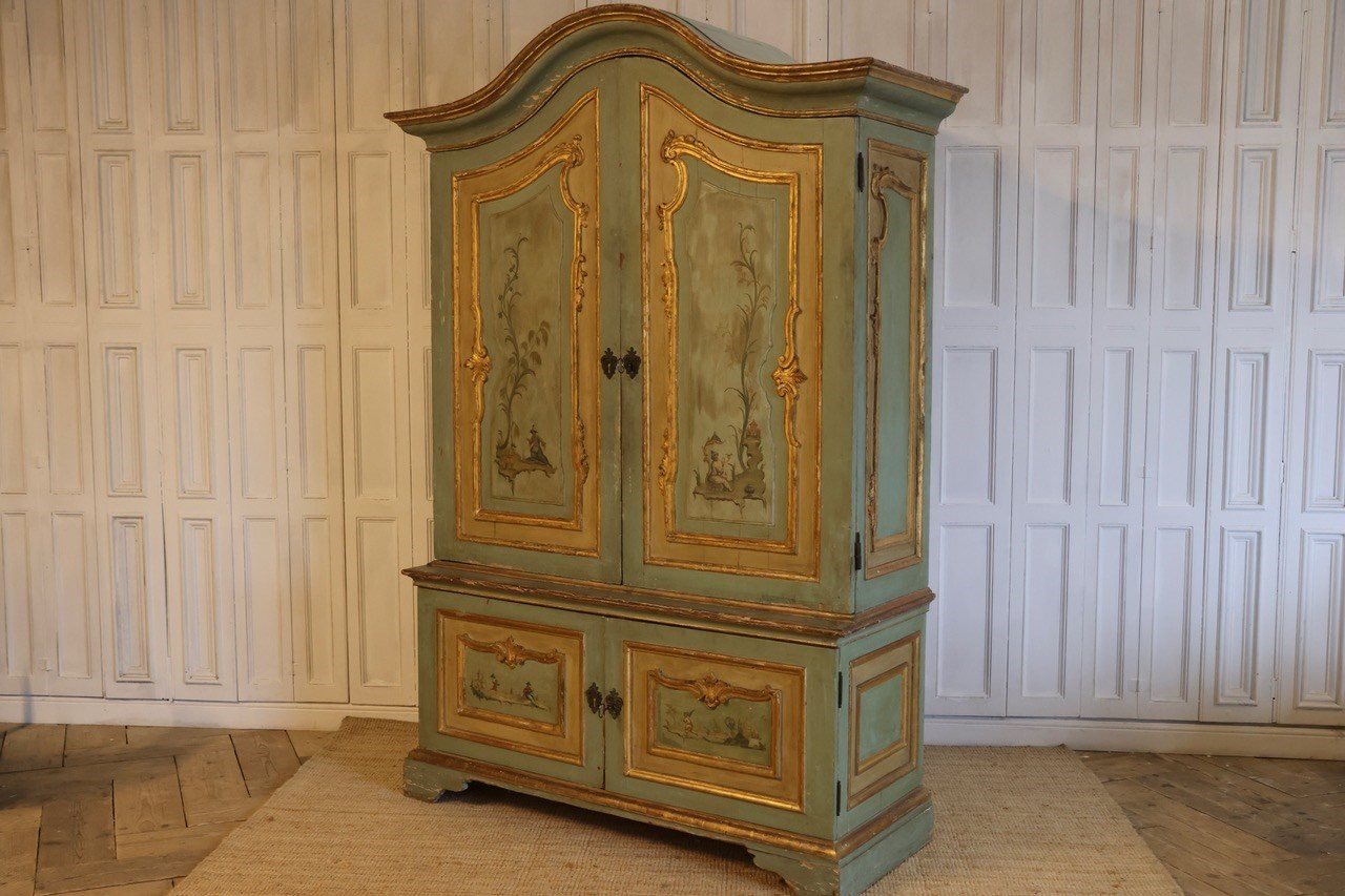 A rare early 19th century Italian four door painted cupboard of ‘palazzi’ proportions, retaining the original powder green paint, carved gilt wood mounts and hand painted chinoiserie panels, circa 1820, that will make a statement in most settings.The base is one piece and the top collapses into 7 pieces, making it easier to transport.