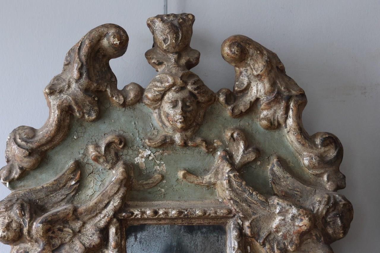 Pair of baroque wooden wall plaques, stuccoed in relief, painted sea green and partially silver-plated. Cartouche-shaped wall plaque, flanked by sculptural female seamen and flowers. In the center a rectangular, narrowly profiled mirror as a blaker for a curved electrified arm. This elegant pair of wall lights have just been electrified for the UK.