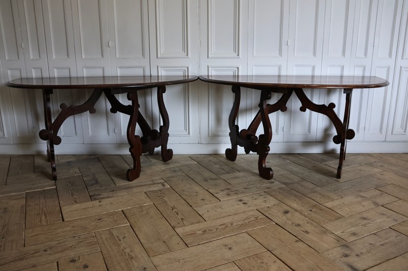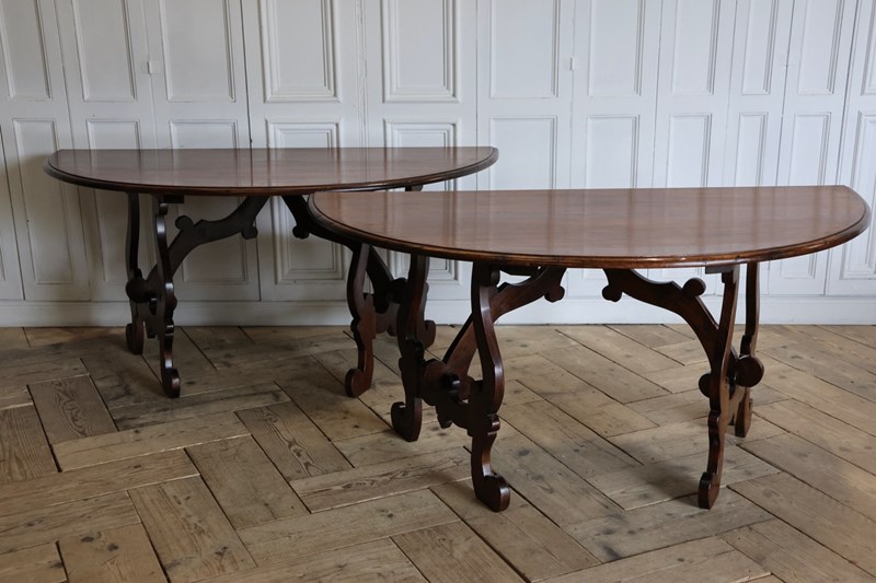 A very useful and practical pair of Early to mid 20th century Italian walnut console tables in the 18th century taste, that can be put together as a centre / dining table. Lovely colour and great proportions.