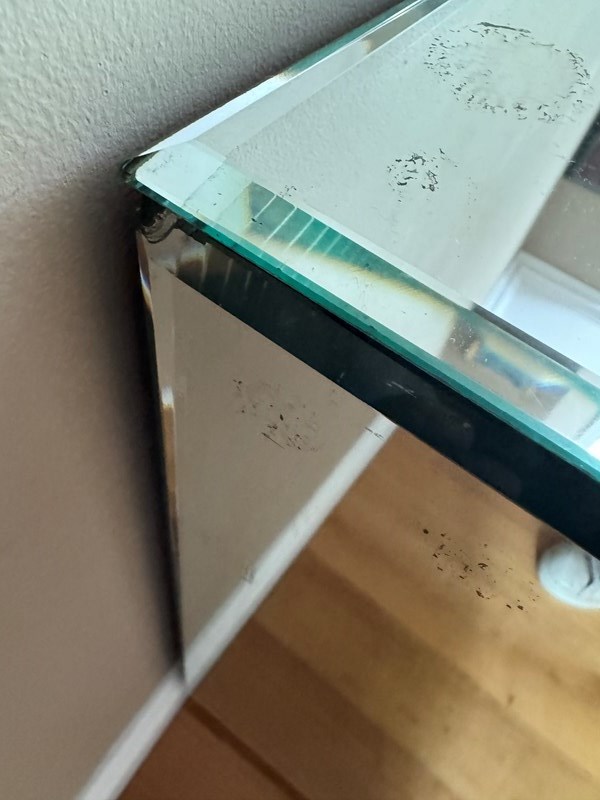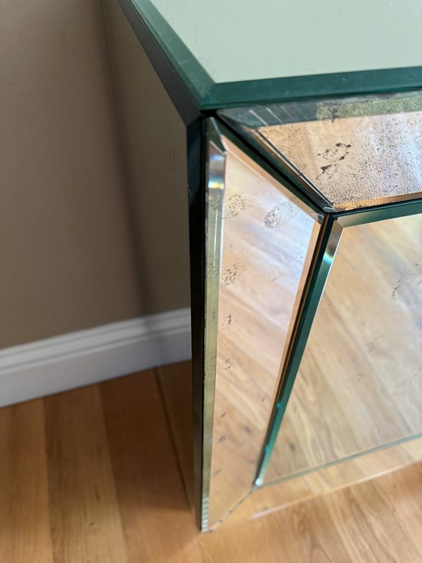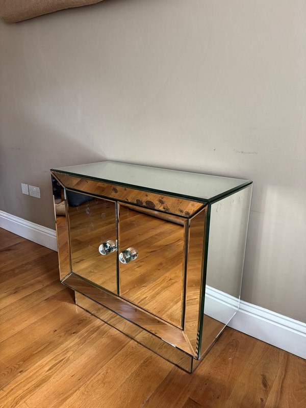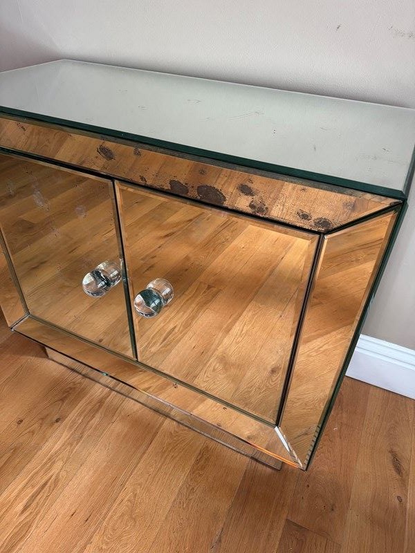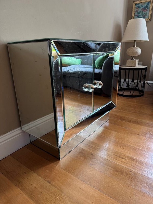 Beautiful small French mirrored cabinet with glass ball handles style of Jacques Adnet. French c.1940’s. One mirrored panel replaced.
