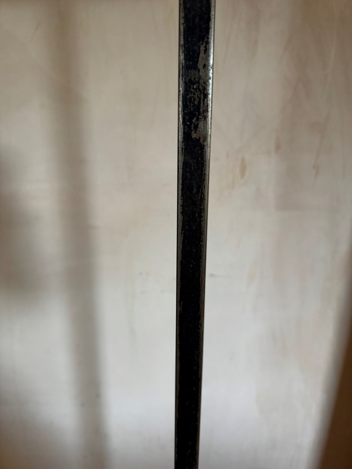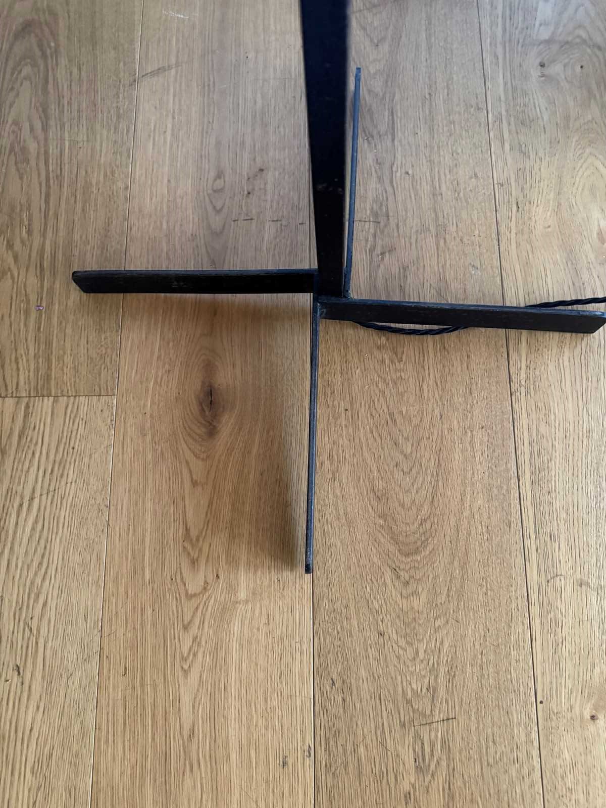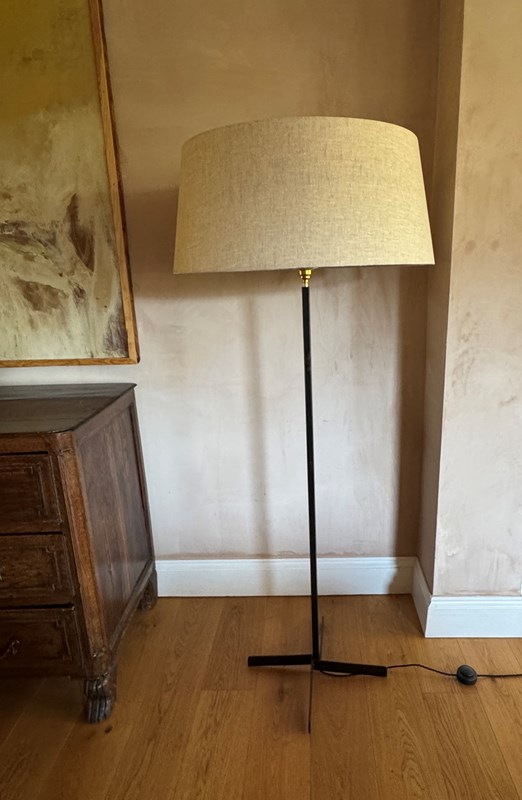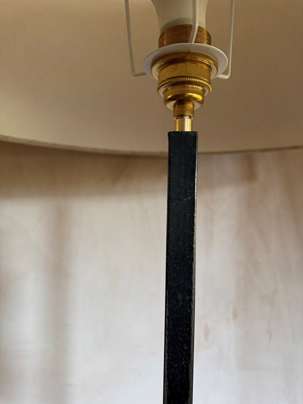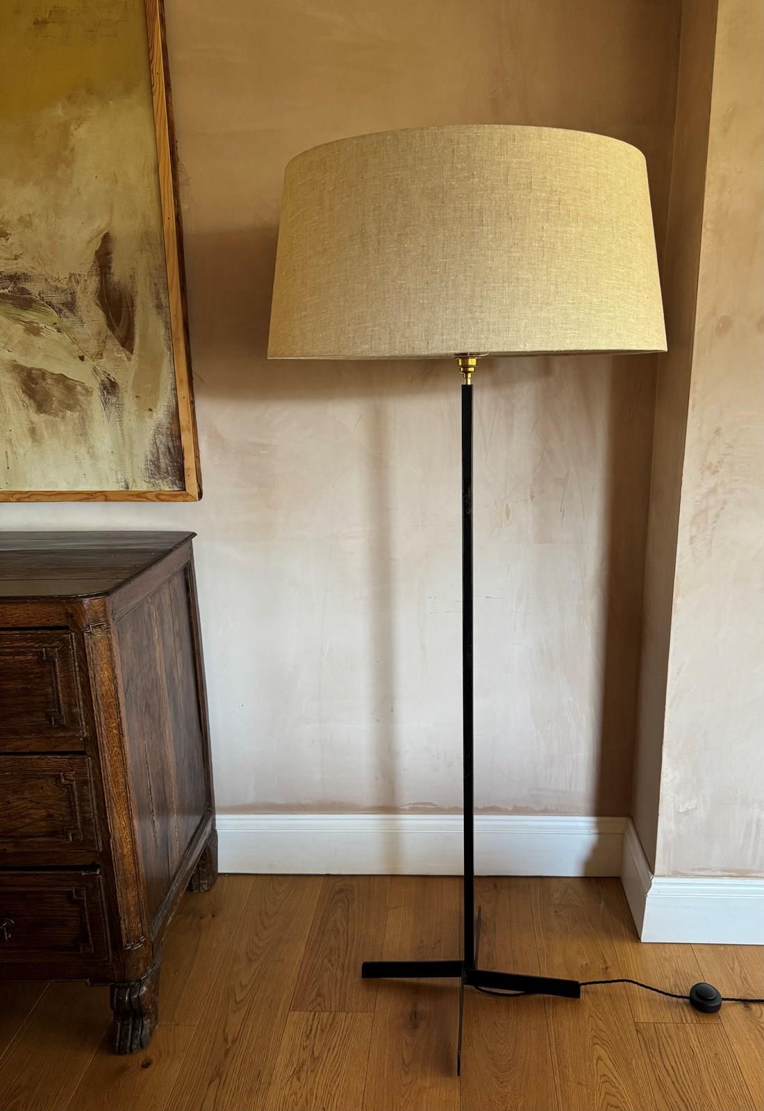 French 1950’s black metal with crossed base. Strong and sturdy some minor paint loss. Rewired and sold with large bespoke linen shade.