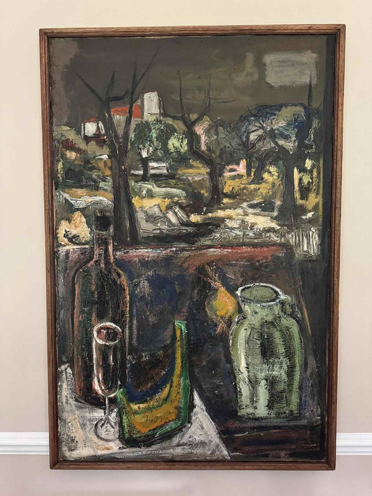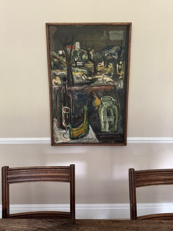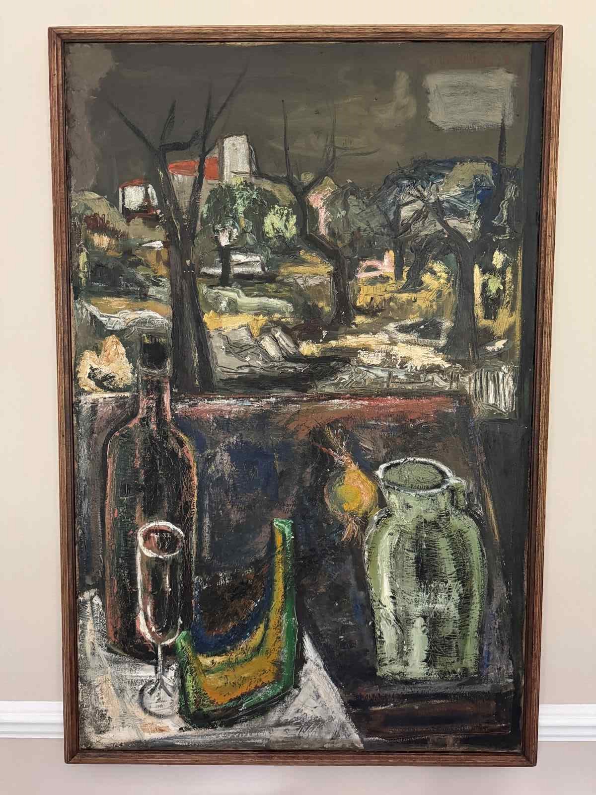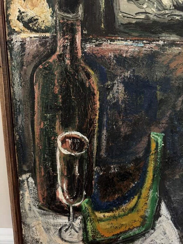 Impressive Post Expressionist French 1960’s still life painting. Original frame. Minor surface cracks.