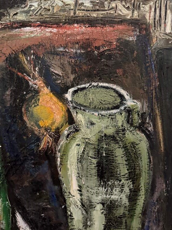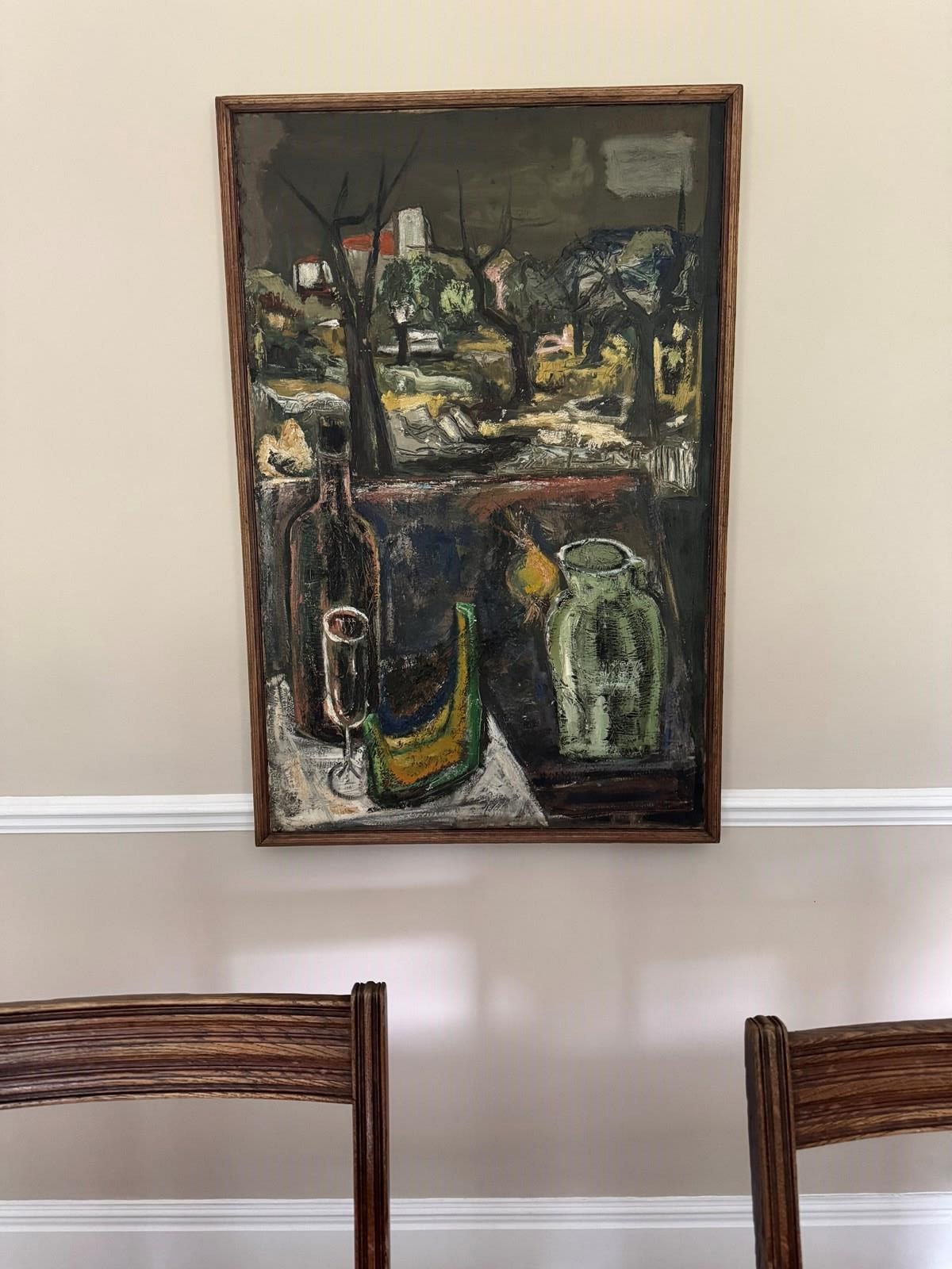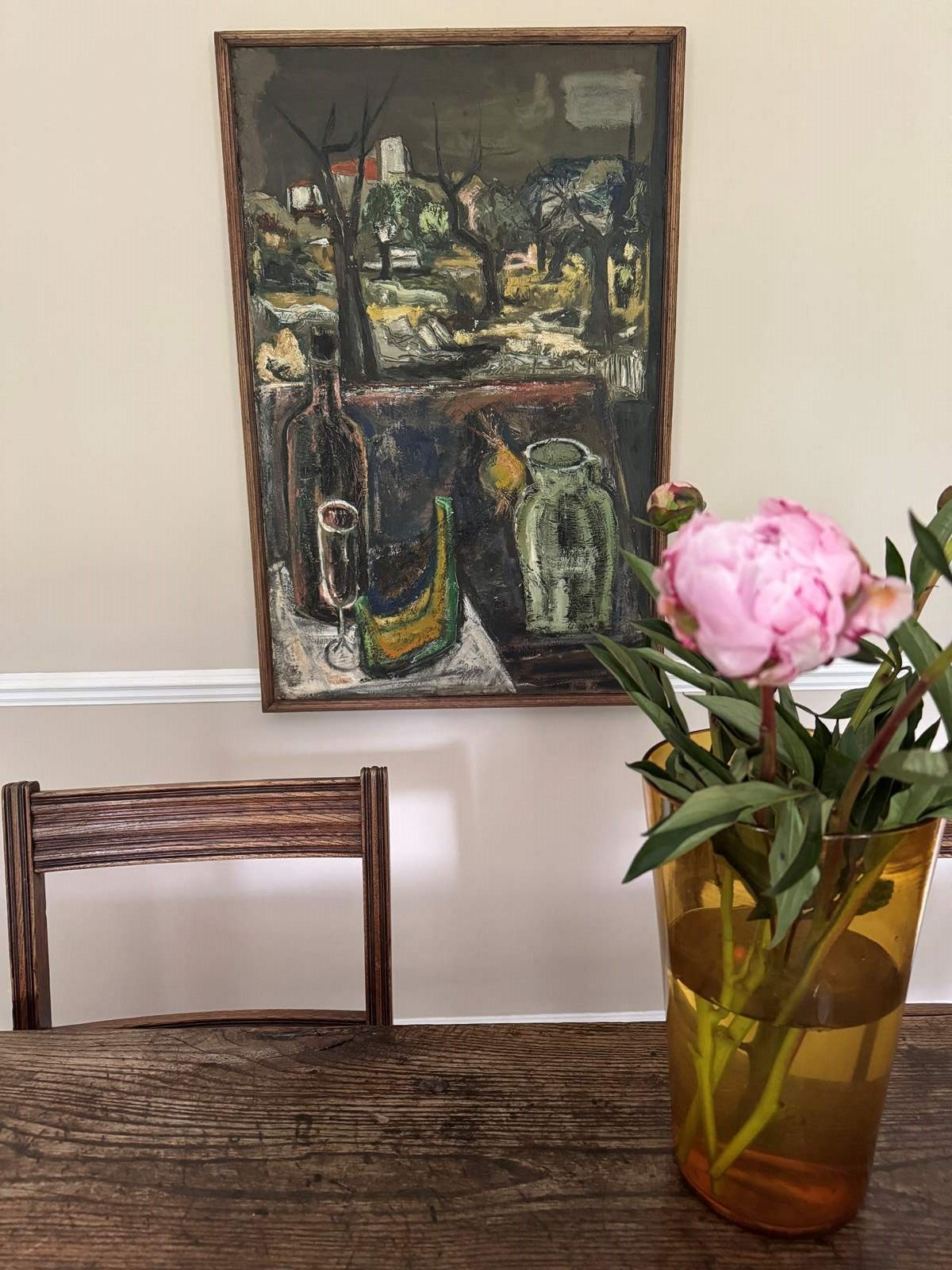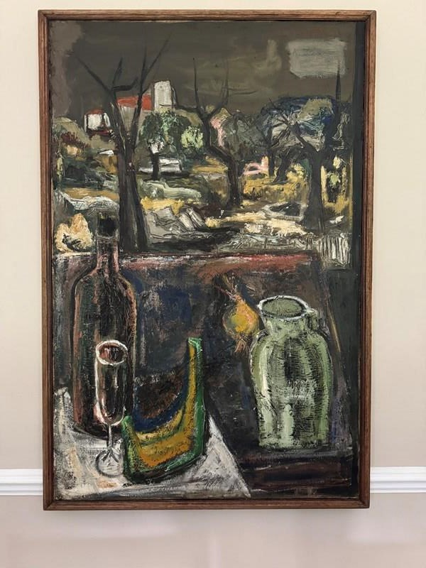 Impressive Post Expressionist French 1960’s still life painting. Original frame. Minor surface cracks.