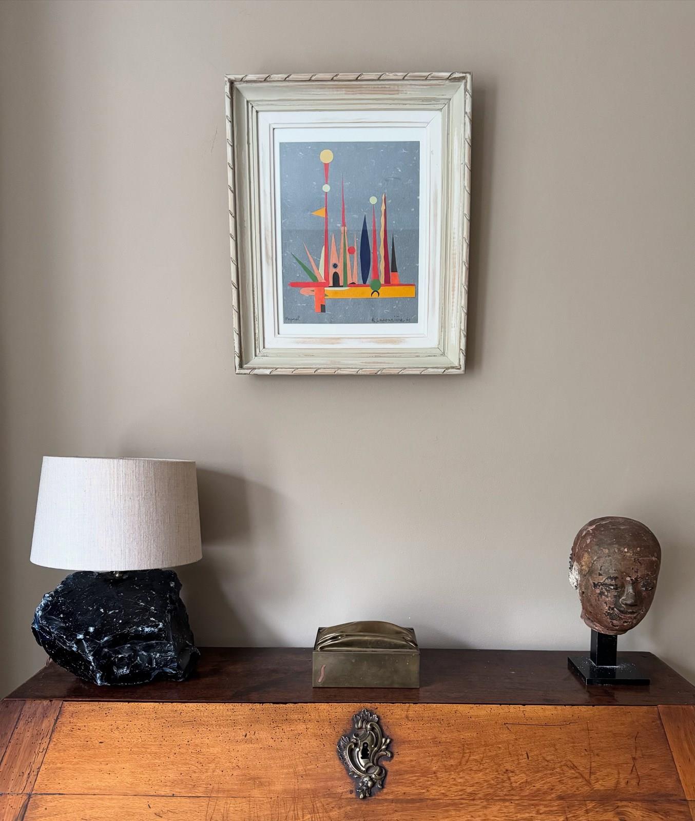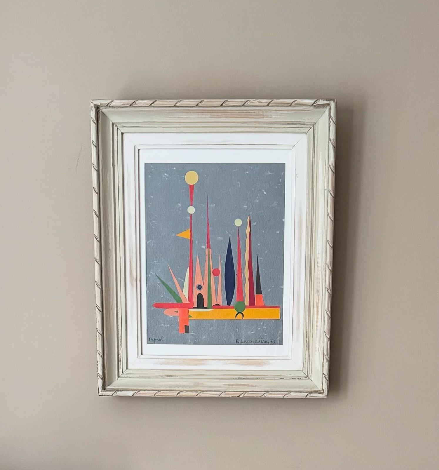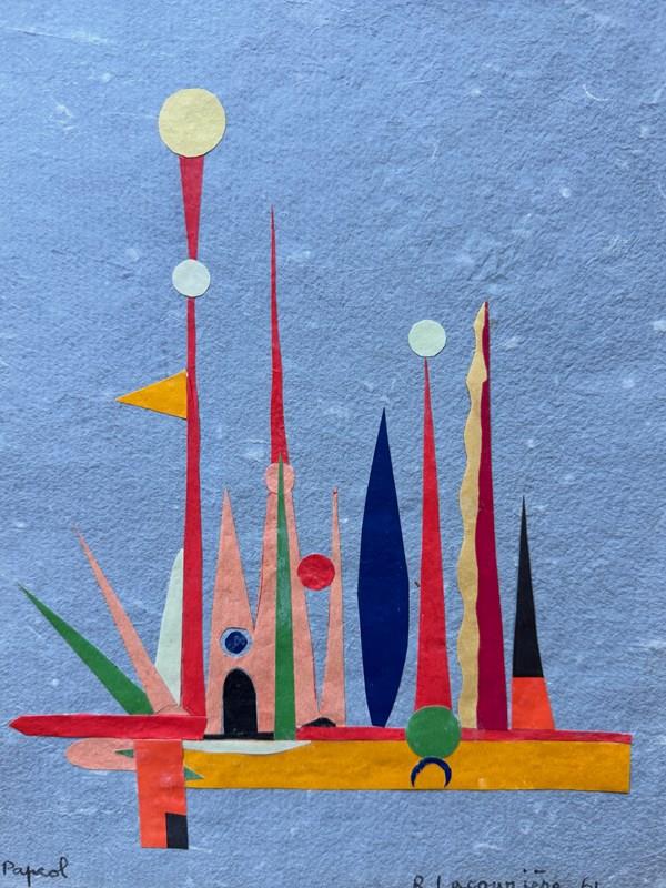 French 1960’s abstract collage by R Lacouriere dated 1961. Underglaze.