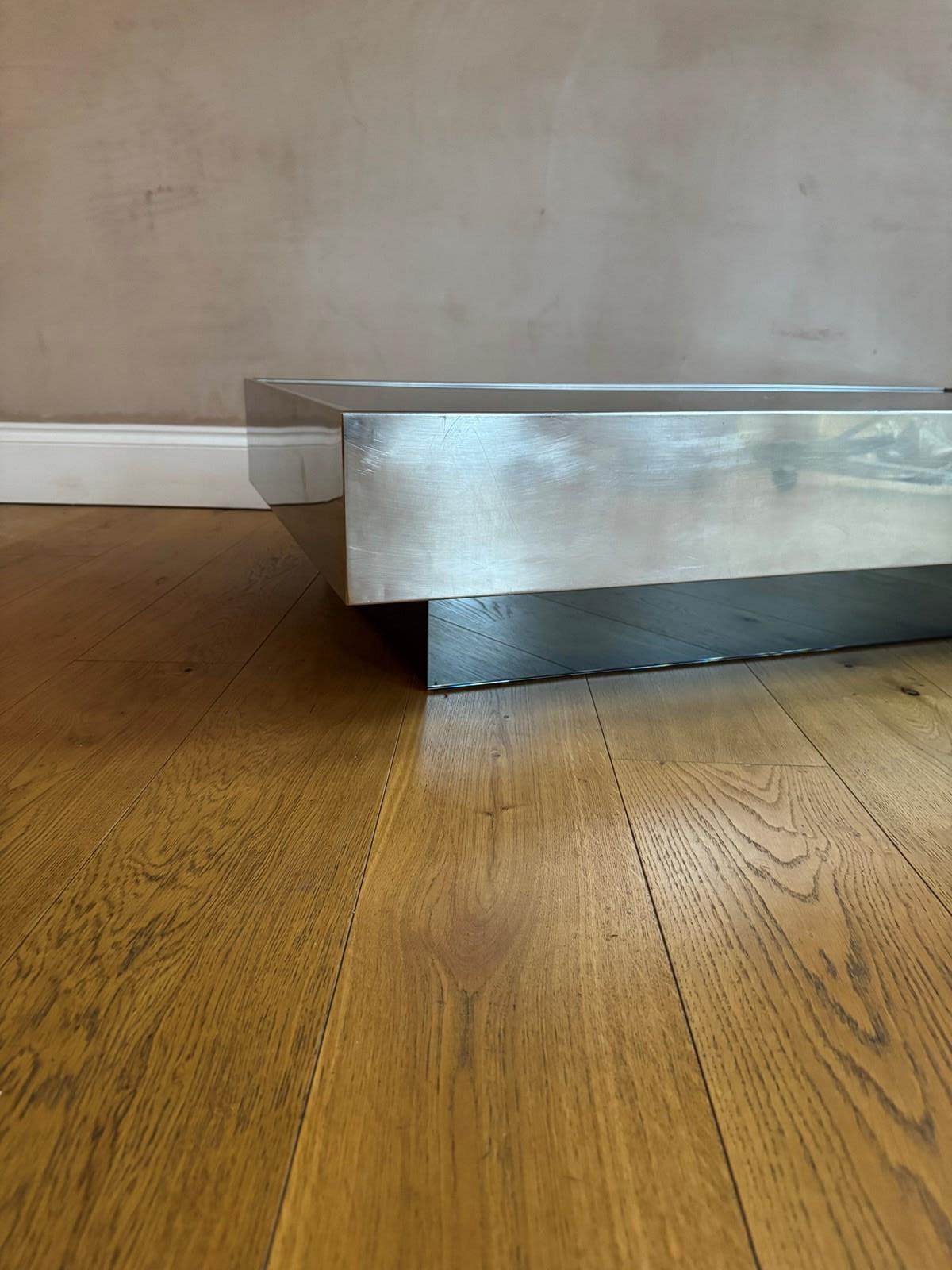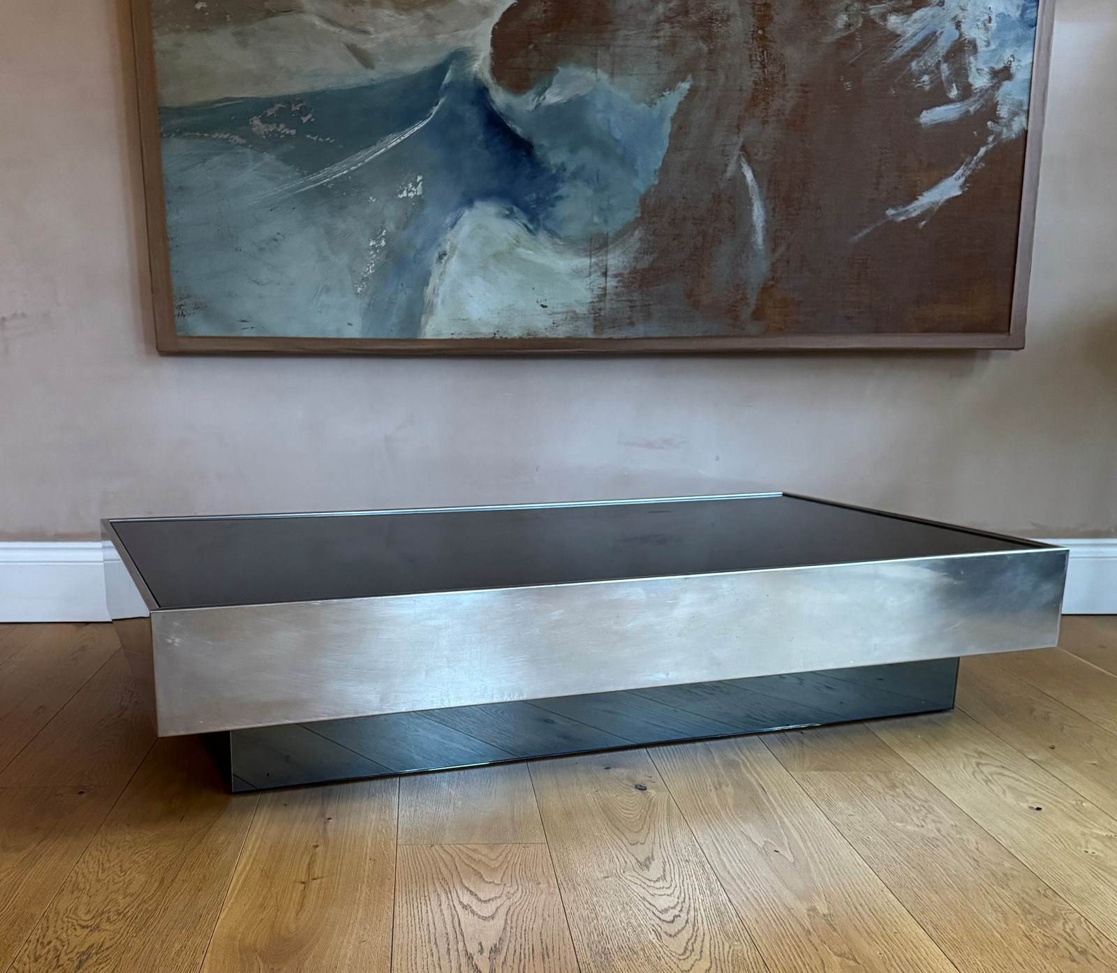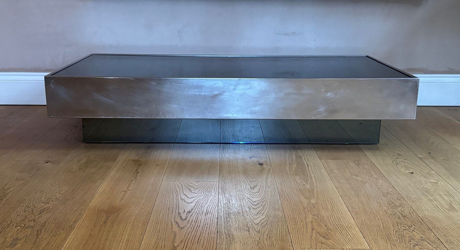 A rectangular mirrored and glass, brushed steel low coffee table. French c.1970’s. Some surface scratches to the mirrored top but otherwise and really great looking table.
