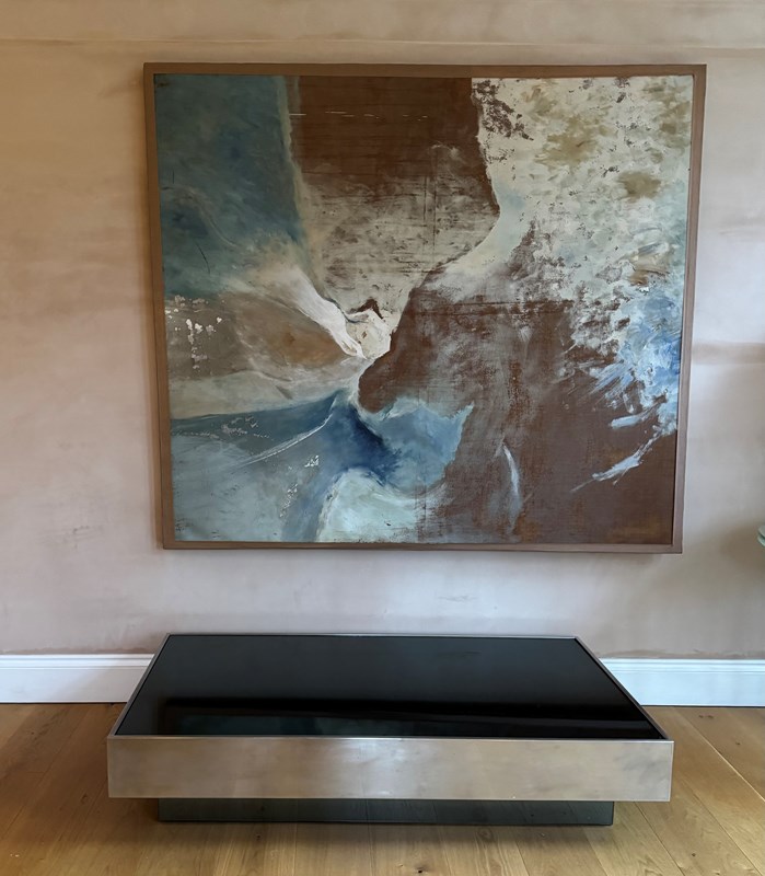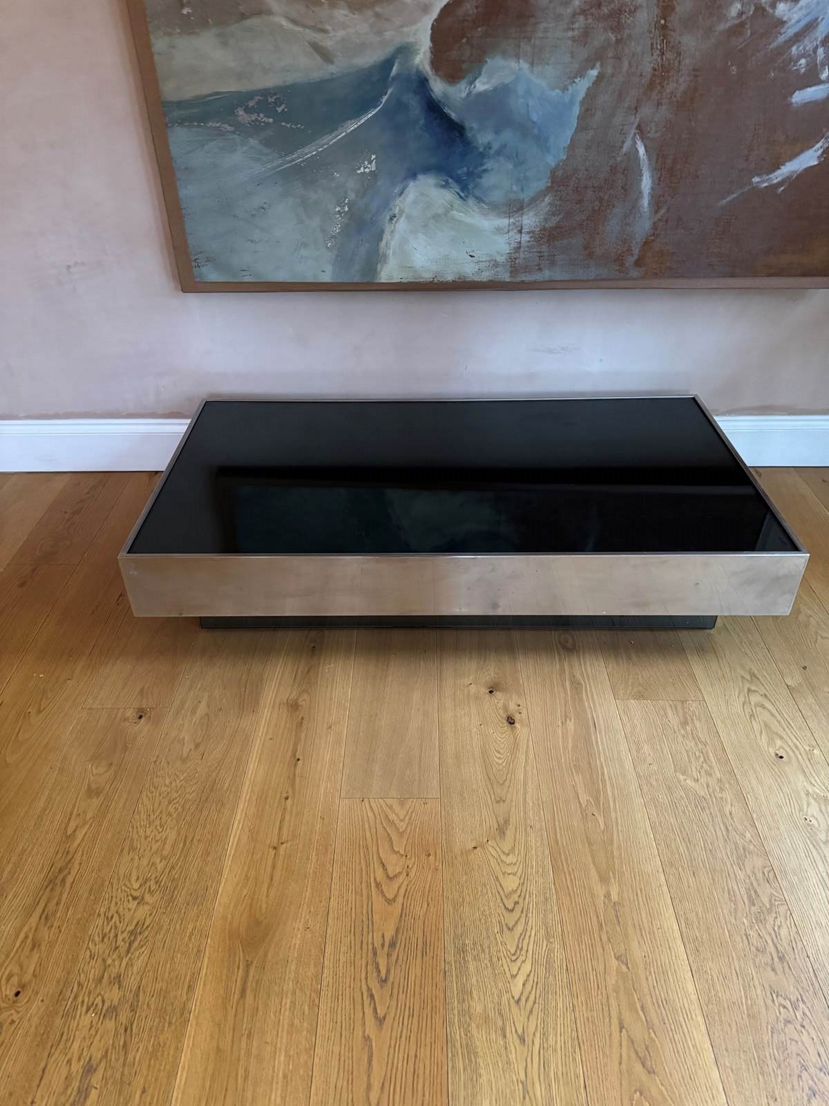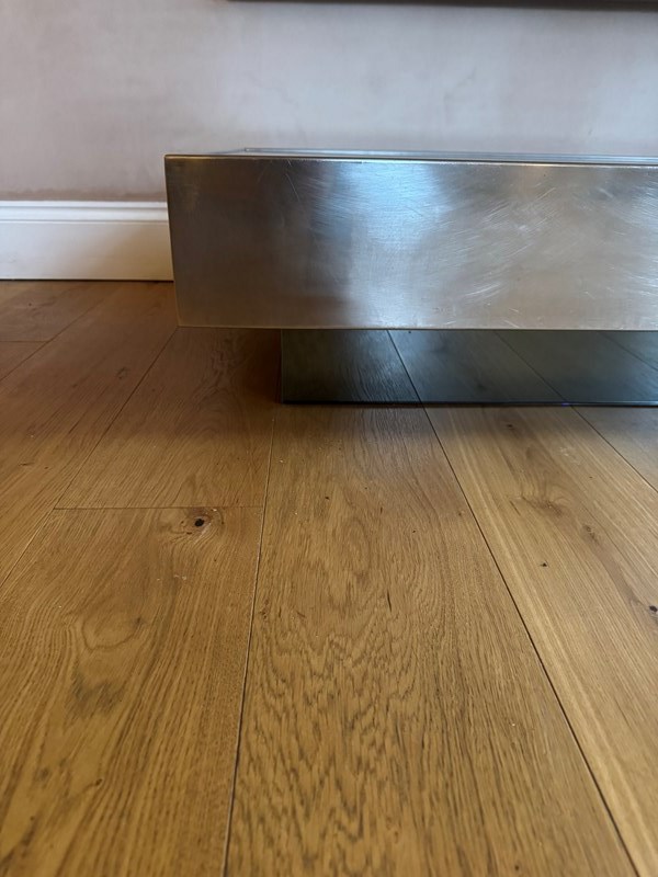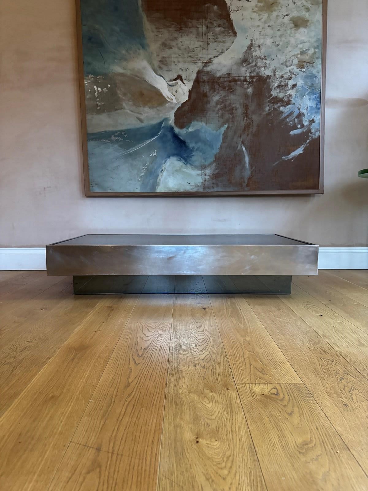 A rectangular mirrored and glass, brushed steel low coffee table. French c.1970’s. Some surface scratches to the mirrored top but otherwise and really great looking table.
