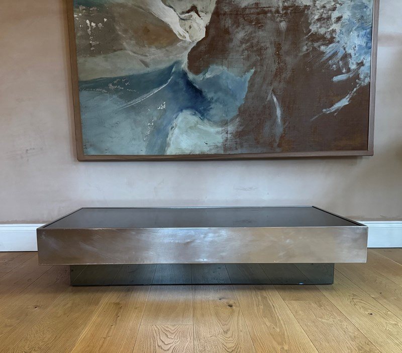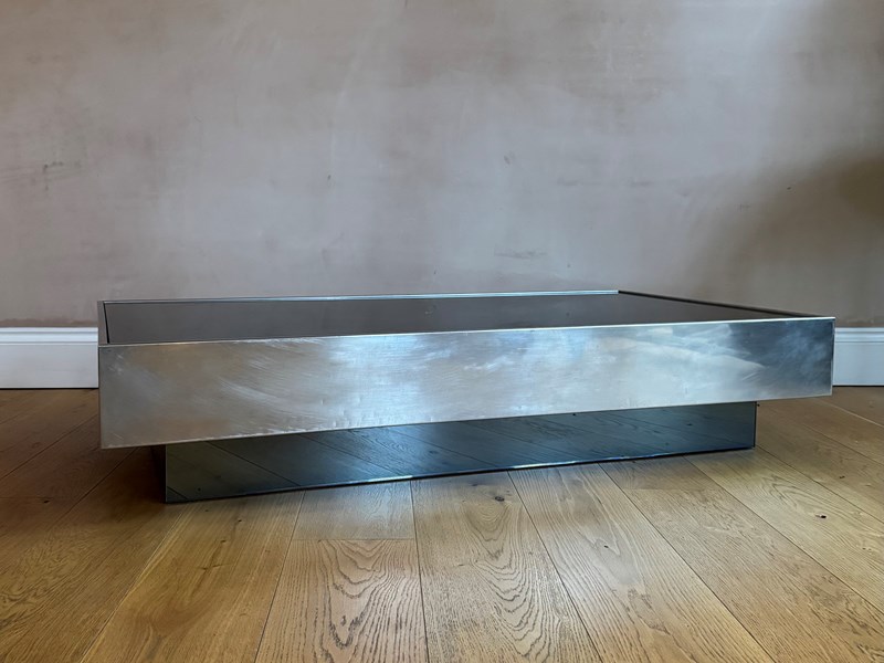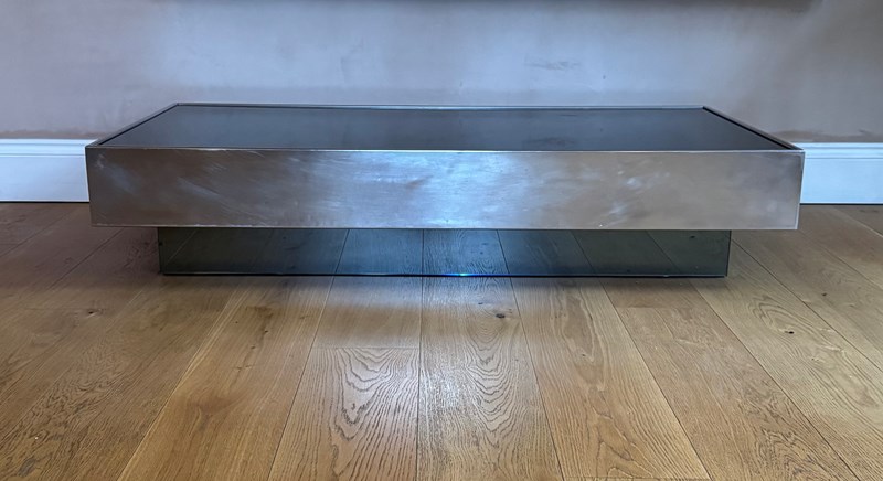 French 1970’S Steel And Mirrored And Glass Low Coffee Table