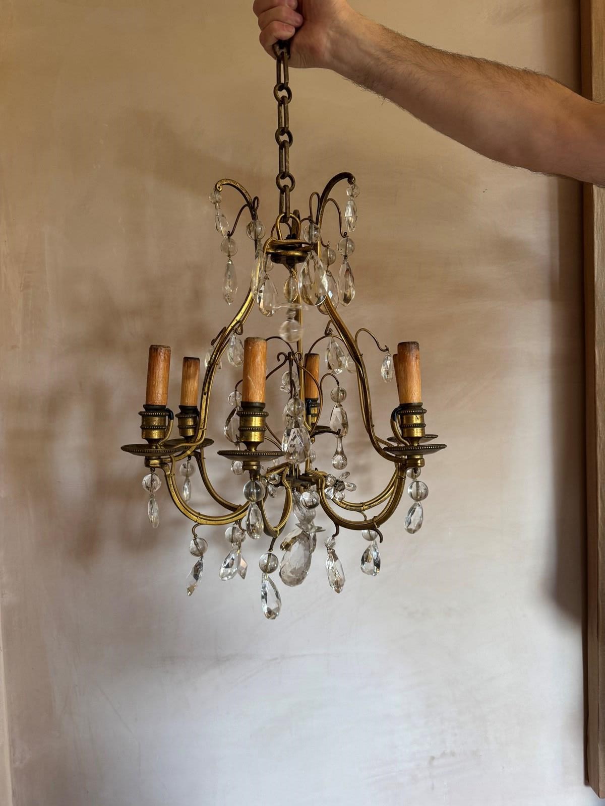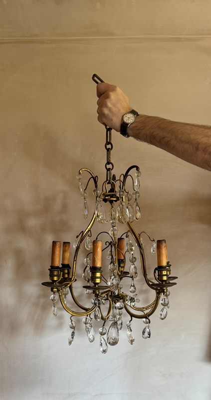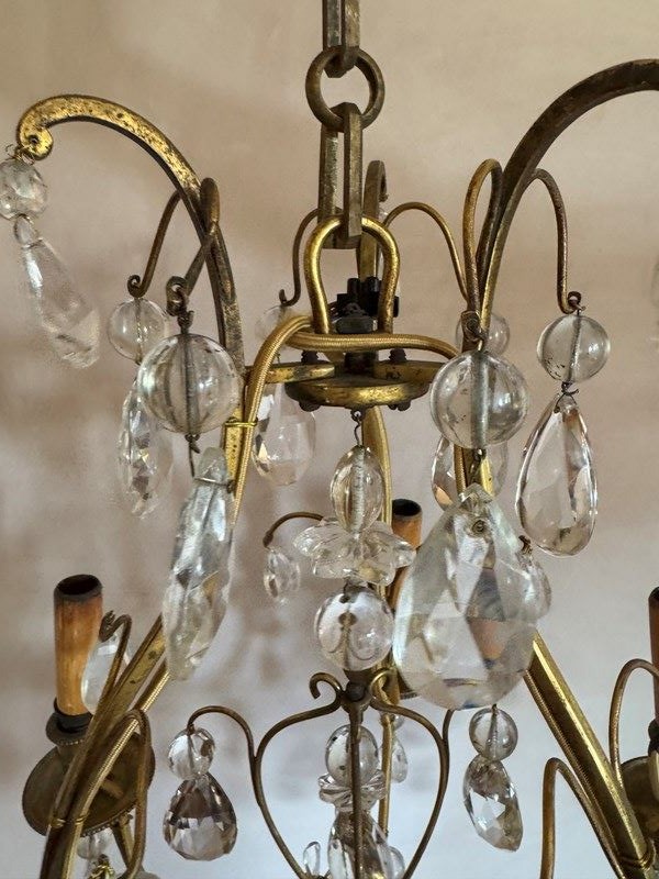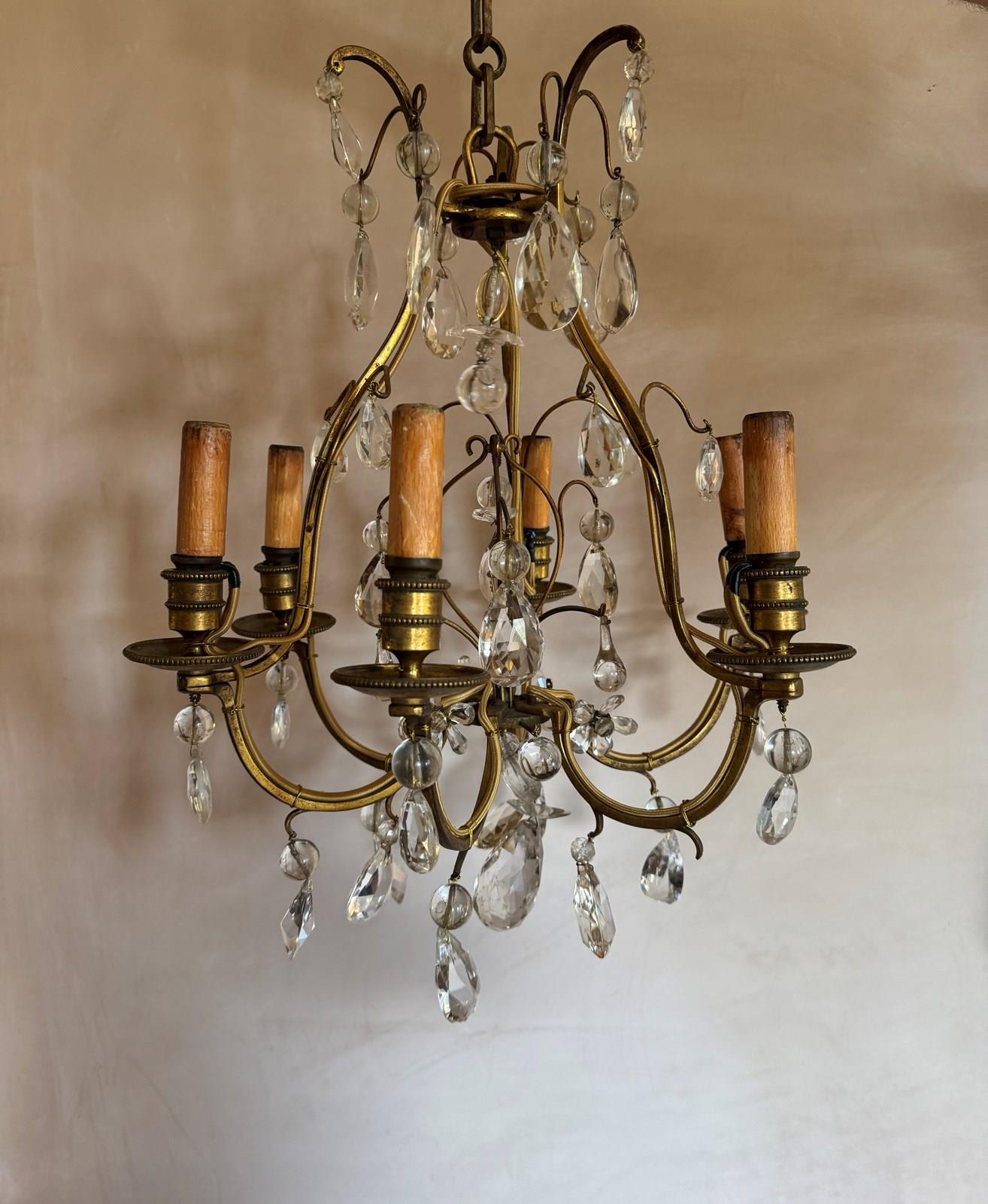 Beautiful 6 branch gilded iron chandelier with glass drops attributed to bagues. Rewired and Pat tested.
