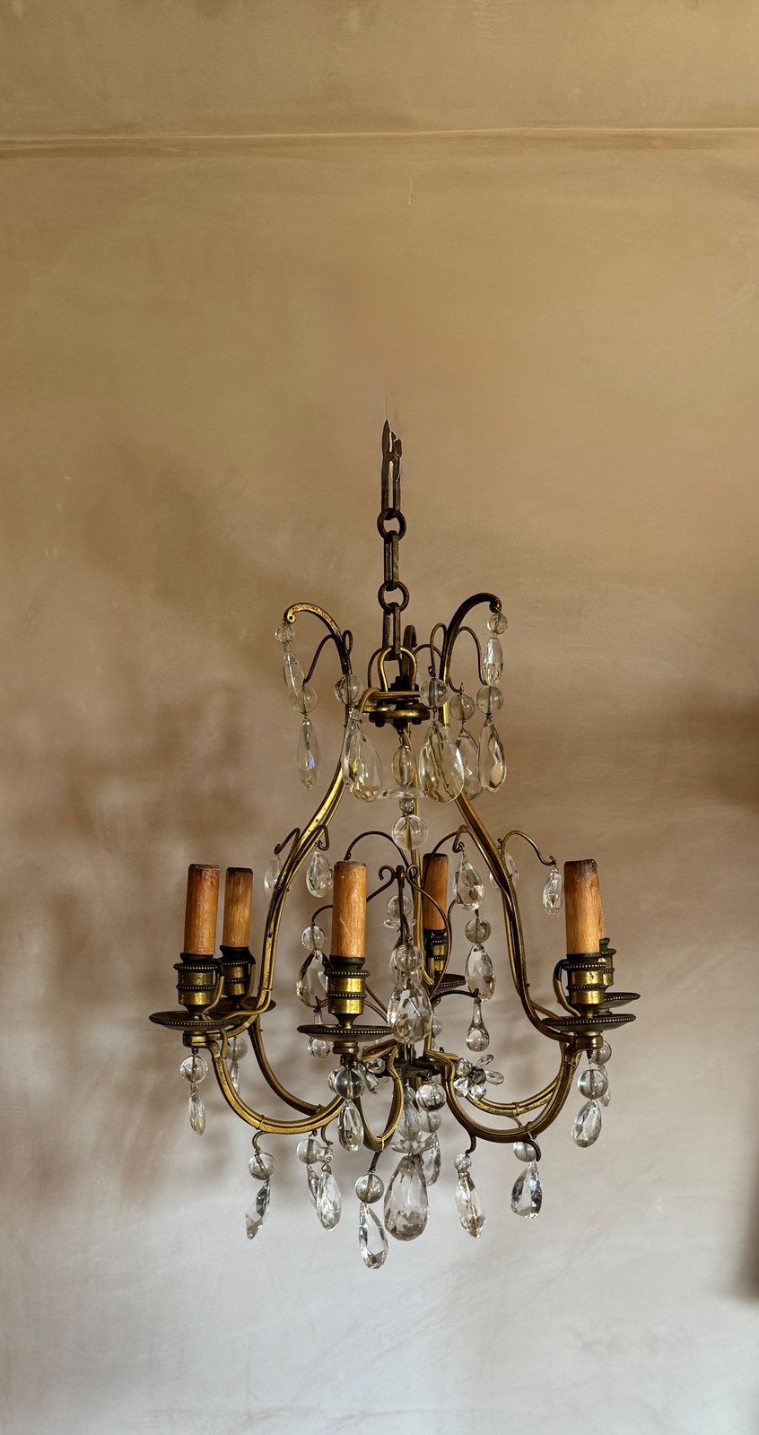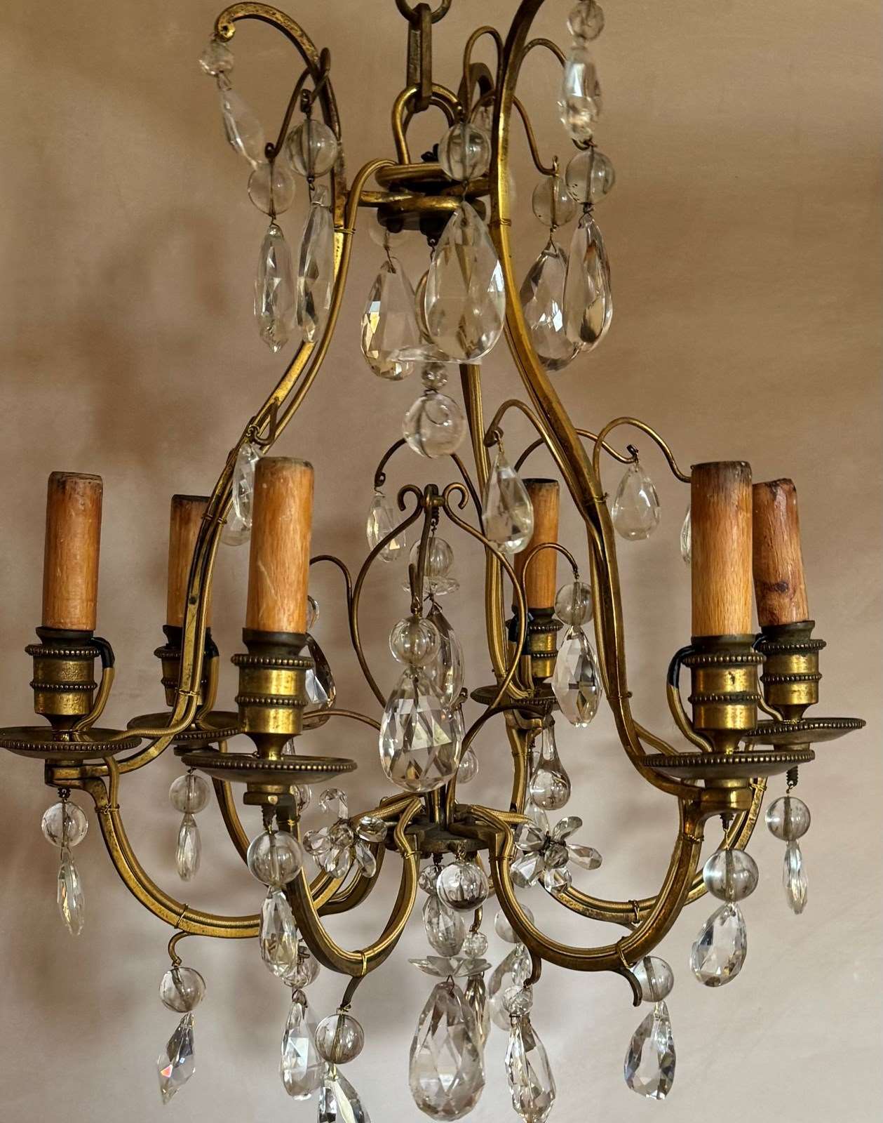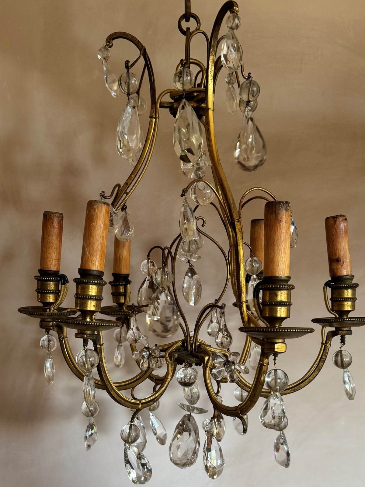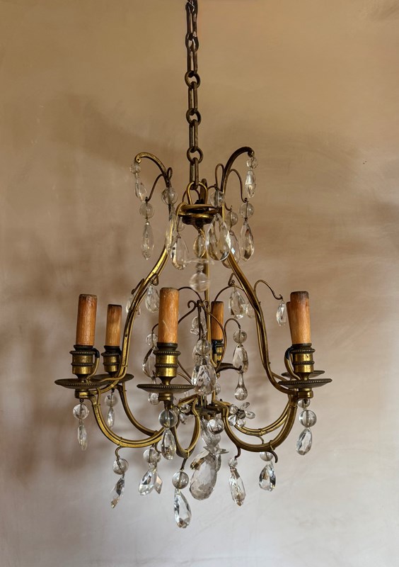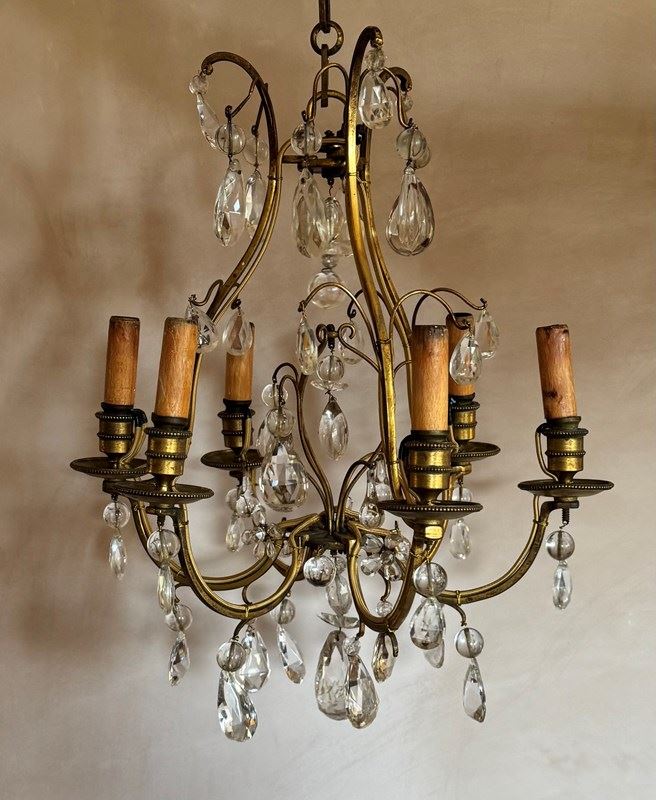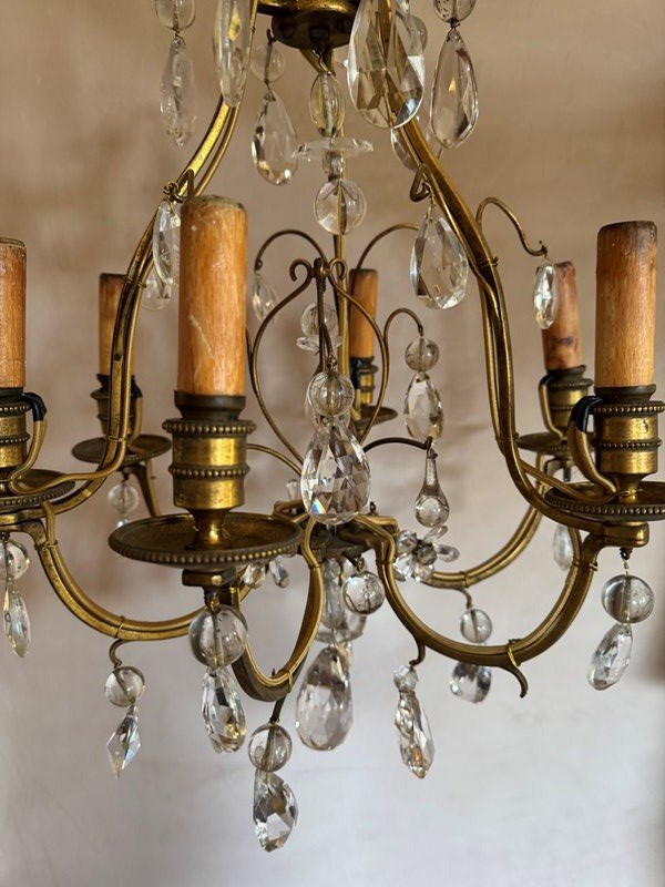 Beautiful 6 branch gilded iron chandelier with glass drops attributed to bagues. Rewired and Pat tested.