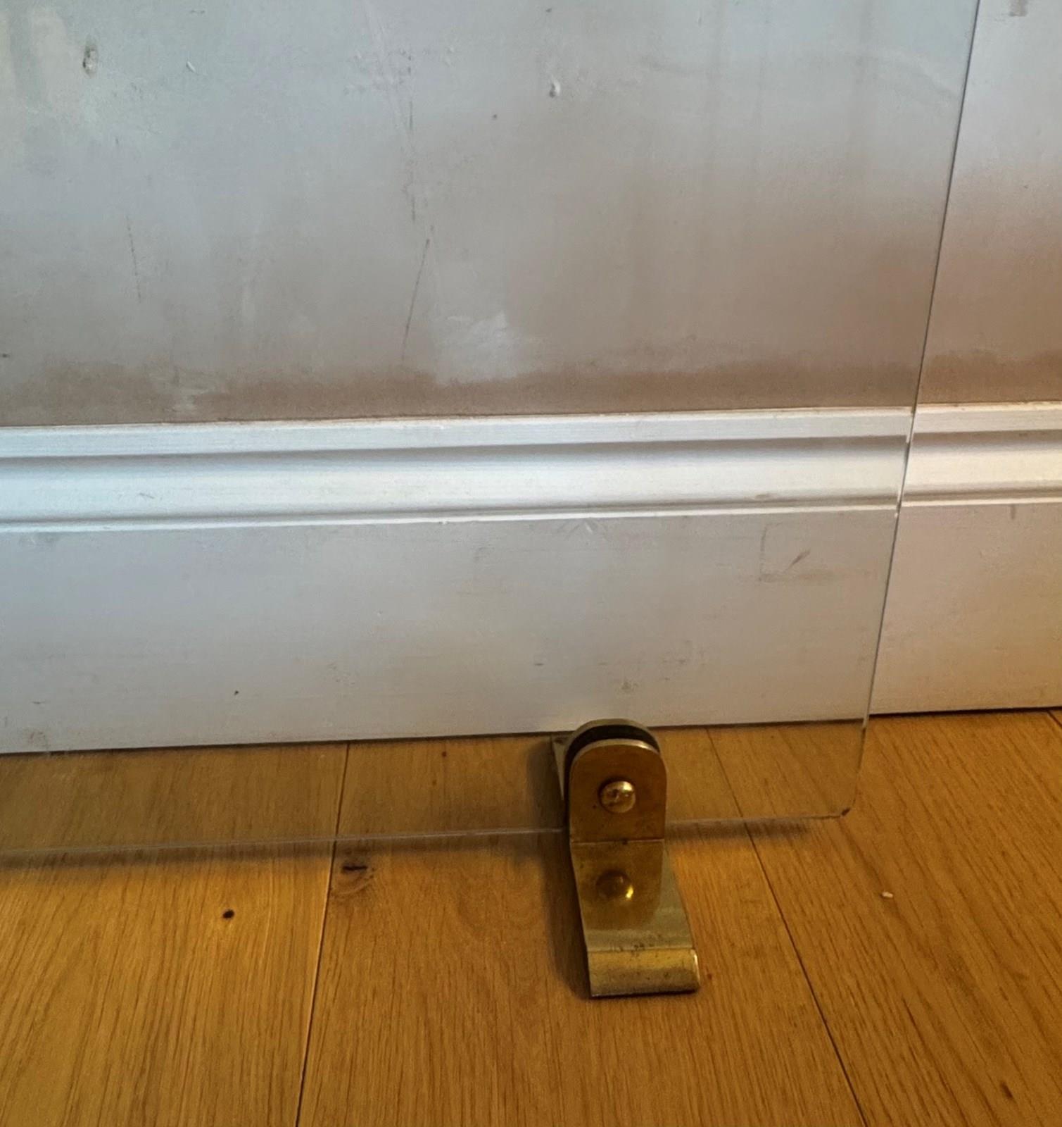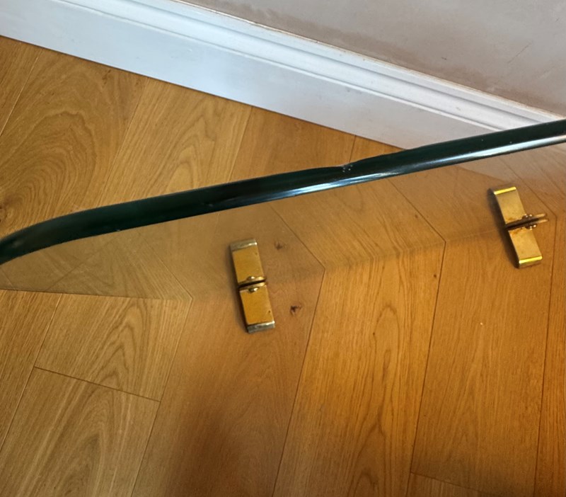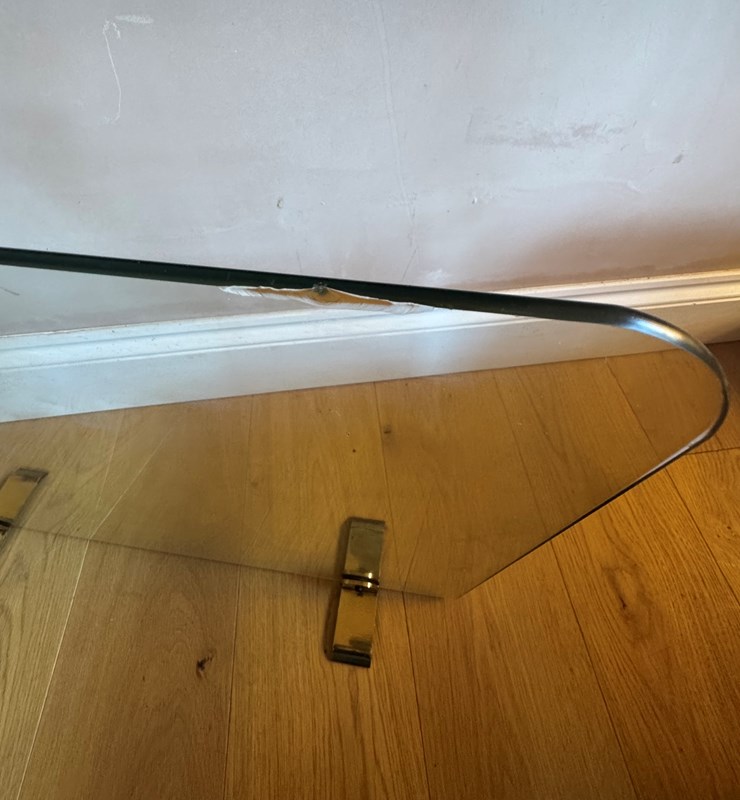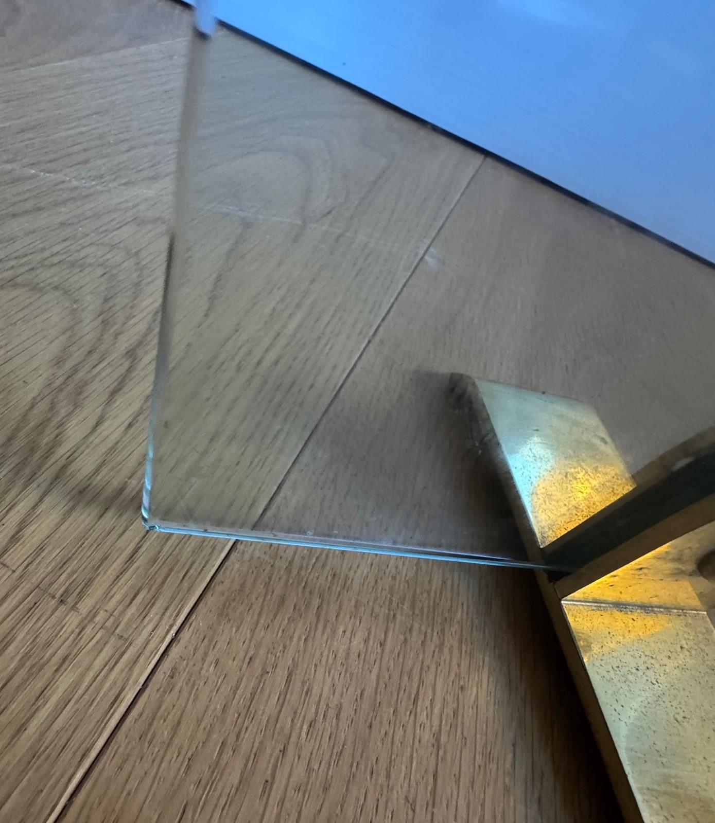 A stunning glass and bronze firescreen in the style of Jacques Adnet. Two small chips, one to the top ( inside so not very visible and one on the bottom corner) both chips have been filed down so soft to touch.