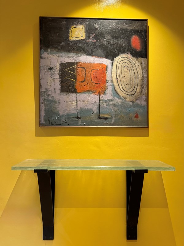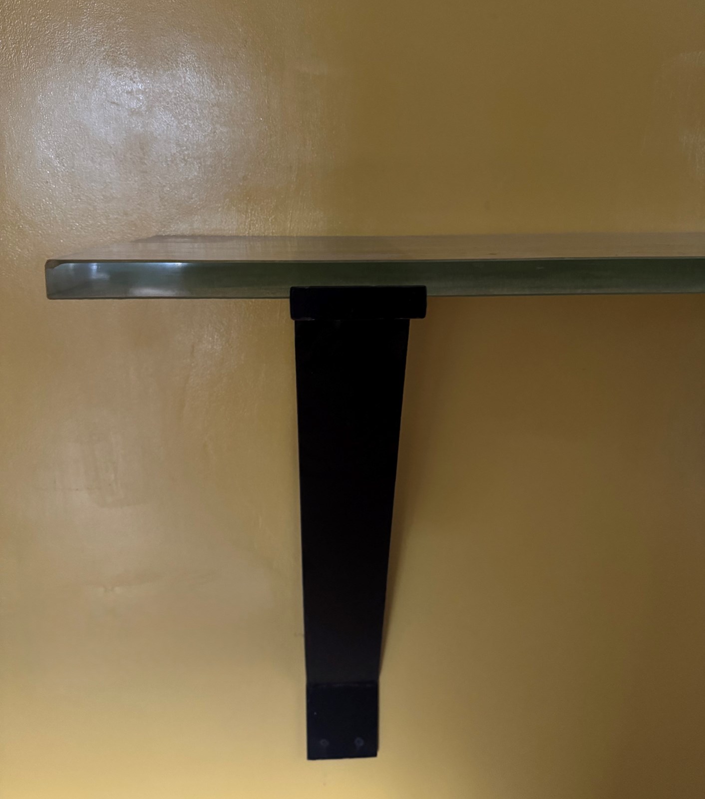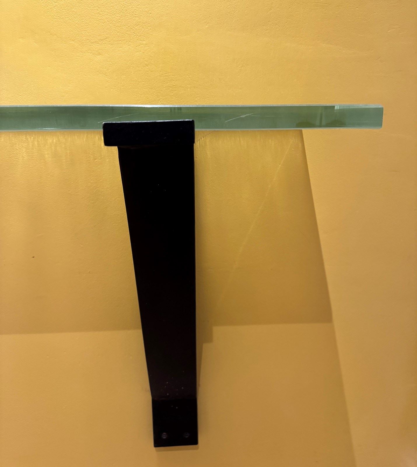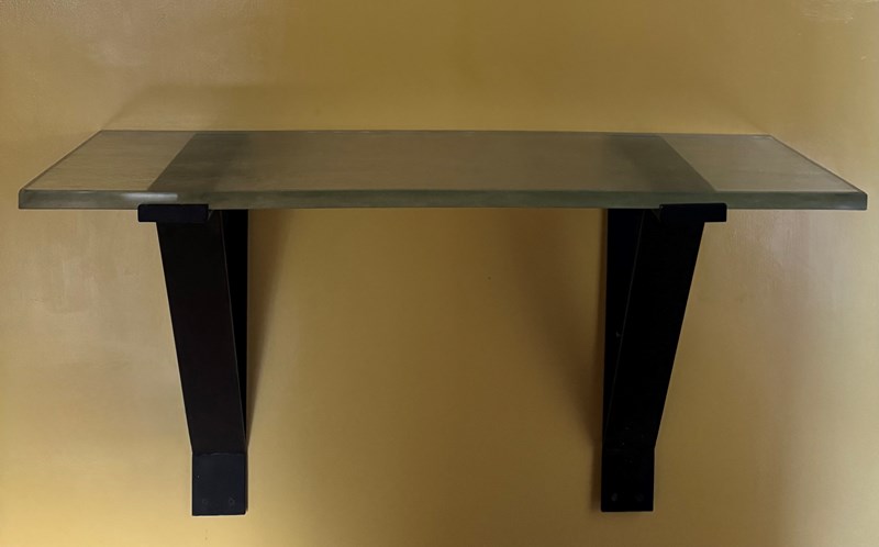 French Saint Gobain glass topped console table on black iron brackets. (Later)