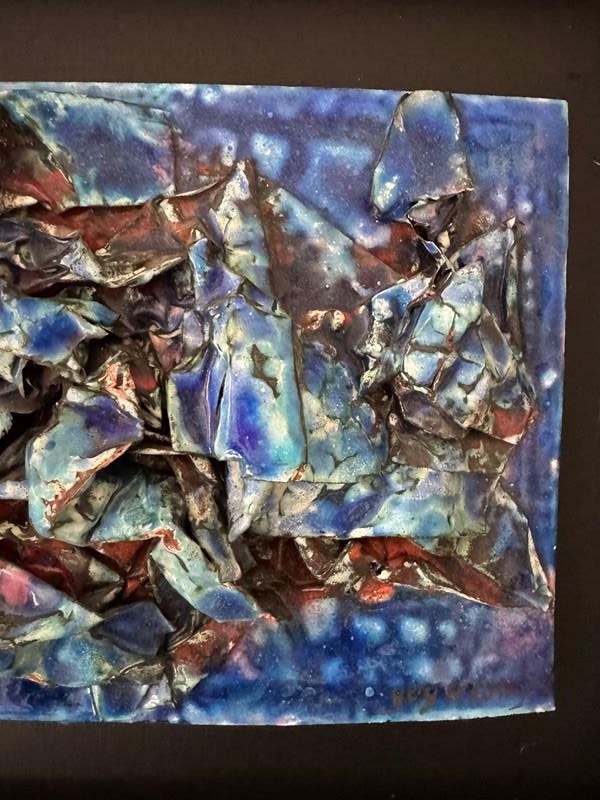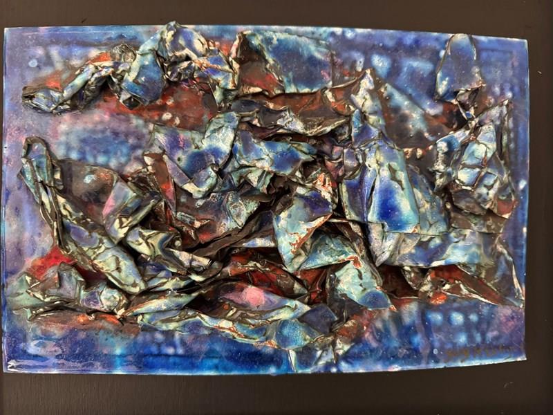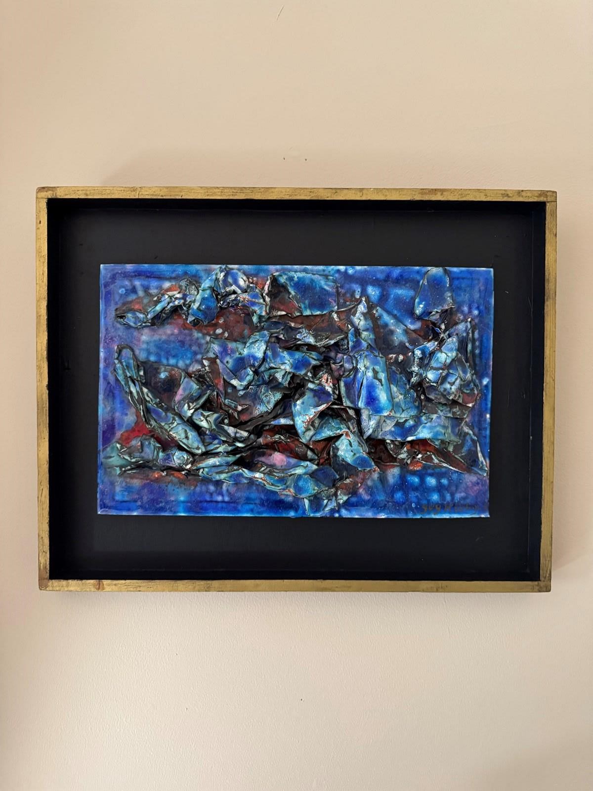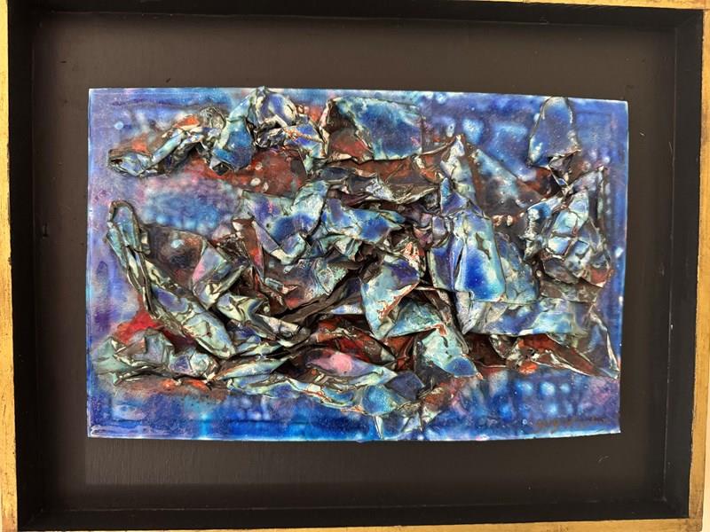Blue abstract relief enamel on copper mounted plaque. Experiment 1, 1966 by Guy Krohg 1917-2002. Minor chips to the enamel, original frame.