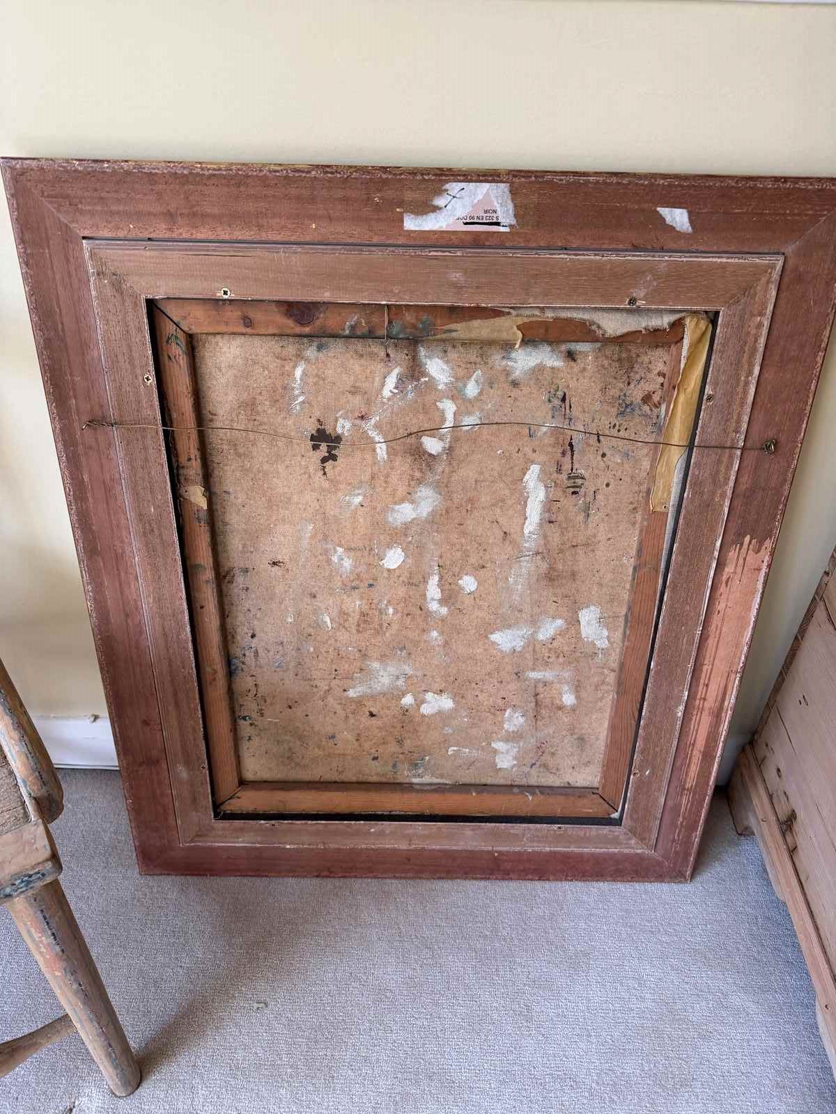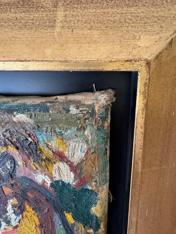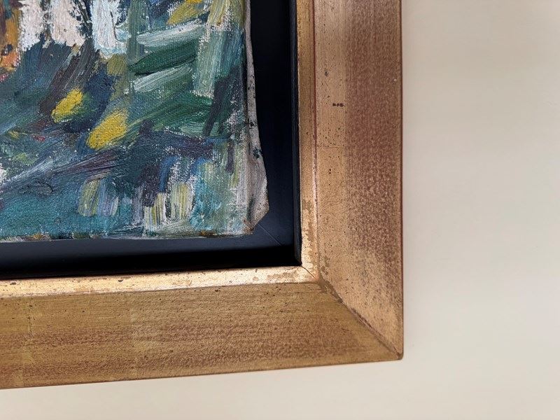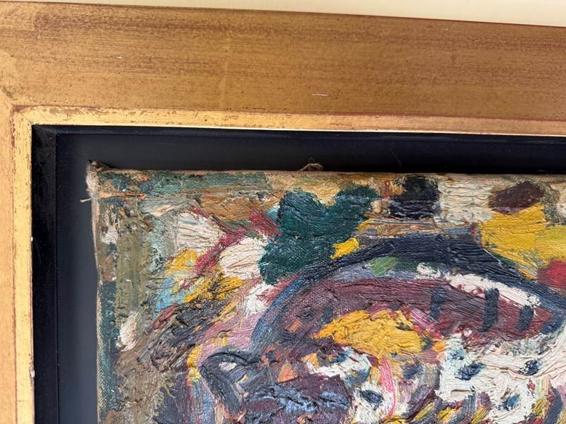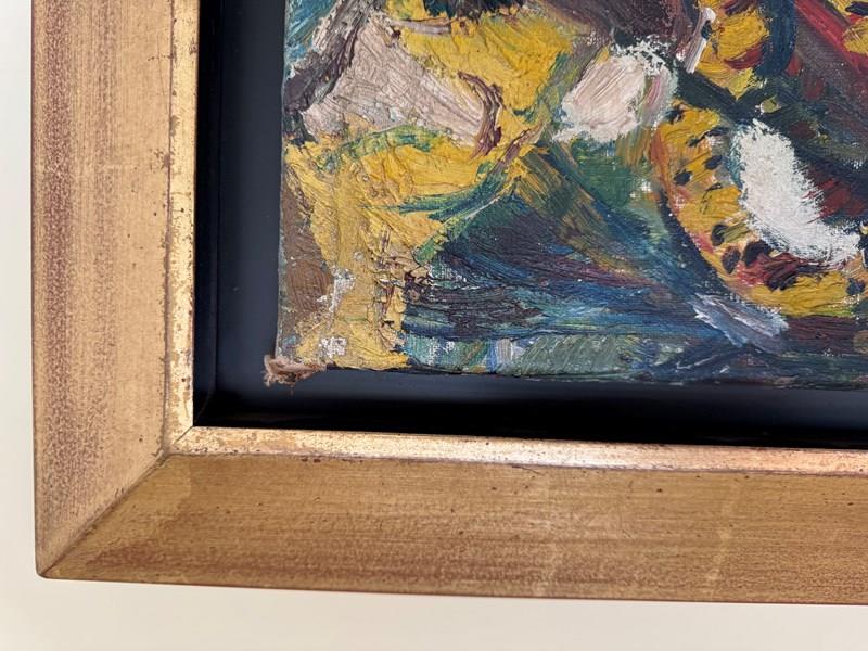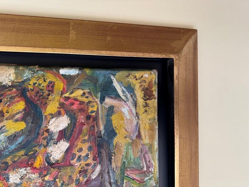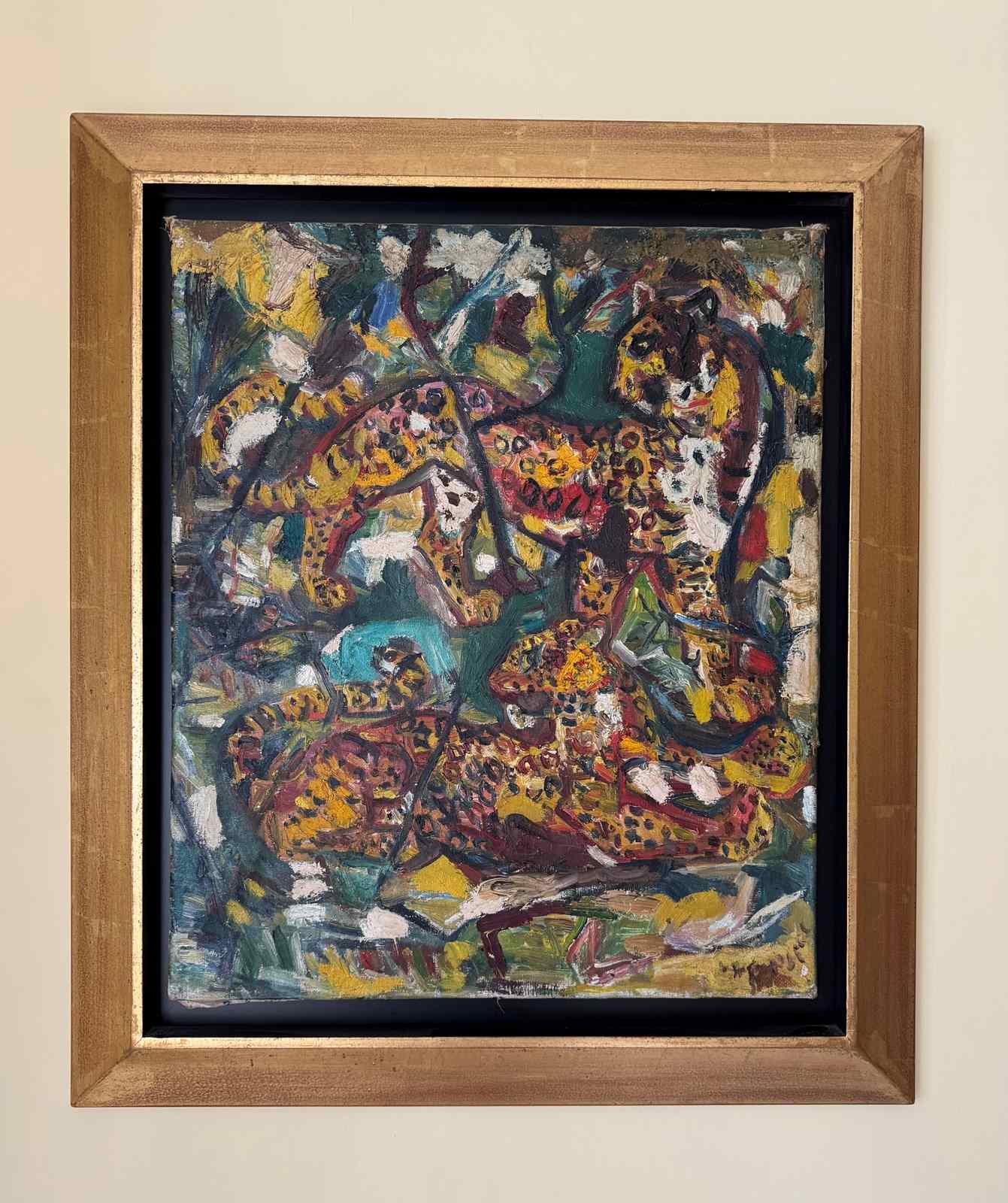 A beautiful Expressionist painting of leopards by Henry Sanders. Henry Sanders ( Helmut Salomon) was born into a Jewish family in Germany. in 1933, he left for Holland and then England where he studied at Hornsey College of Art under Russell Reeve and John Moody. He exhibited at the Redfern Gallery and Roland Browse and Delbaco. The Ben Uri collection in London holds his work. The canvas is damaged on the edges and is missing its linen ribbon tape but the actual canvas in in good condition with minor surface scratches and paint loss. It has been framed with a contemporary gold frame.