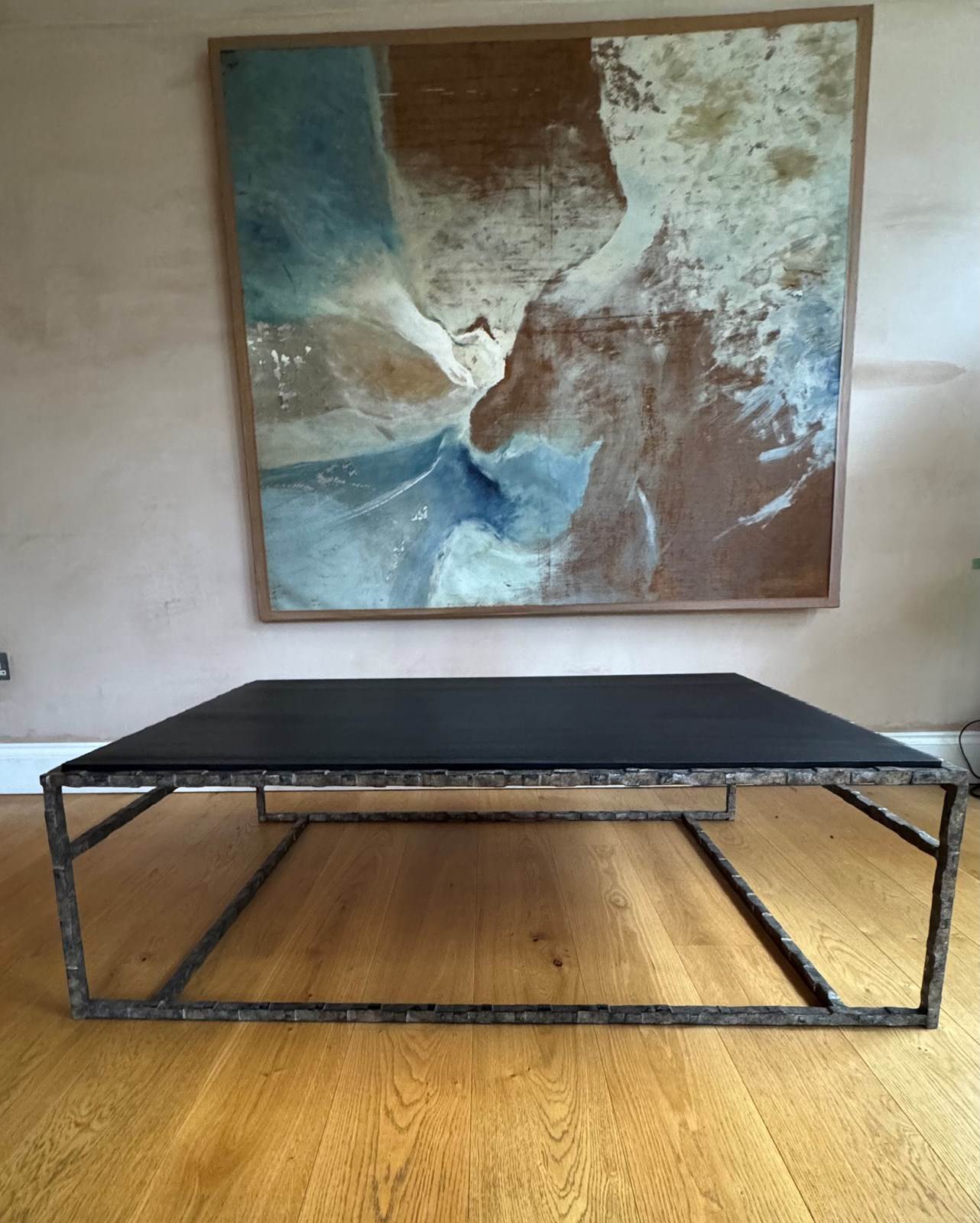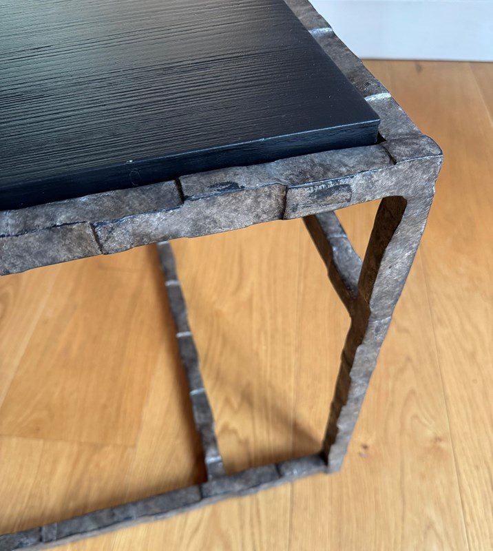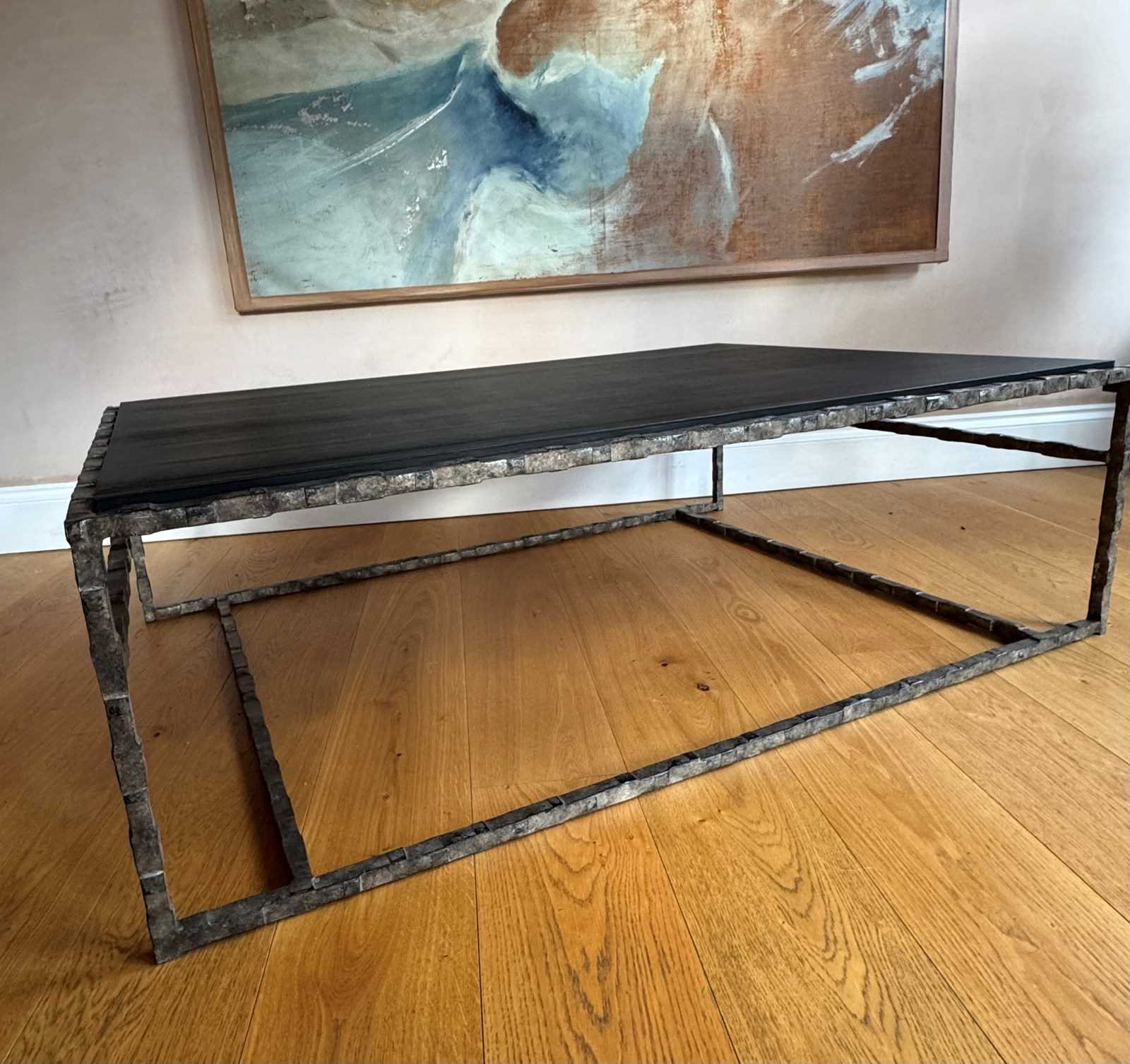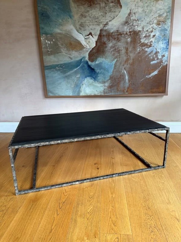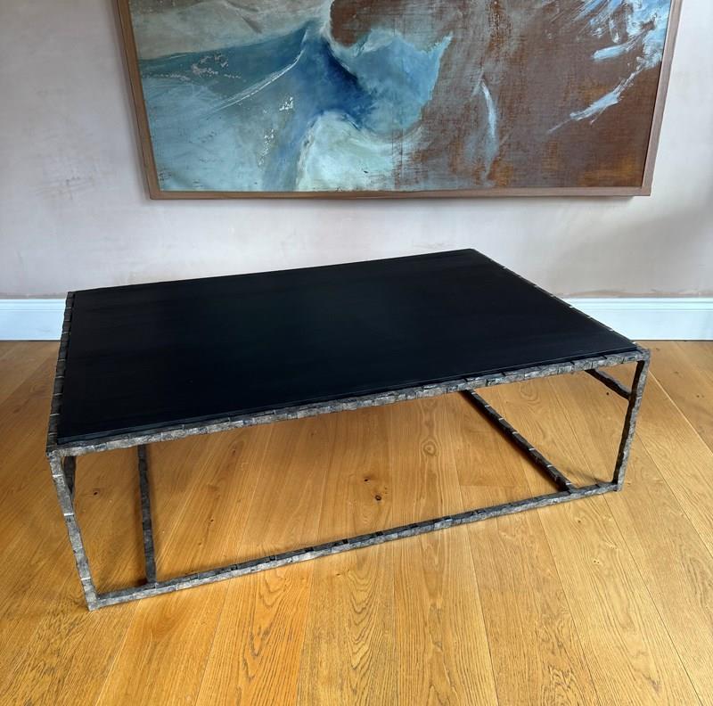 A large Giacometti style coffee table with blackened top similar in style to Bruno Romeda. A contemporary design. Striking coffee table.