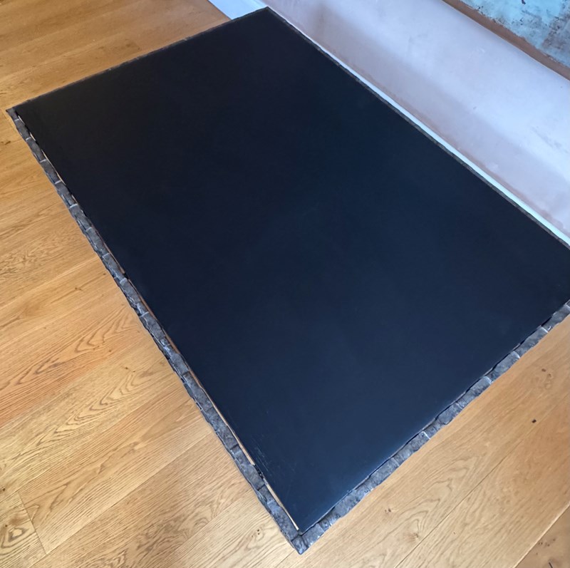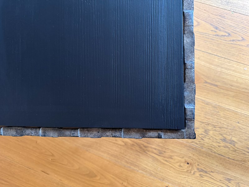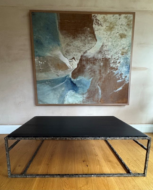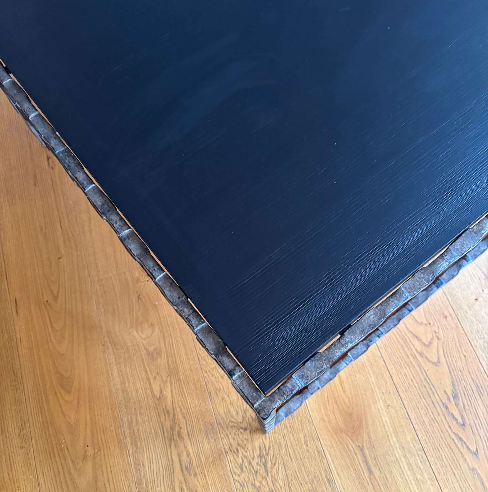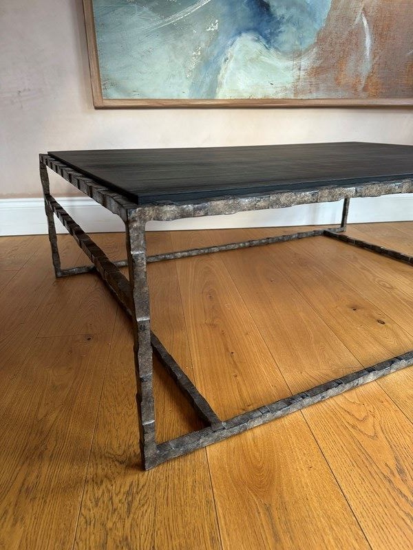 A large Giacometti style coffee table with blackened top similar in style to Bruno Romeda. A contemporary design. Striking coffee table.