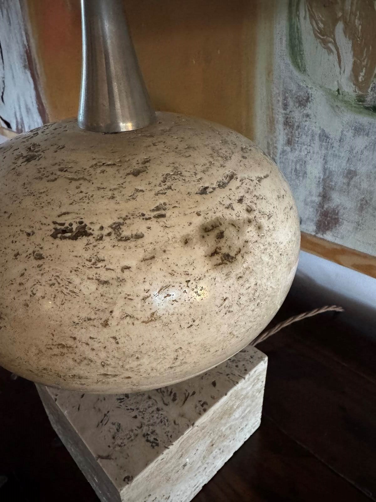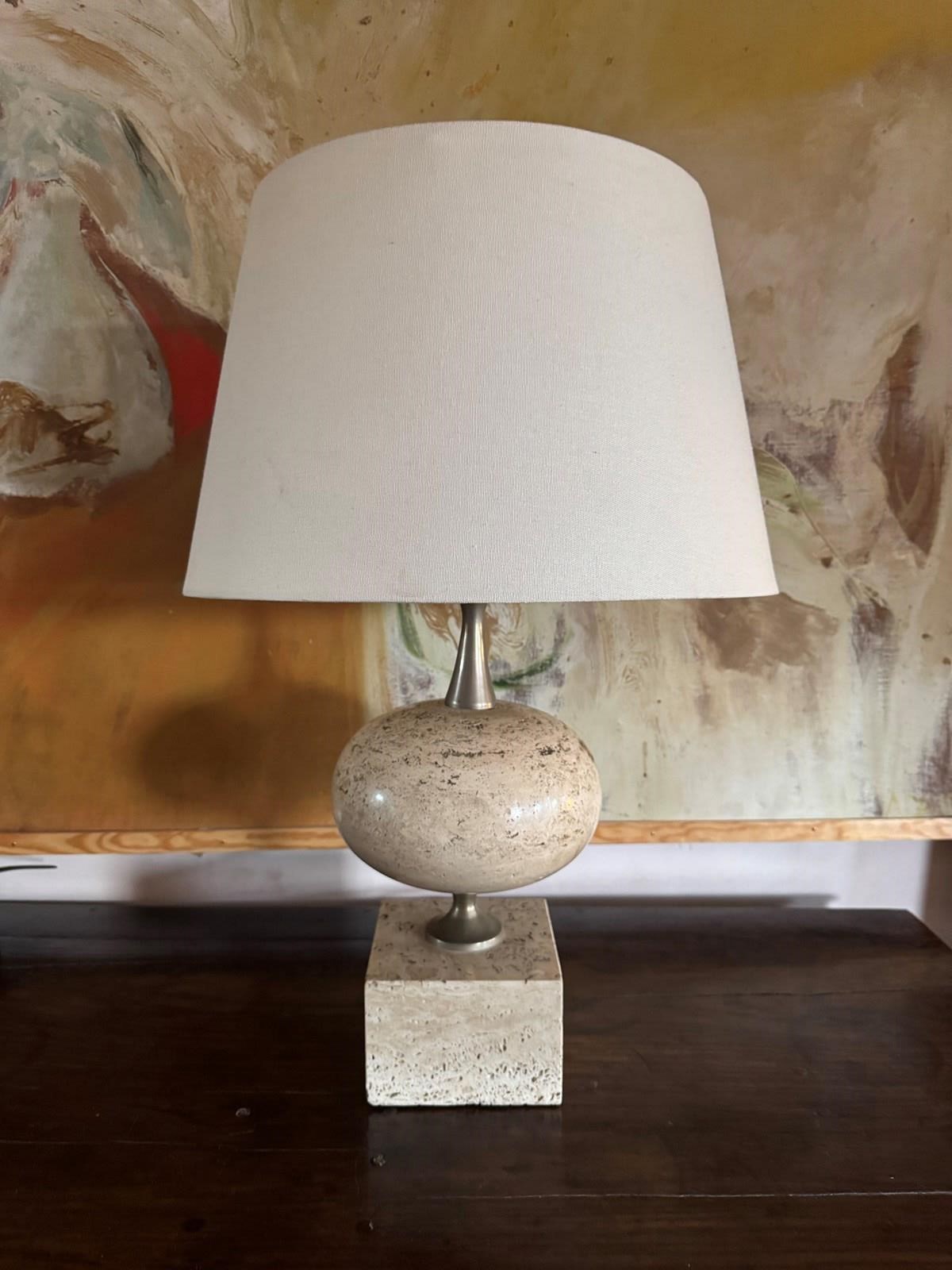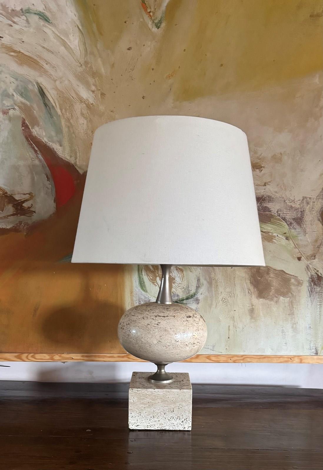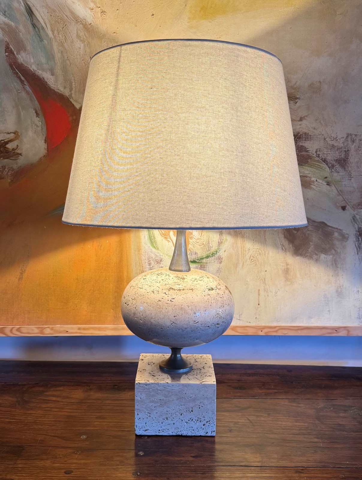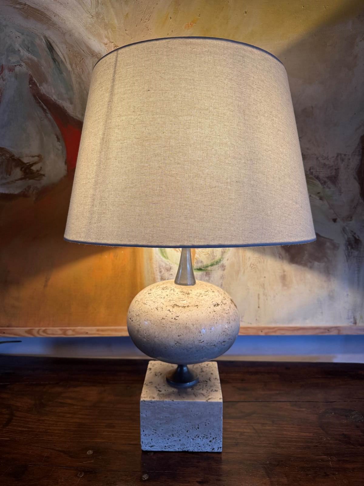 French 1970’s large travertine table lamp by Philippe Barbier, Paris. Rewired & Pat tested. Shade for display. Height to top of shade 67cm.