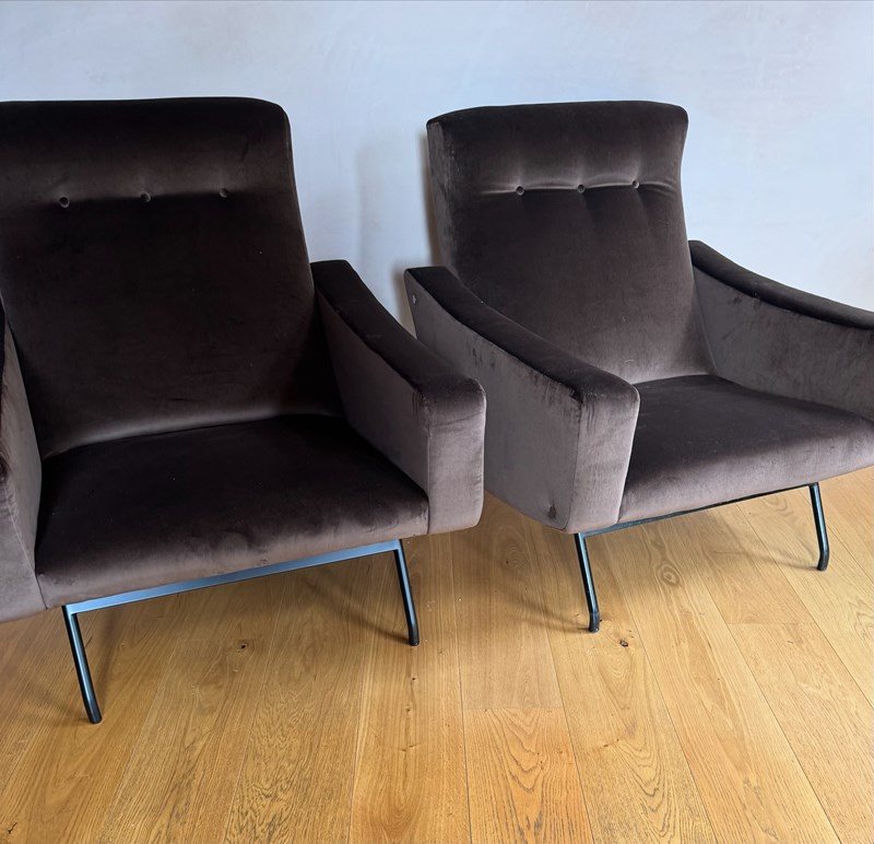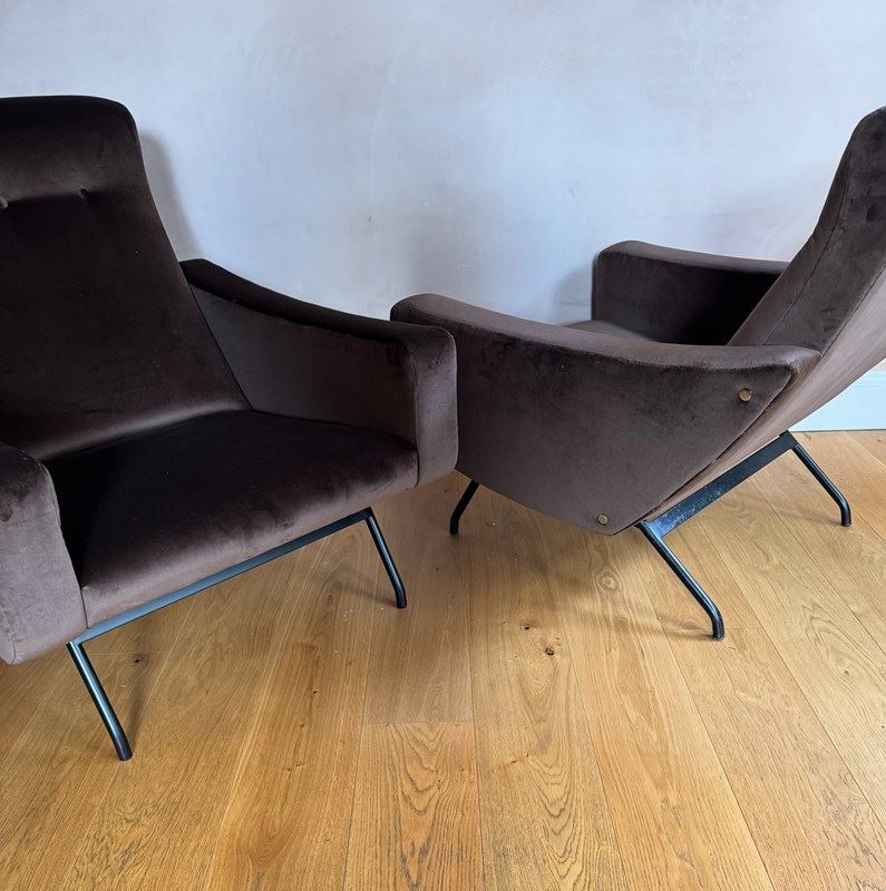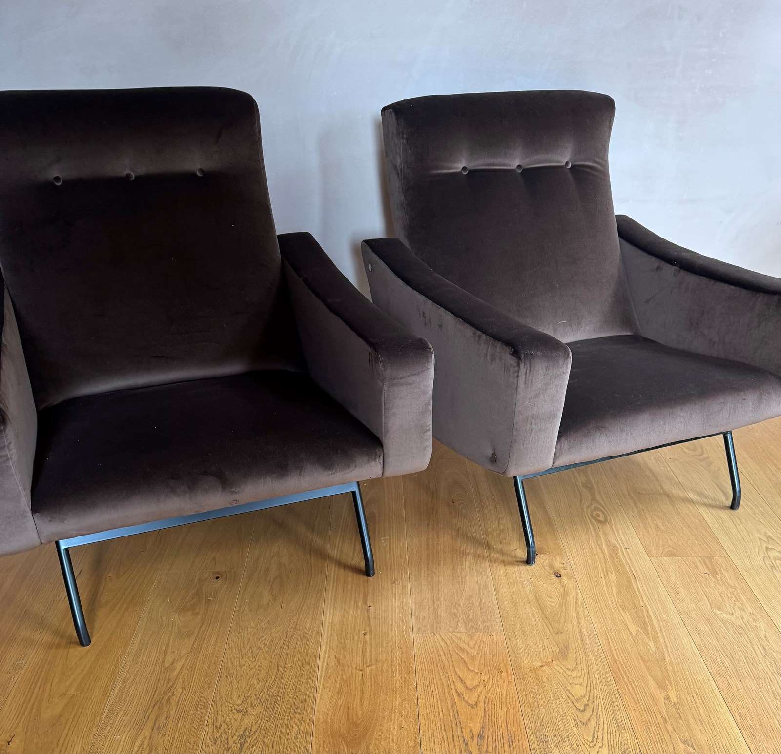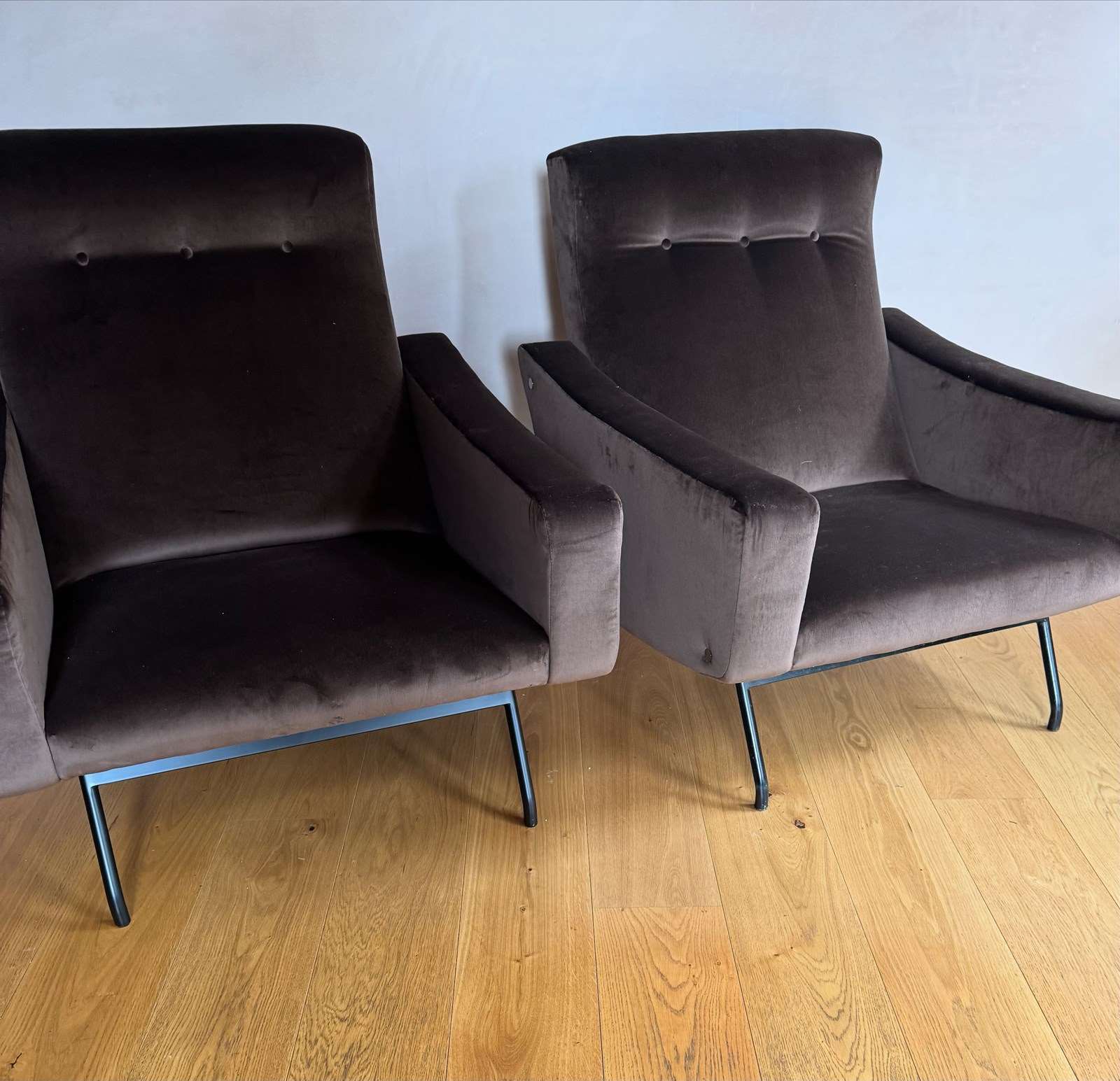 Pair of reupholstered armchairs attributed to Joseph-Andre Motte Galeon model and produced by Steiner. France c.1950’s. Stylish and comfortable with wide deep seat.