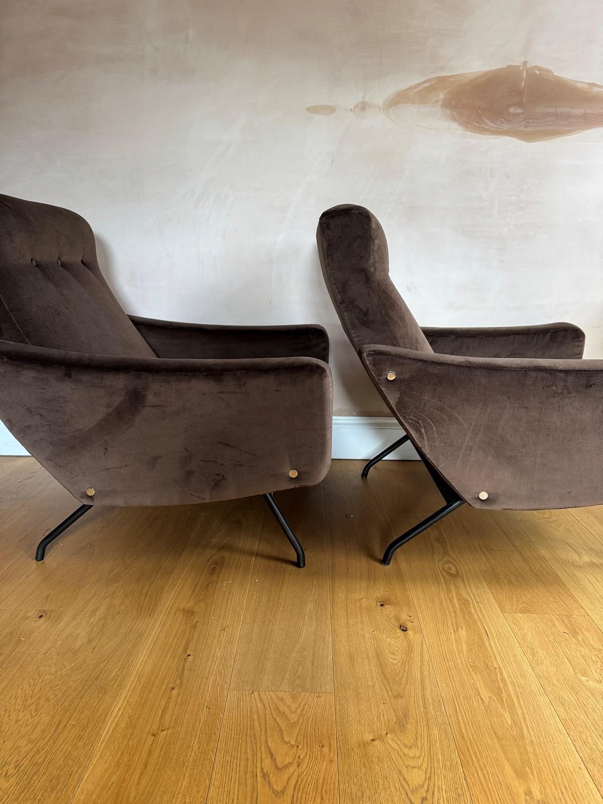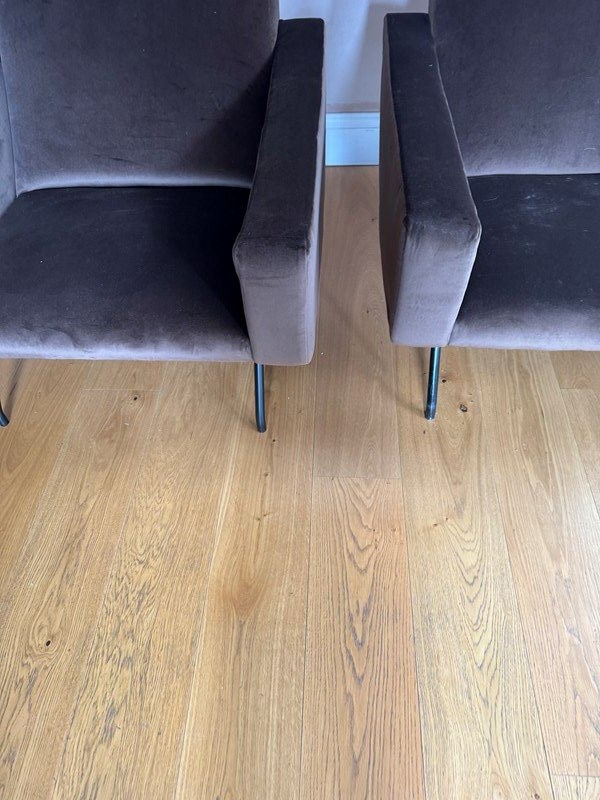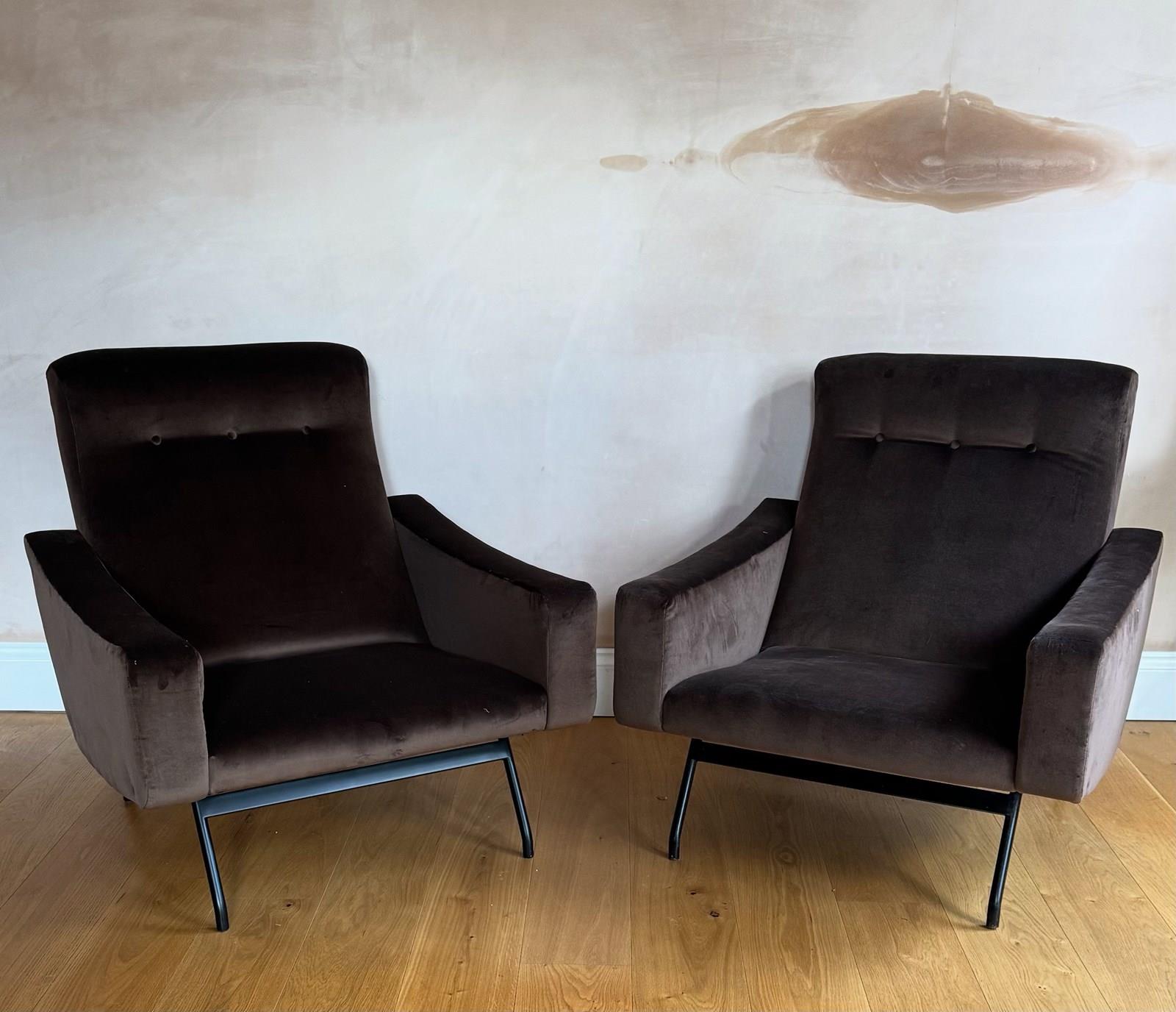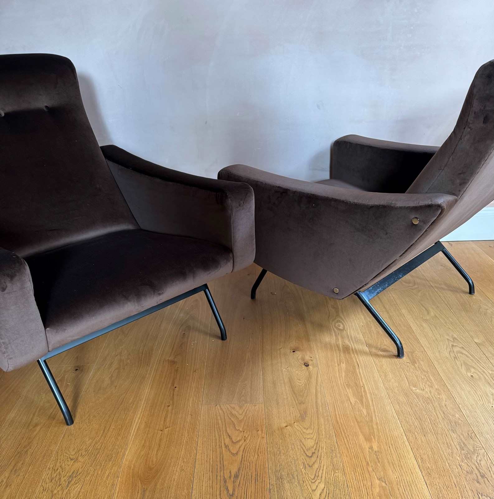 Pair of reupholstered armchairs attributed to Joseph-Andre Motte Galeon model and produced by Steiner. France c.1950’s. Stylish and comfortable with wide deep seat.