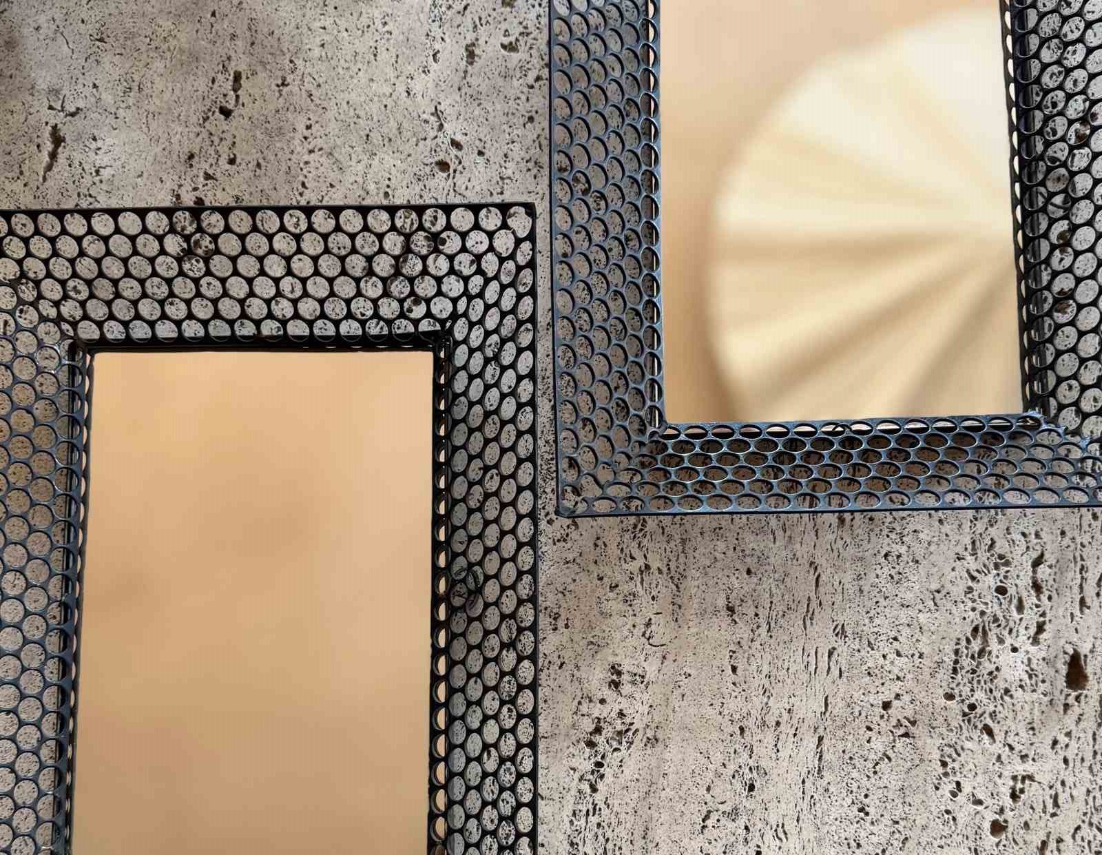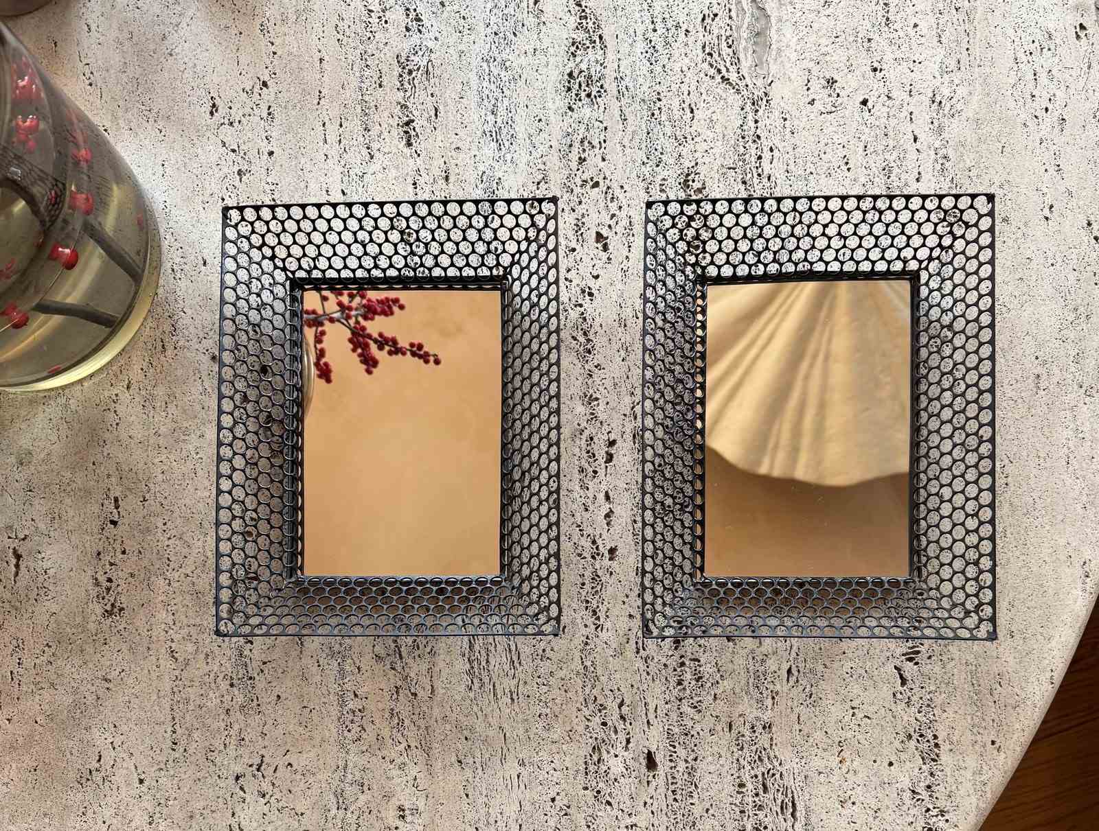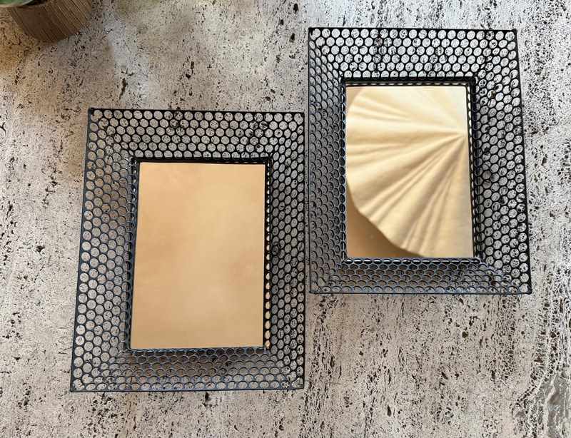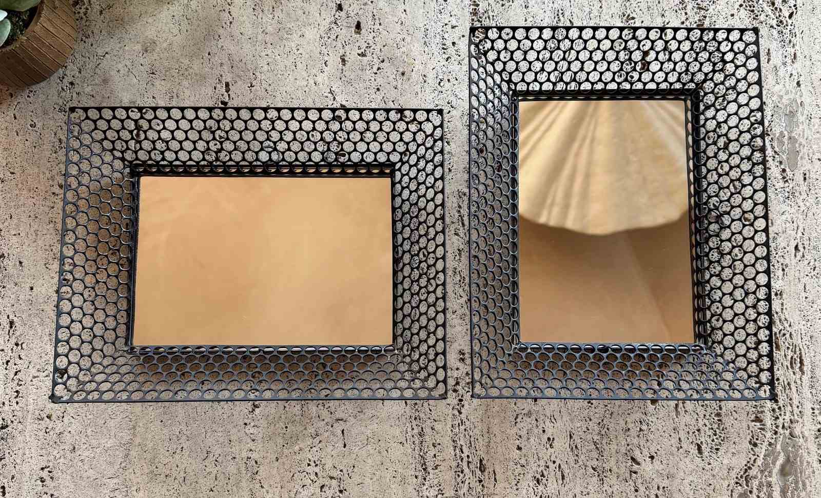 Pair of small pierced metal framed mirrors. (Mirrors replaced)