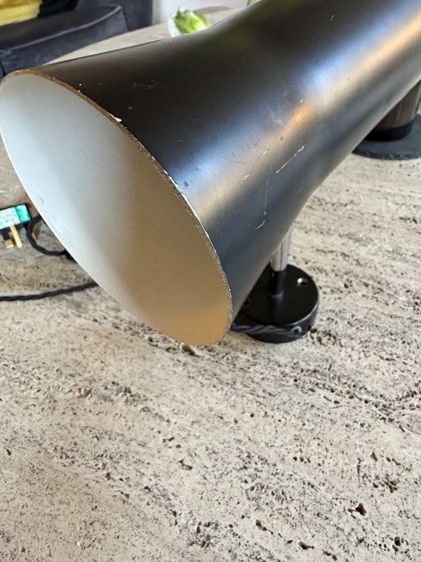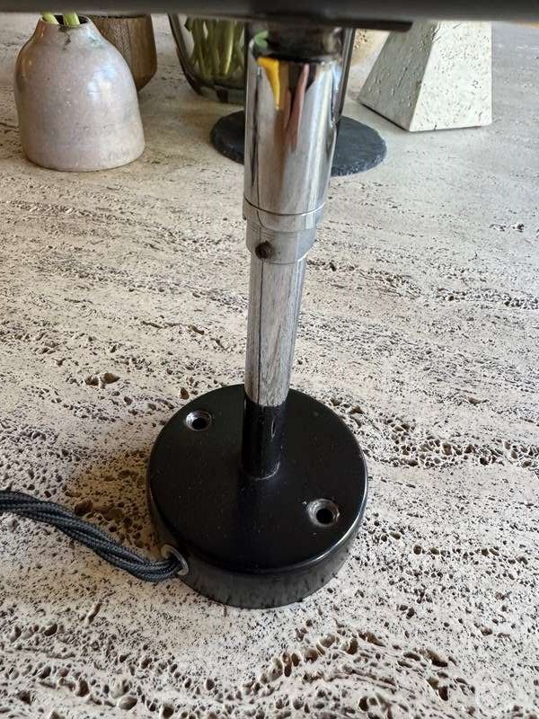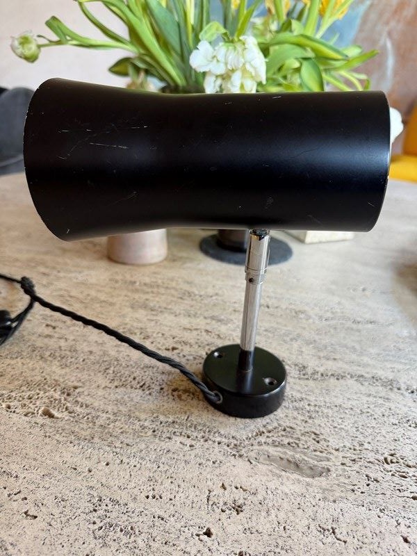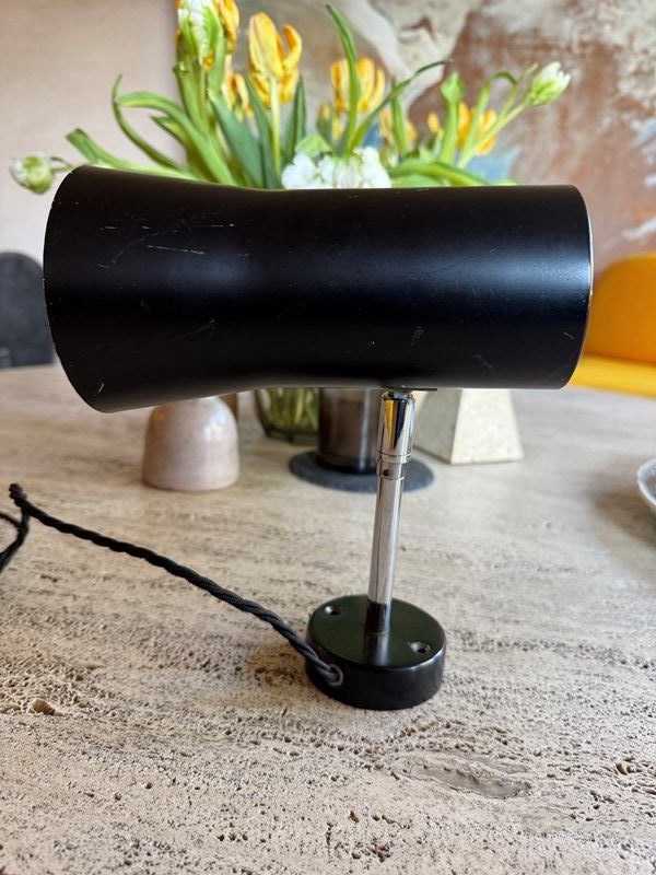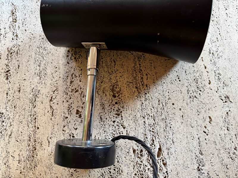 A single adjustable black metal and chrome wall light manufactured by Raak. Rewired and Pat tested.