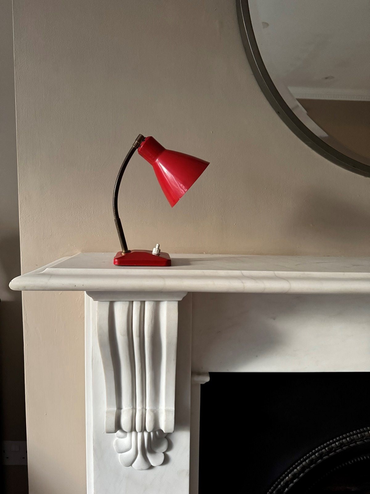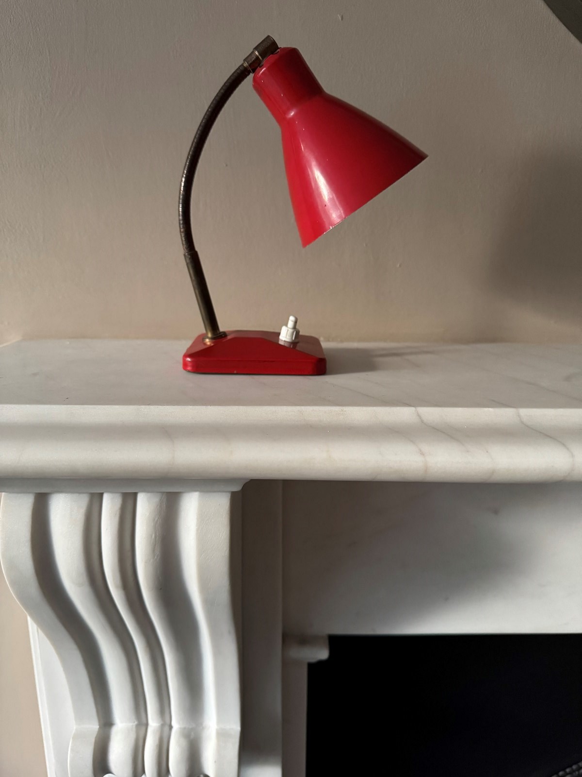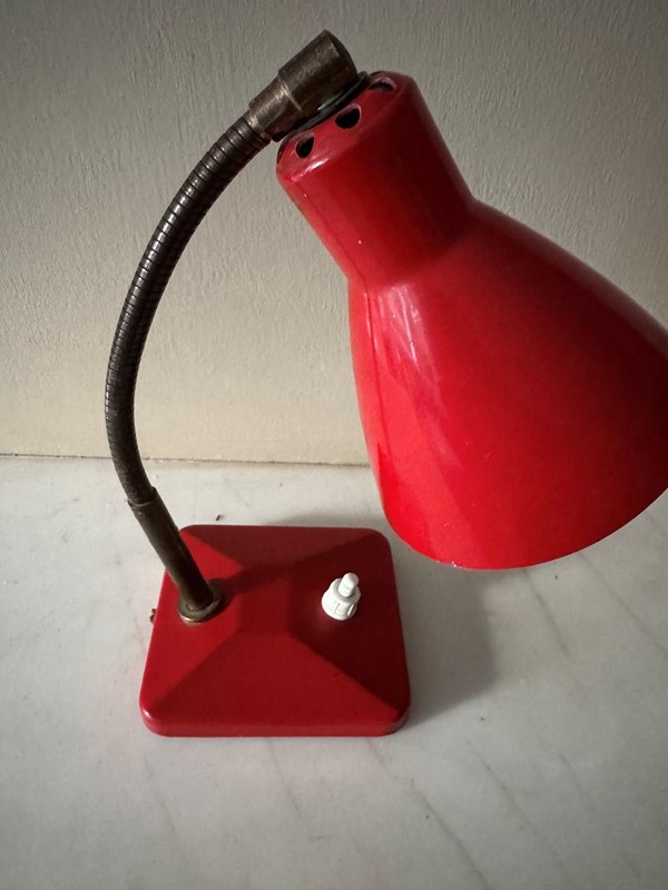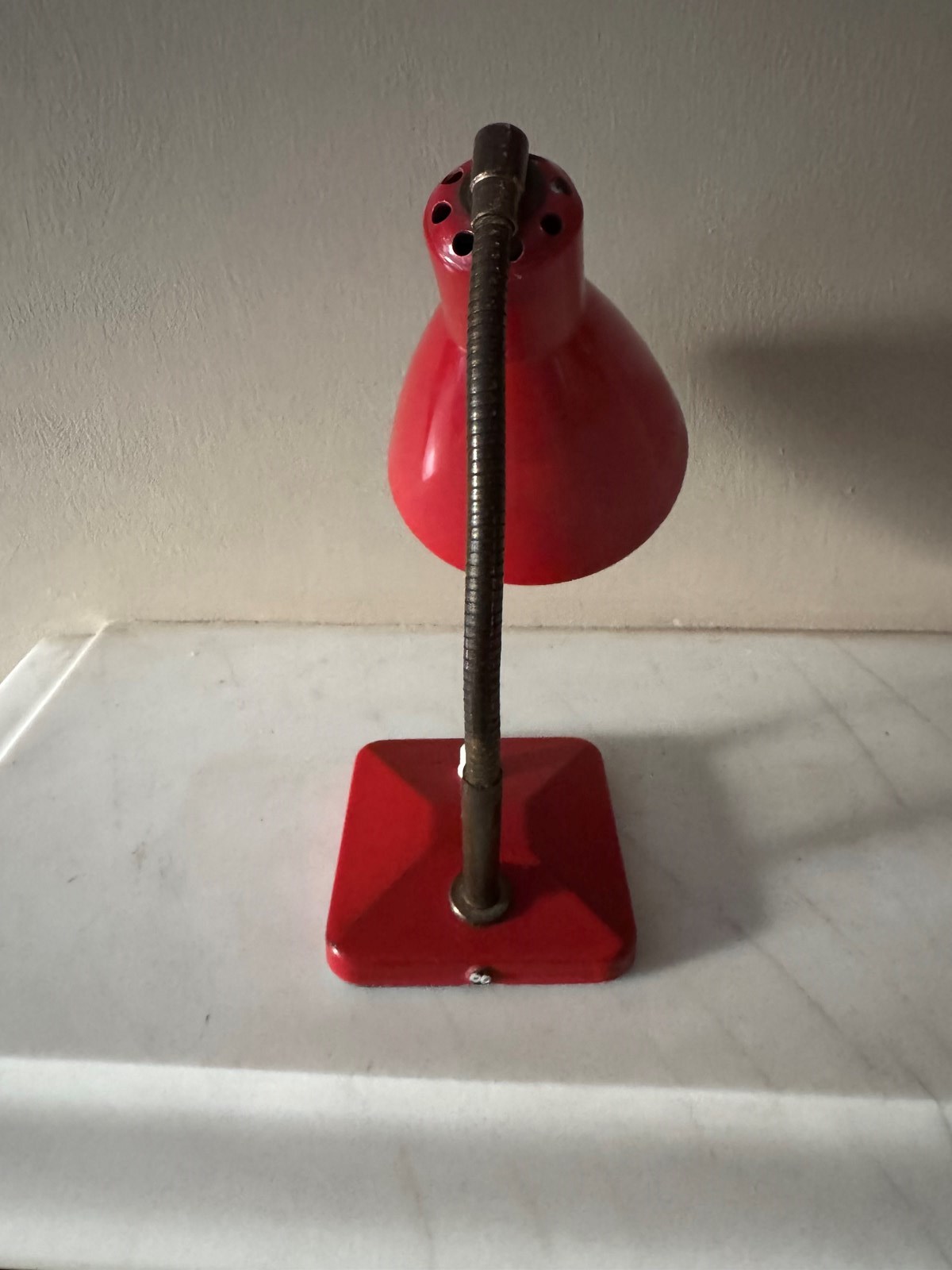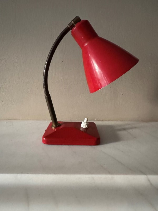 Small French red enamel adjustable cocotte desk lamp. Rewired & Pat tested.