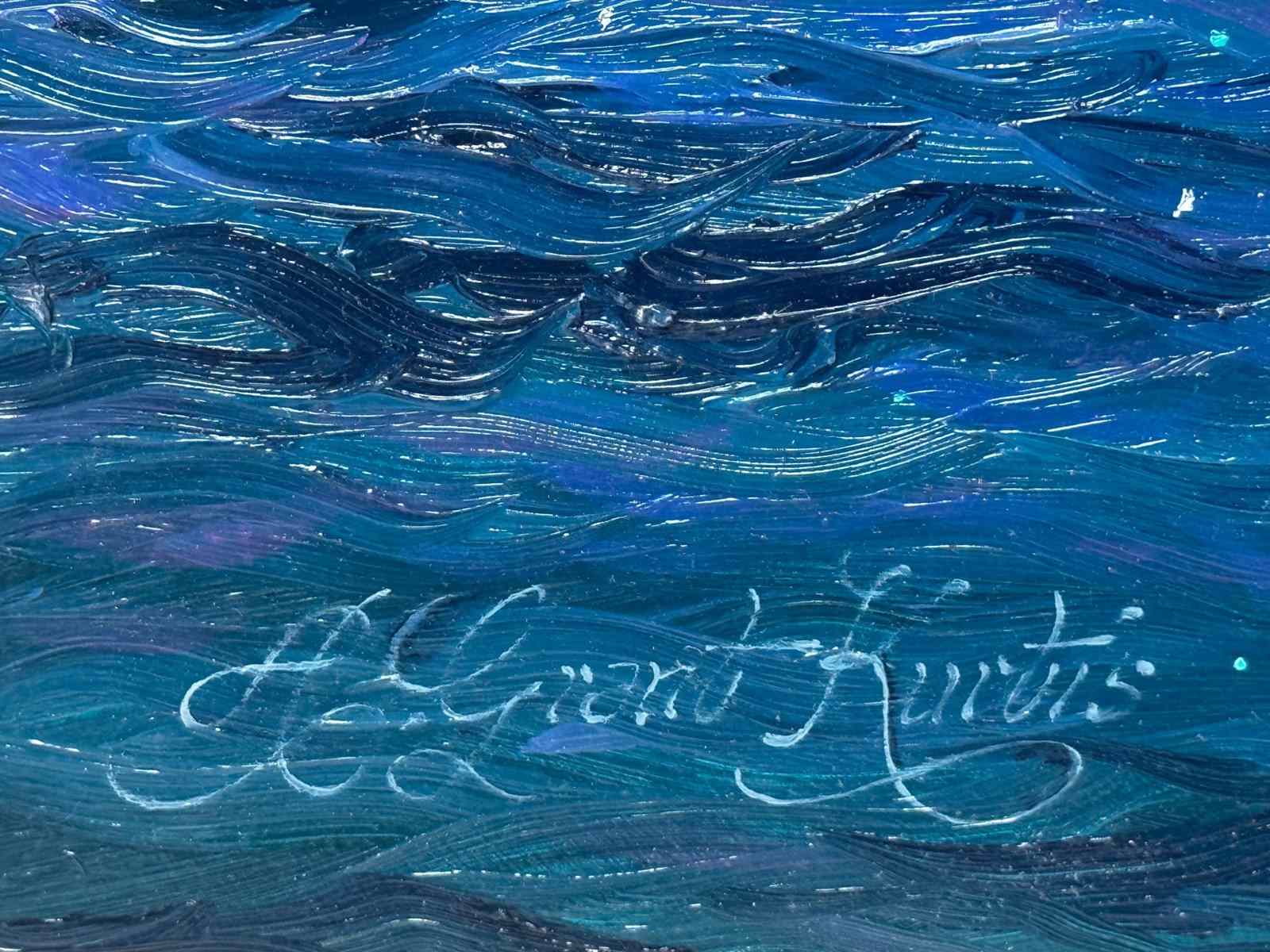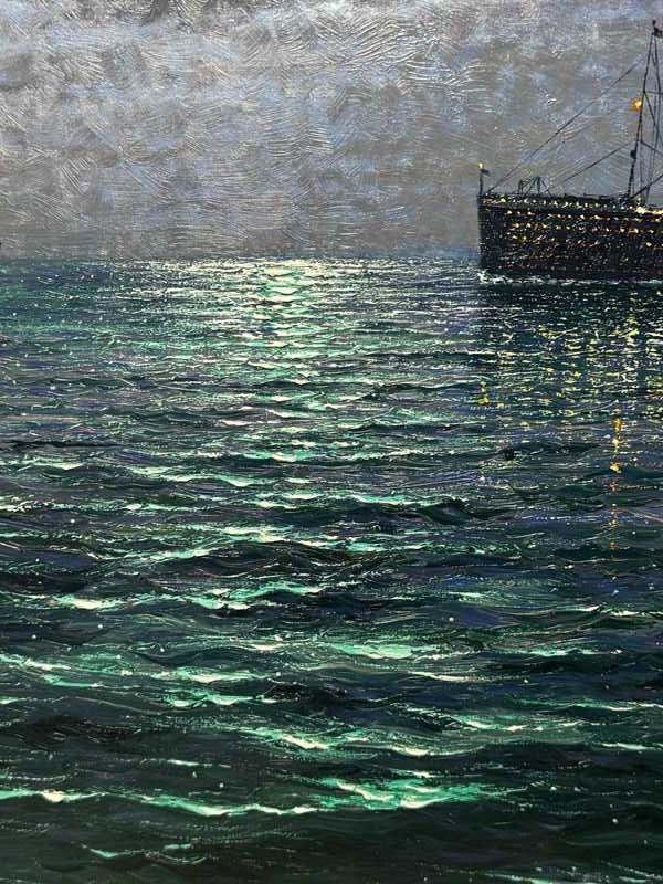 Here, the palette is confidently restrained: cool blues, smoky greys, and silvery highlights that appear to float across the water. The result has a cinematic presence while remaining classically structured—exactly what high-end collectors look for in a statement maritime nocturne.